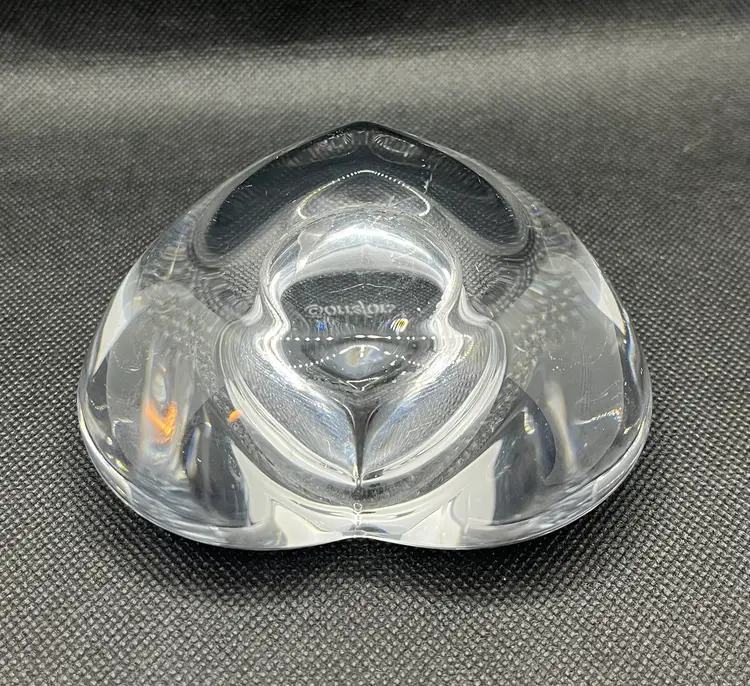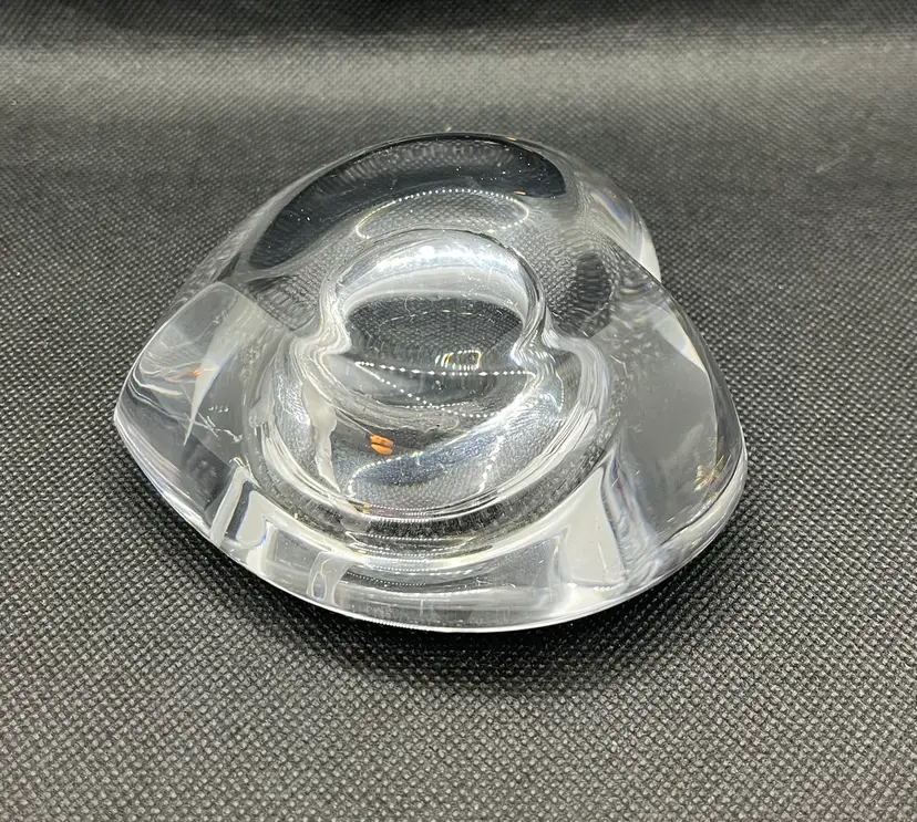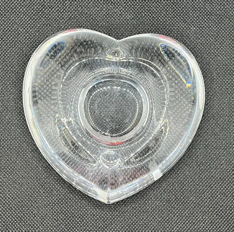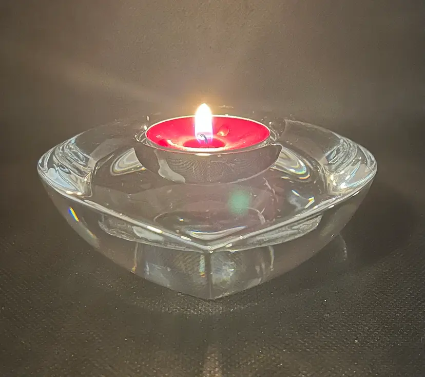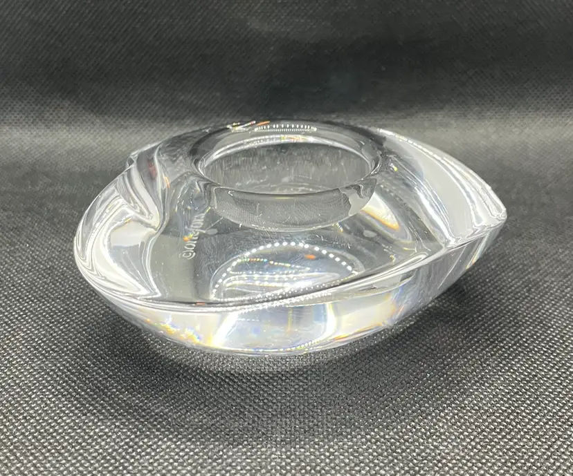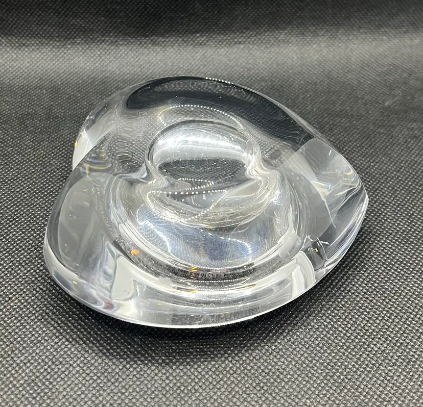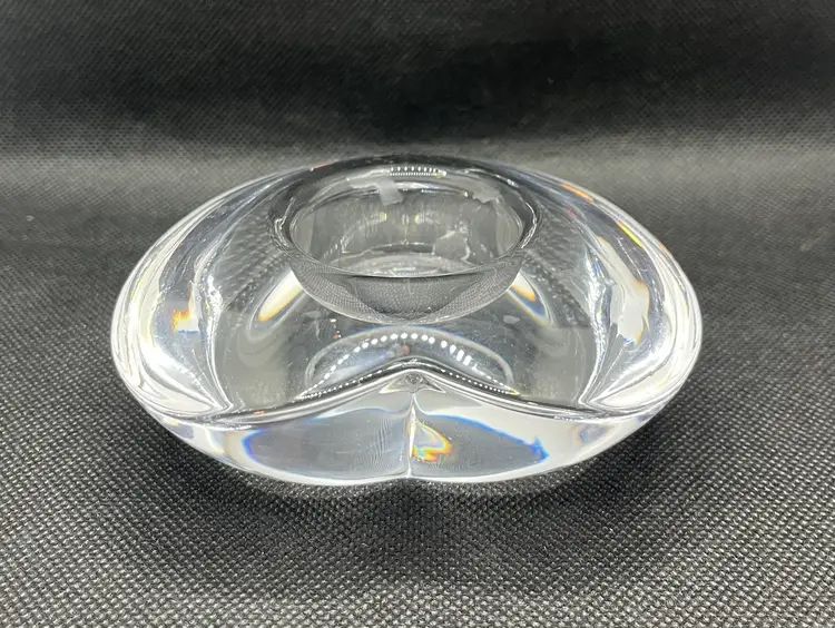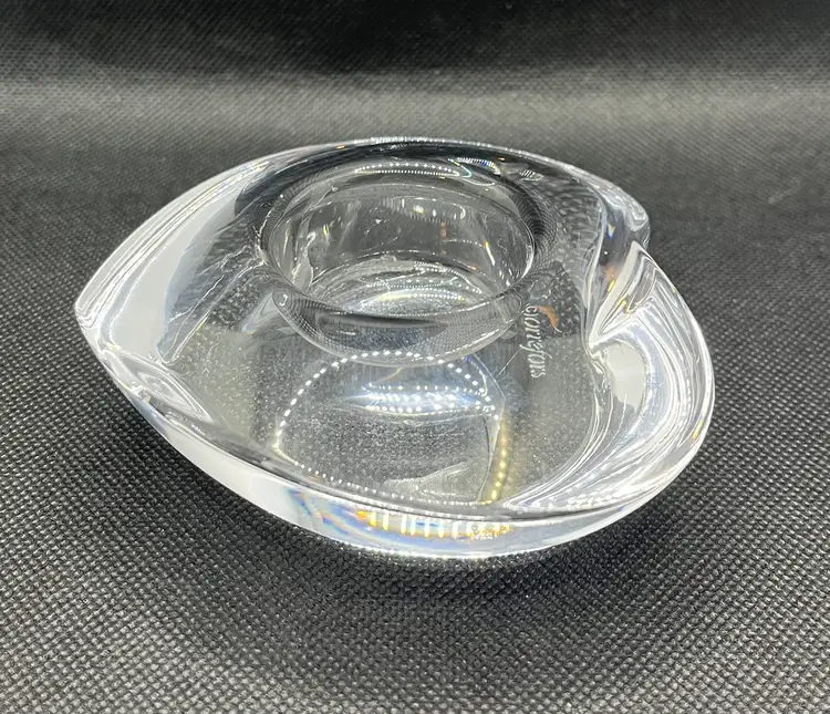 This item is an Orrefors crystal "Amour" heart-shaped votive candle holder, designed by Lars Hellsten in the 1980s.