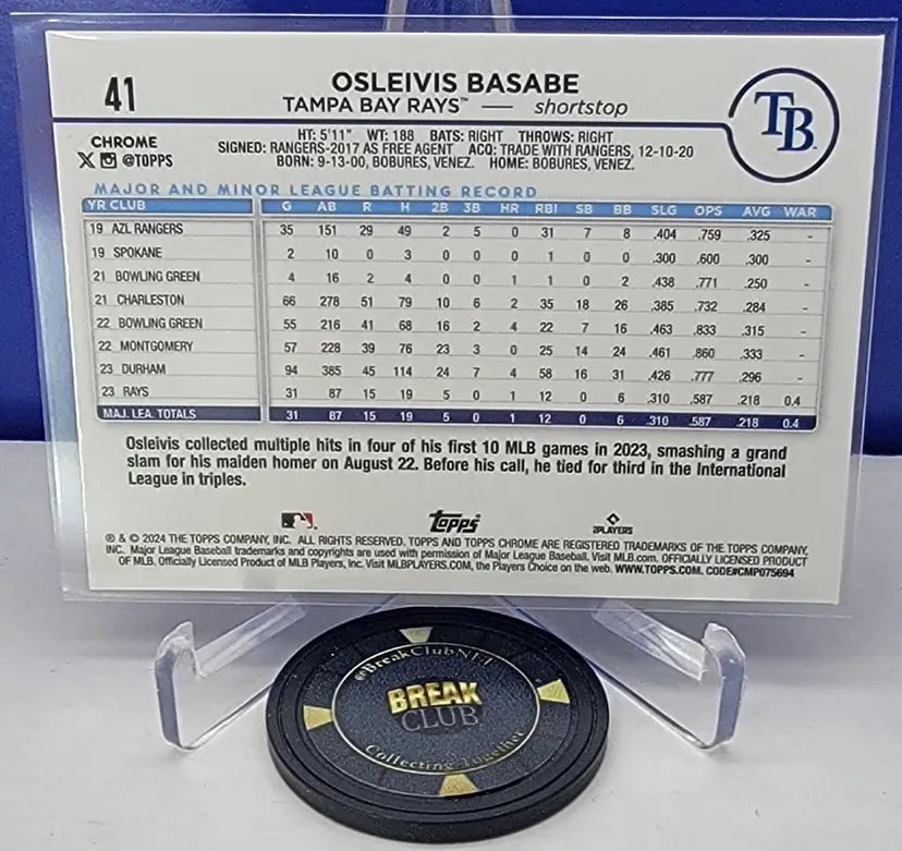 Osleivis Basabe 2024 Topps Chrome Orange RayWave Refractor /25 Rookie Tampa Bay Rays