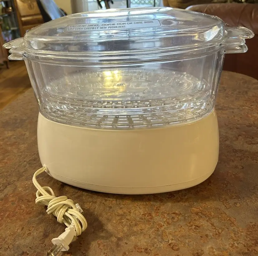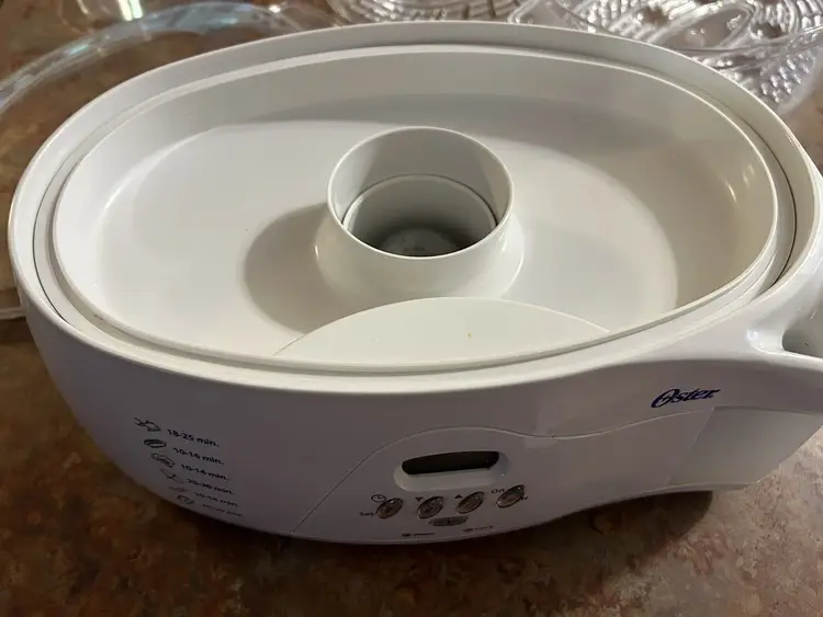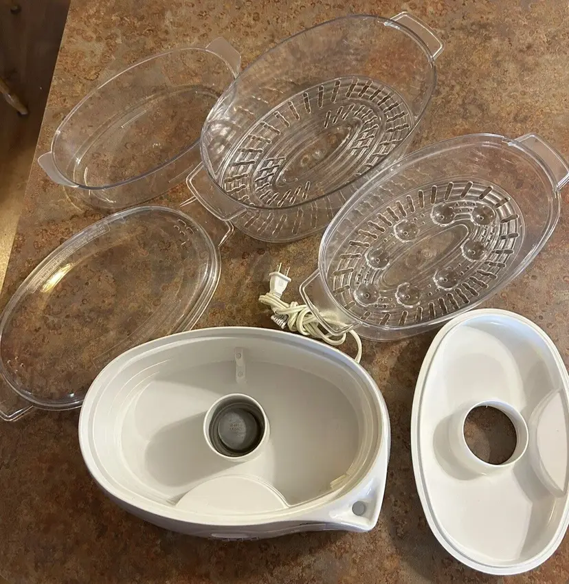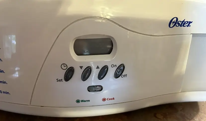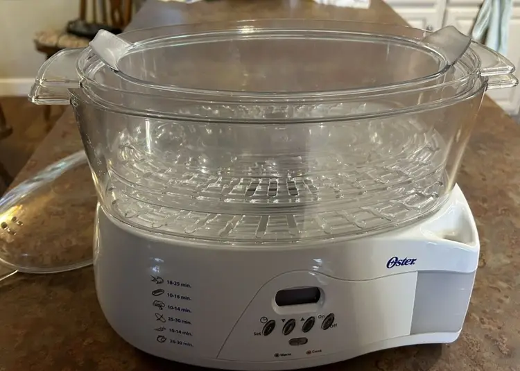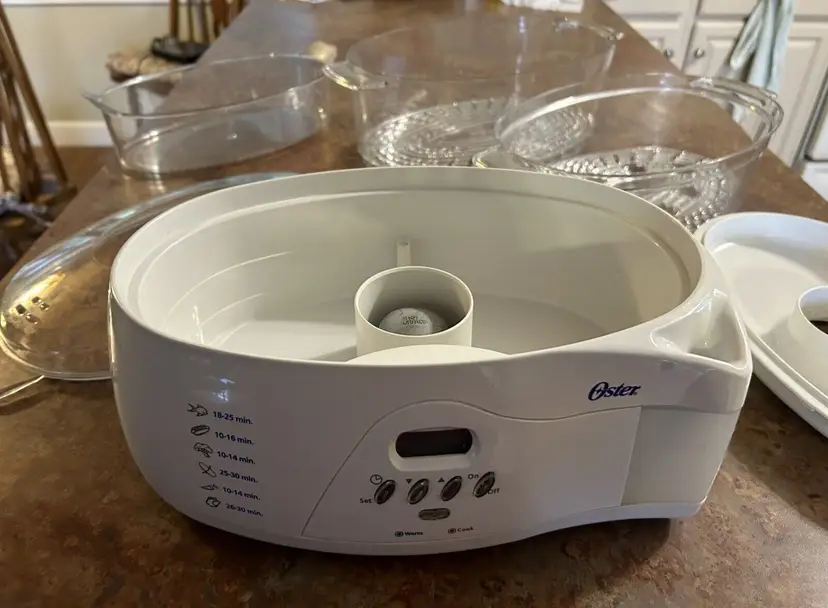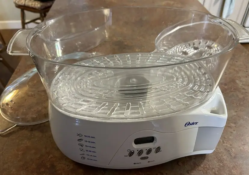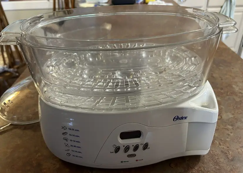 Power Source: Electric Color: White MPN: 5712 Material: Plastic Item Length: 14 in Brand: Oster Type: Electric Food Steamer Capacity: 6.1 qt Manufacturer Warranty: N/A Number of Tiers: 2 Item Height: 12.5 in Voltage: 120 V Model: Oster 5712 Features: Easy Clean, Timer, Digital Display Country/Region of Manufacture: China Item Width: 8.5 in Power: 900 W Number of Settings/Programs: 1