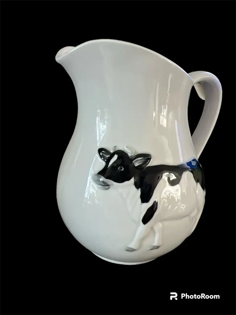 Cute little pitcher with a little cow on it. No cracks or chips, 5 inches tall 3 inches in width