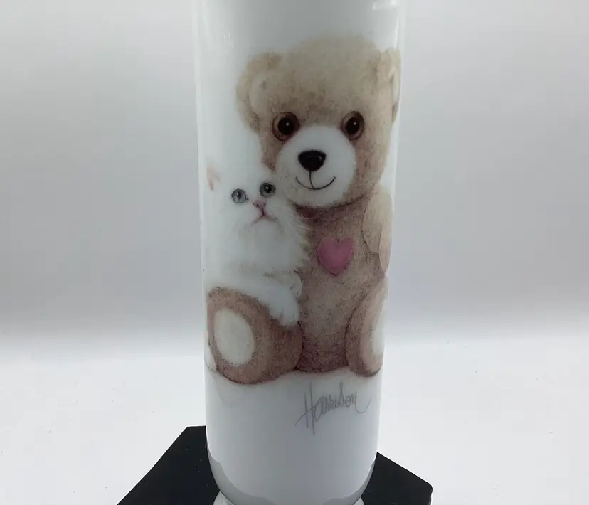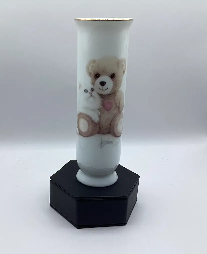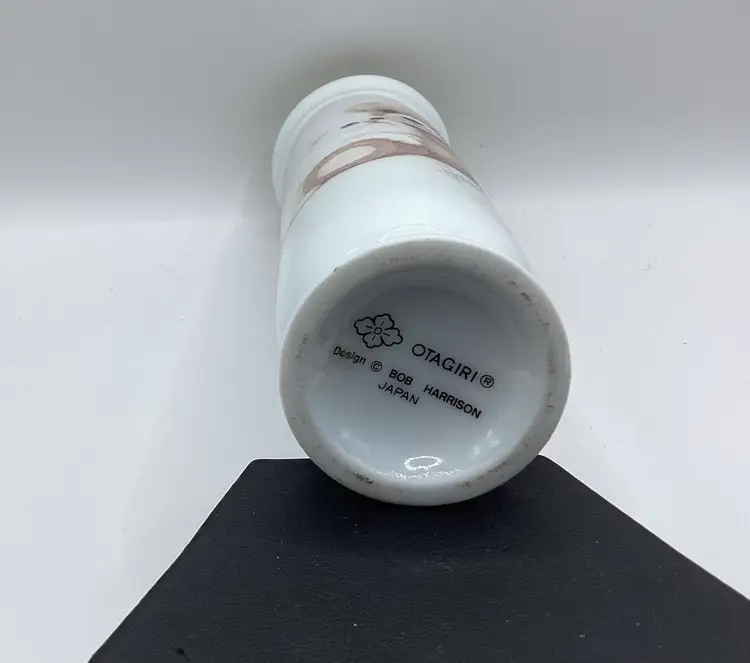 Brand: Otagiri Designed by: Bob Harrison Identifier: Stamped on bottom Features: Gold tone trim rim / Cat snuggling a Teddy Bear Material: Porcelain Color: White Measurements: Height - 6 & 1/2” Width - 2”