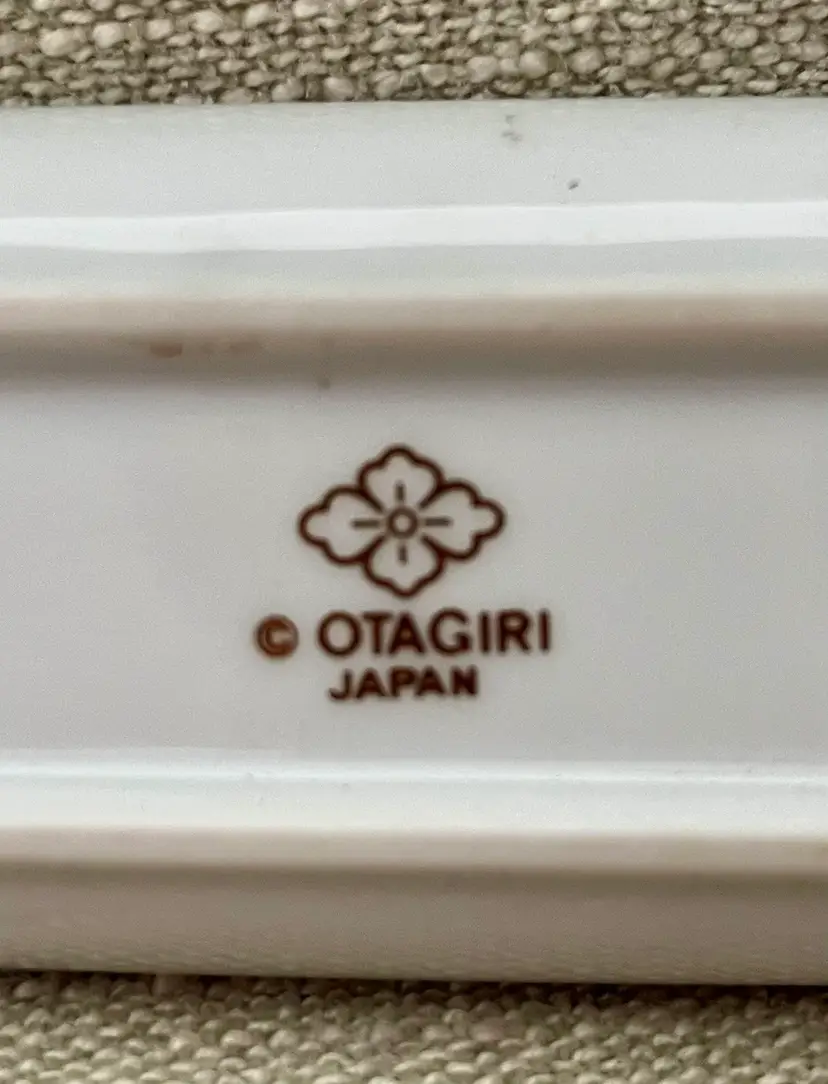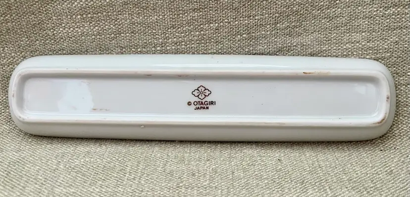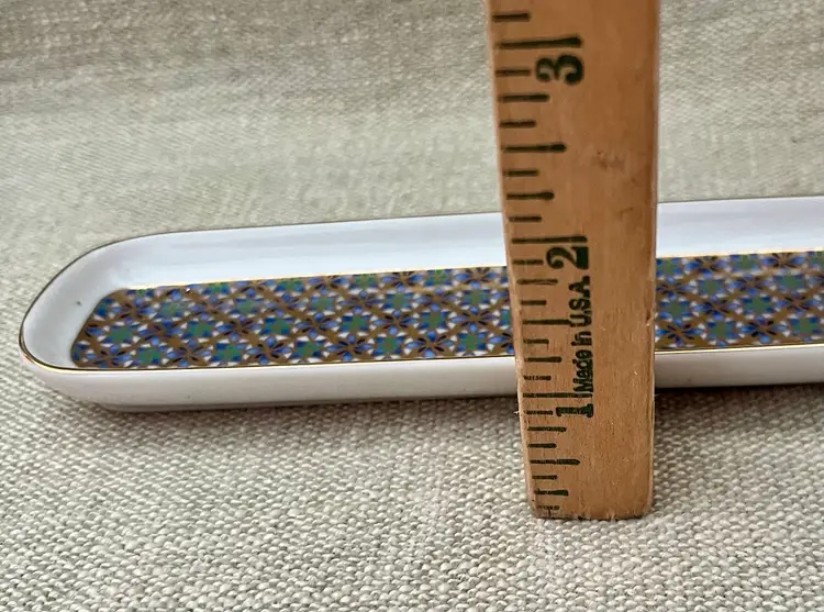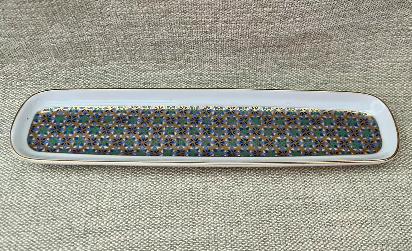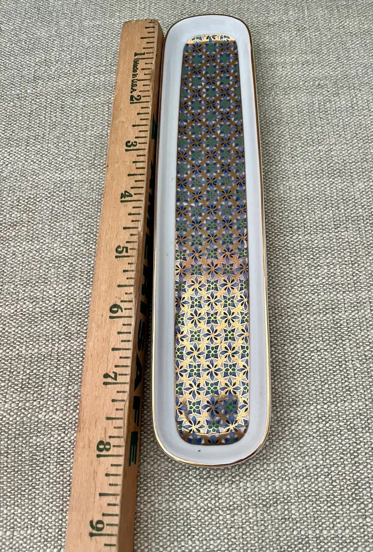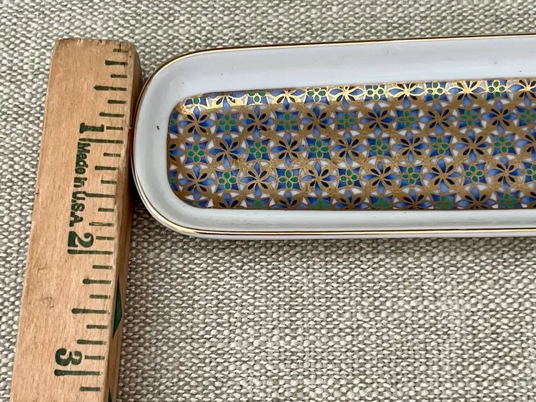 Vintage Otagiri, Japan Porcelain Office Desk Letter Opener Tray Blue Green Gold Repeating Pinwheel Pattern.