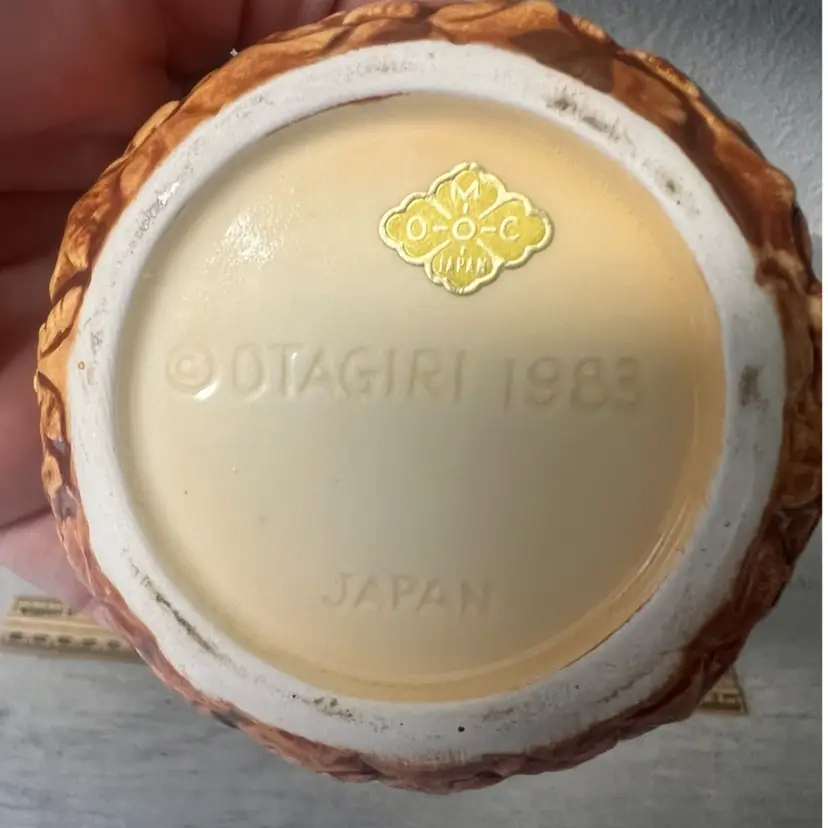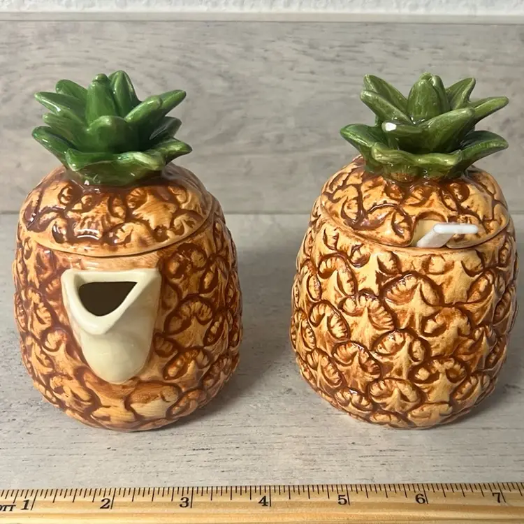 4.5” tall & 3” wide Great vintage condition. Sugar bowl has small glaze chip on the tip of one frond.