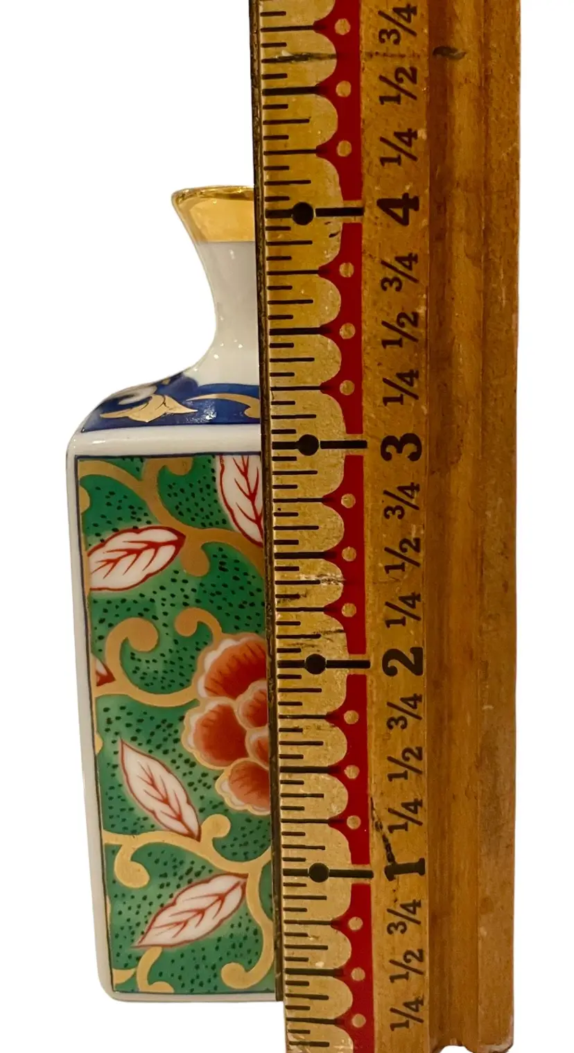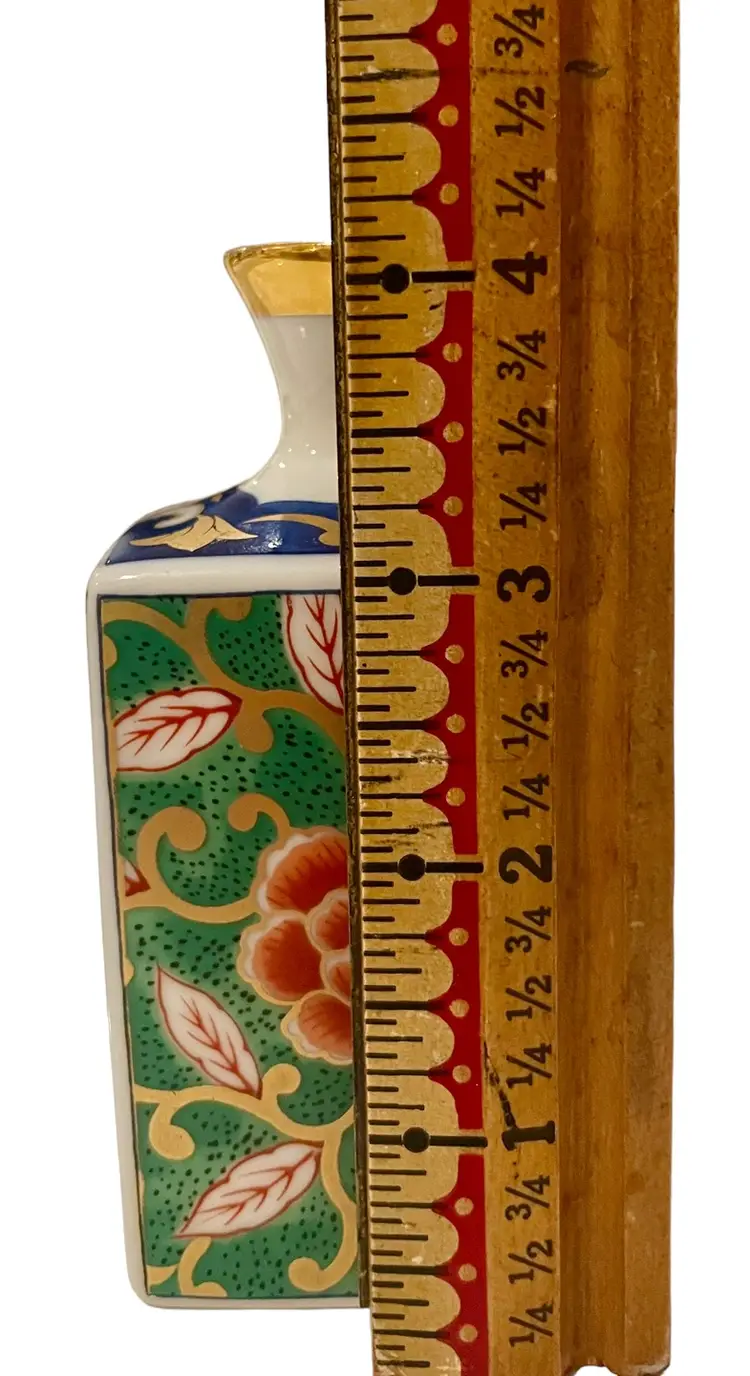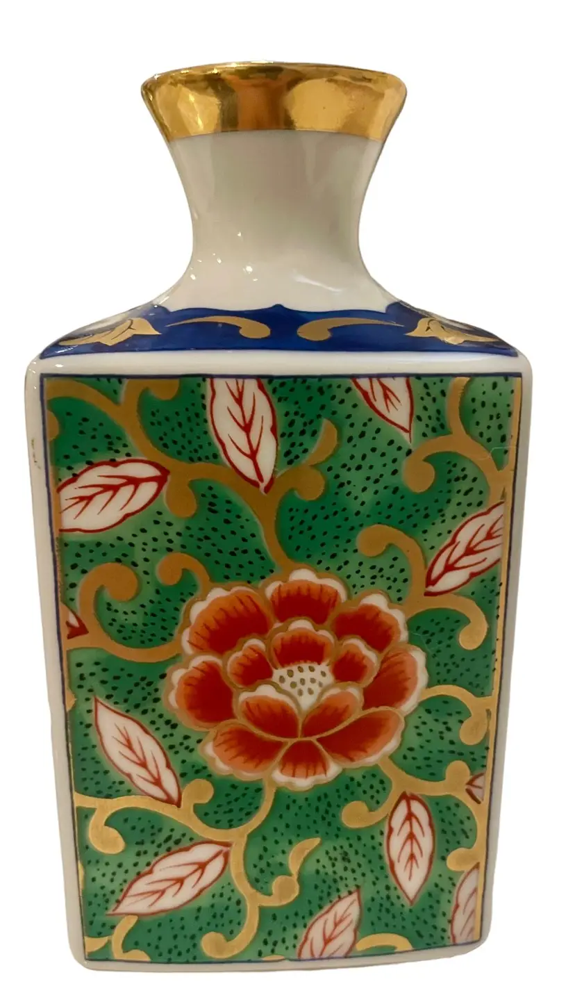 This Japanese vase is crafted by Otagiri and made of porcelain bone china. It is 4” tall, 2” long, 1 3/4” wide and weighs 5 oz. It features a beautiful multi-colored enamel and gilt design, making it a perfect addition to any collection. The vase is a vintage original from Japan.