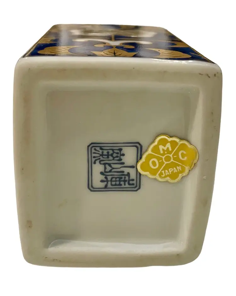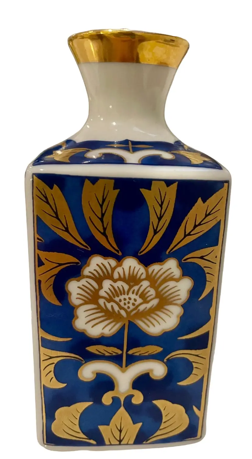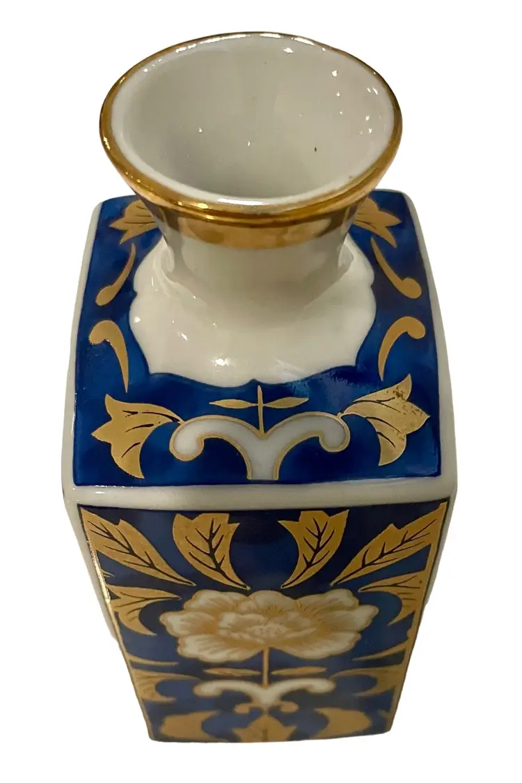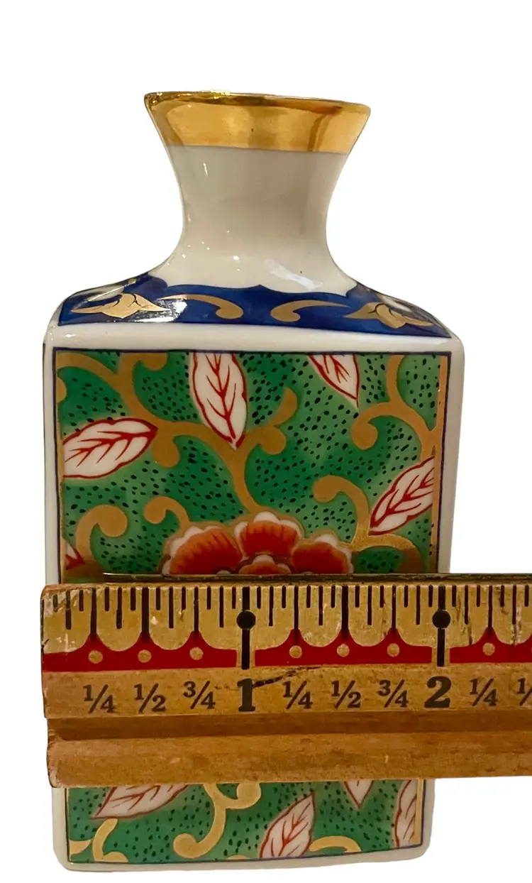 This Japanese vase is crafted by Otagiri and made of porcelain bone china. It is 4” tall, 2” long, 1 3/4” wide and weighs 5 oz. It features a beautiful multi-colored enamel and gilt design, making it a perfect addition to any collection. The vase is a vintage original from Japan.