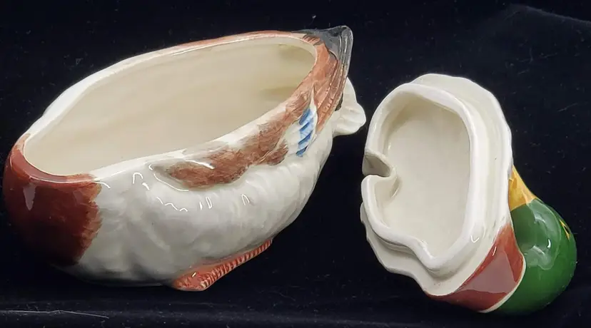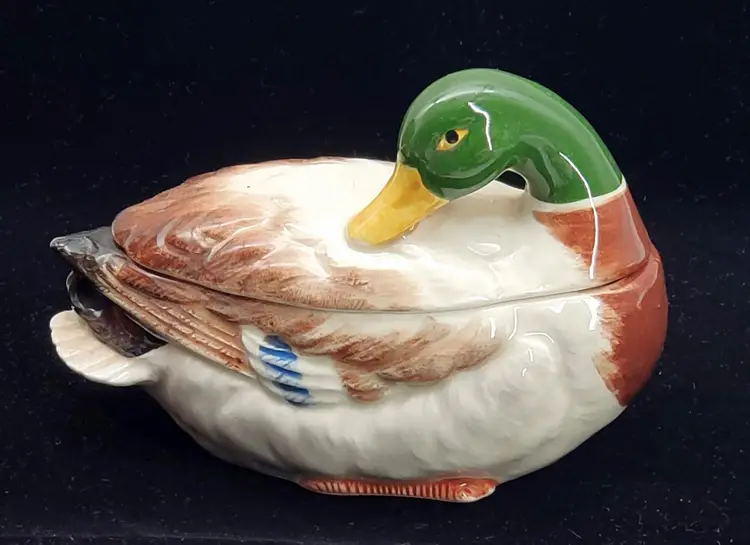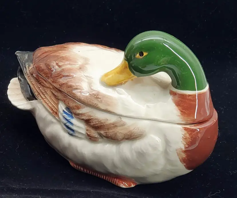 This hand painted Otagiri mallard duck sugar bowl is sure to be a conversation starter at dinner! This handsome guy is looking coyly over his shoulder, ready to grace your table!