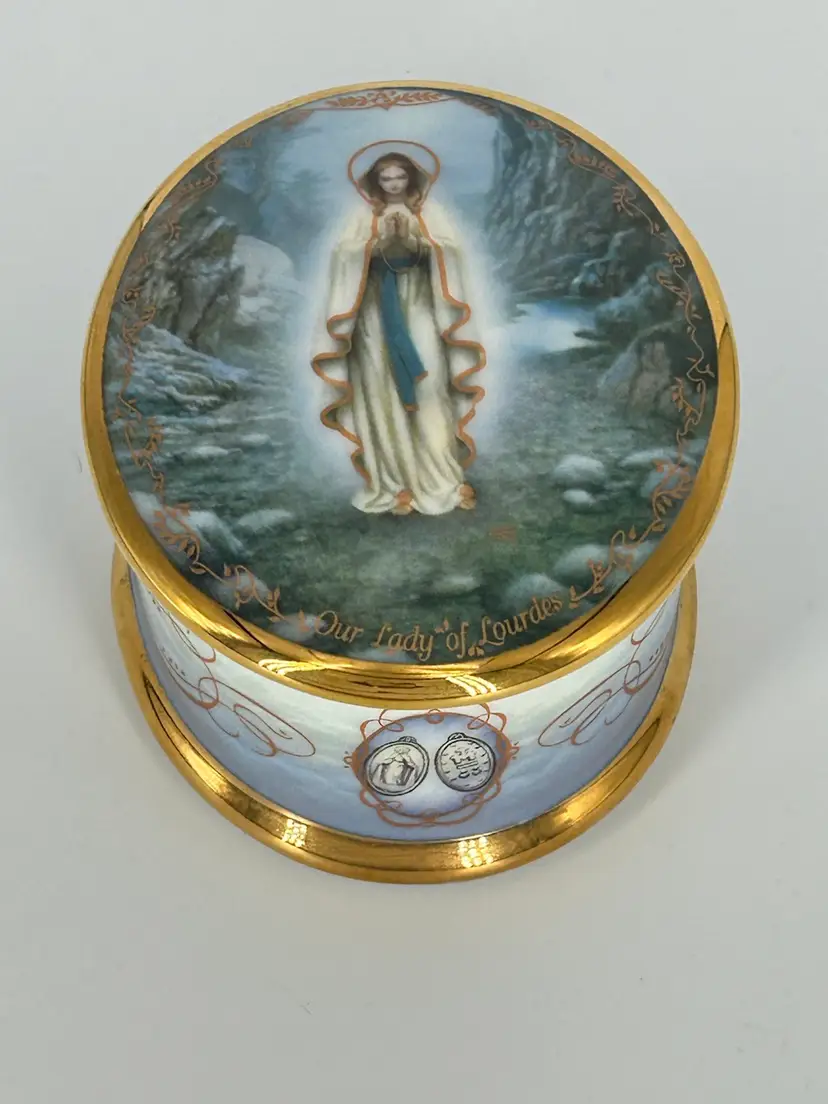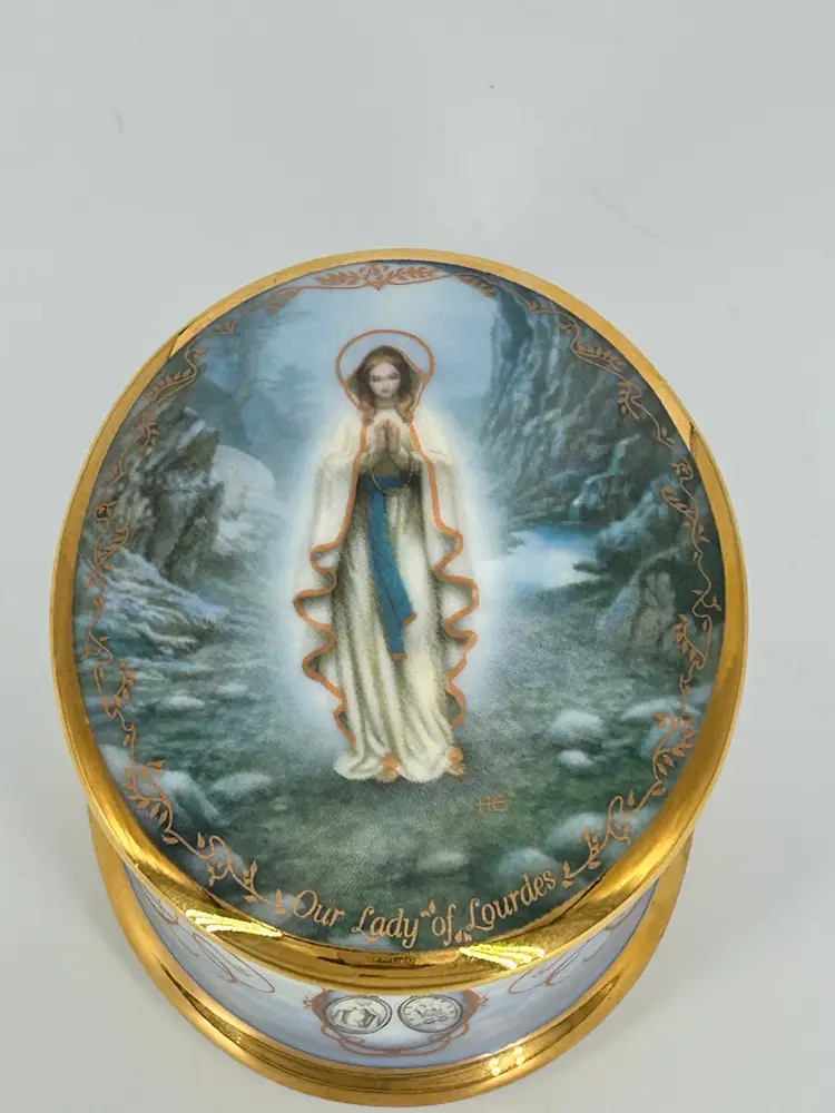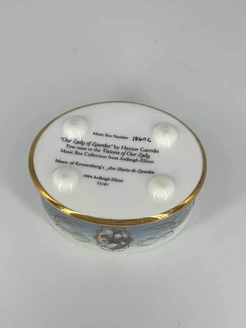 Capture the serenity and grace of the Visions of Our Lady of Lourdes with this exquisite Ardleigh-Elliott music box! This 1994 first edition collectible features the original artwork by Hector Garrido, bringing a touch of spiritual beauty to any space.