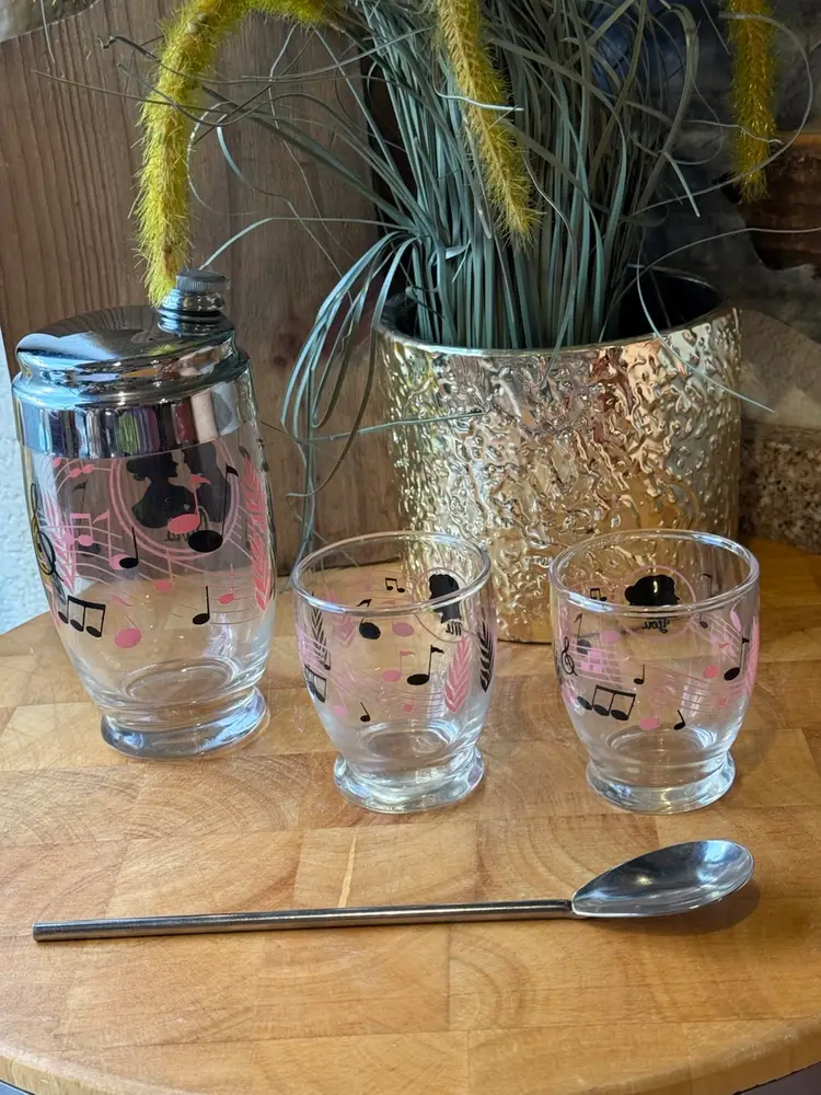 This vintage cocktail shaker set carries a love song that never quite fades… complete with three matching glasses, a built-in strainer lid, and its original stir spoon— ready to mix memories as easily as drinks.