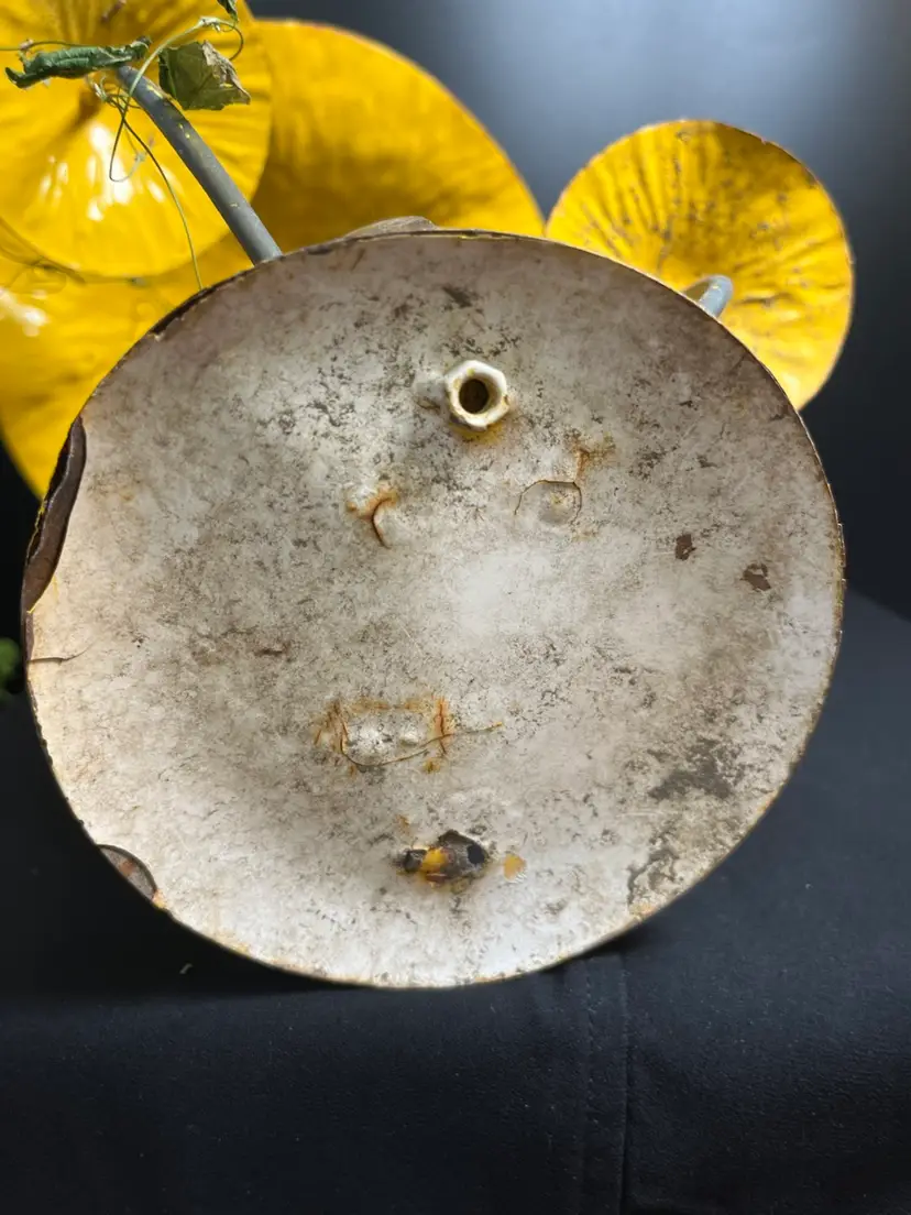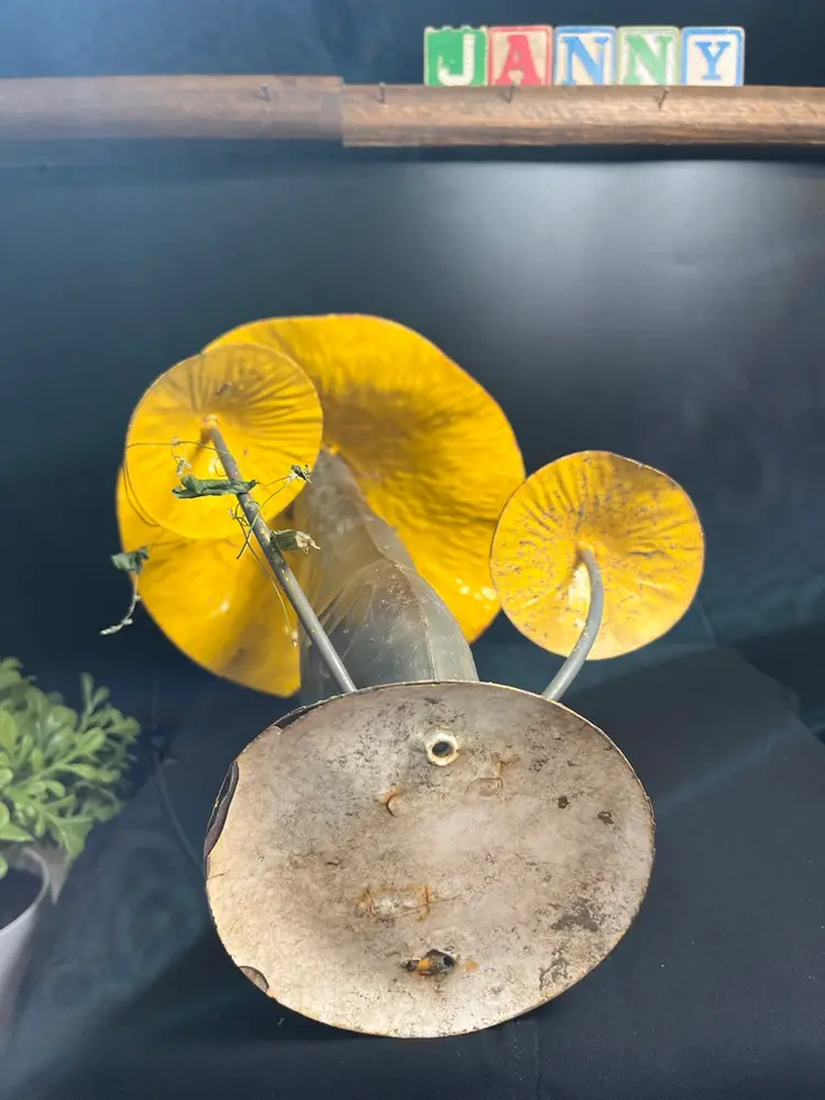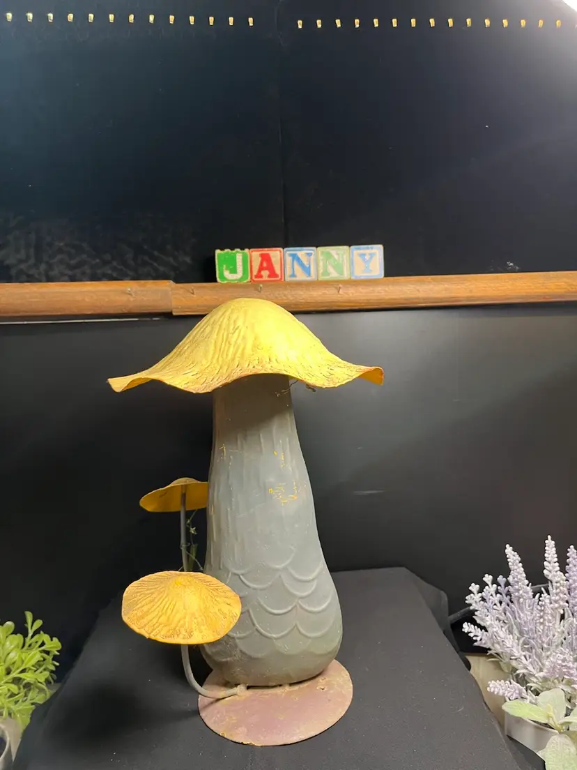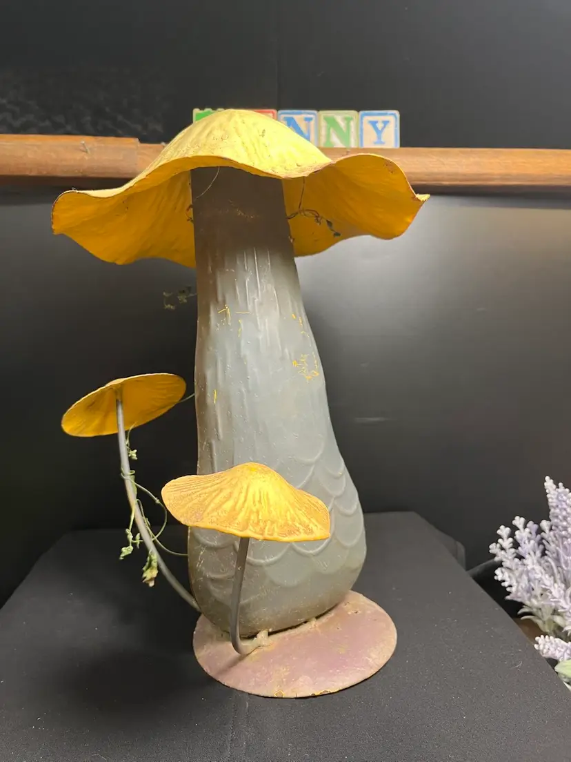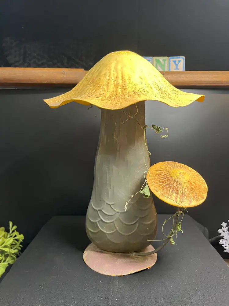 This has obviously been used as a garden or lawn ornament. Some paint chipping beneath large mushroom top. Remnants of summers past comes with, for free! Cute as can be. Measures approx 11.5"H, 8"W & 8" Deep, 1 Lb 4 Oz