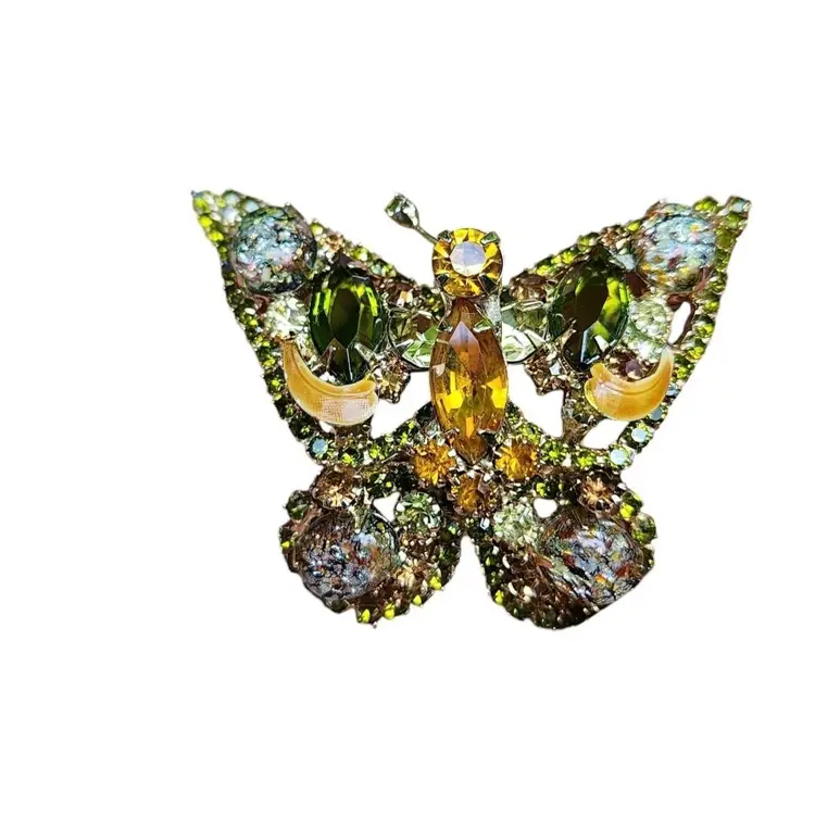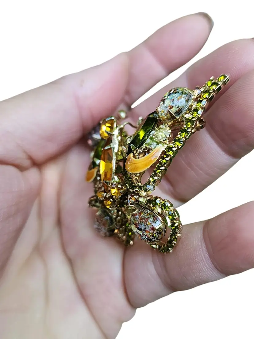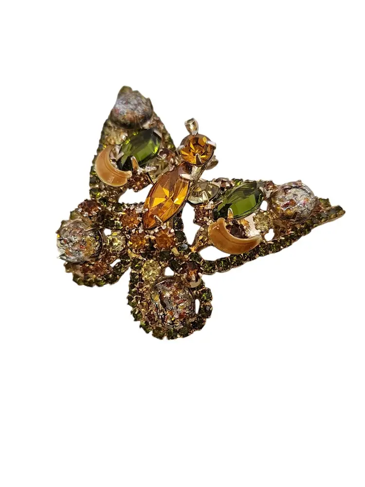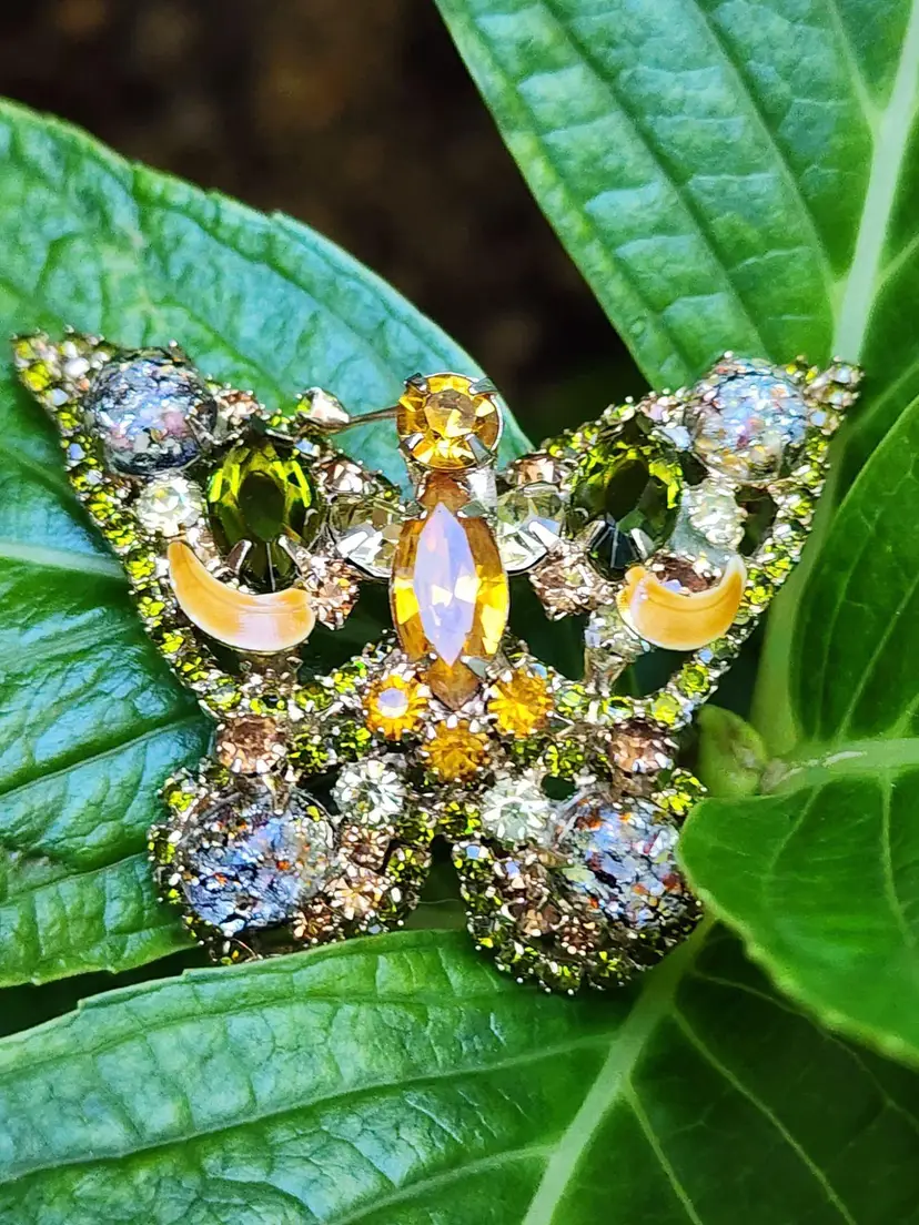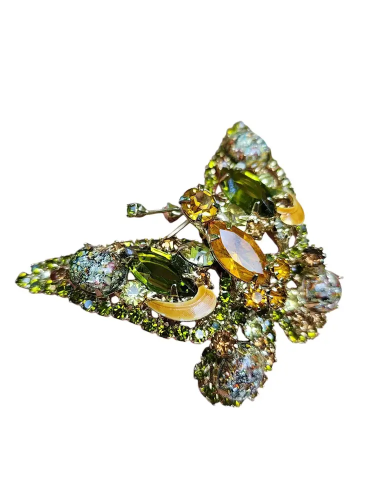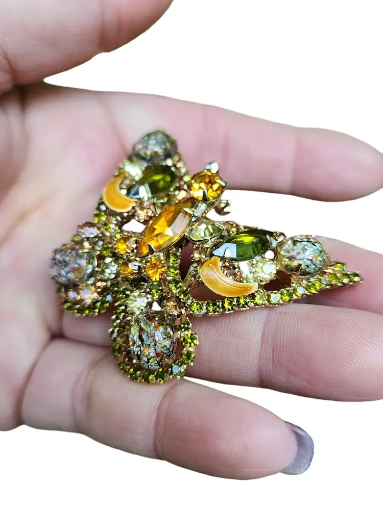Size: Wingspan is 2.25" by almost 2" long. Color: Green, Yellow Condition: Very good vintage Signed: None Details: This verified Alice Caviness is a showstopper! Curved construction, beautiful stones, with enameling, and firey confetti-style glass cabachons. There is one up now at $316, also unnamed.