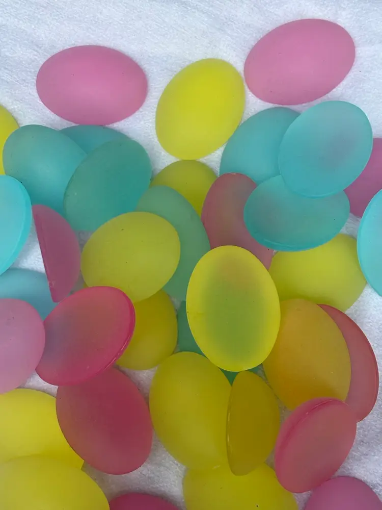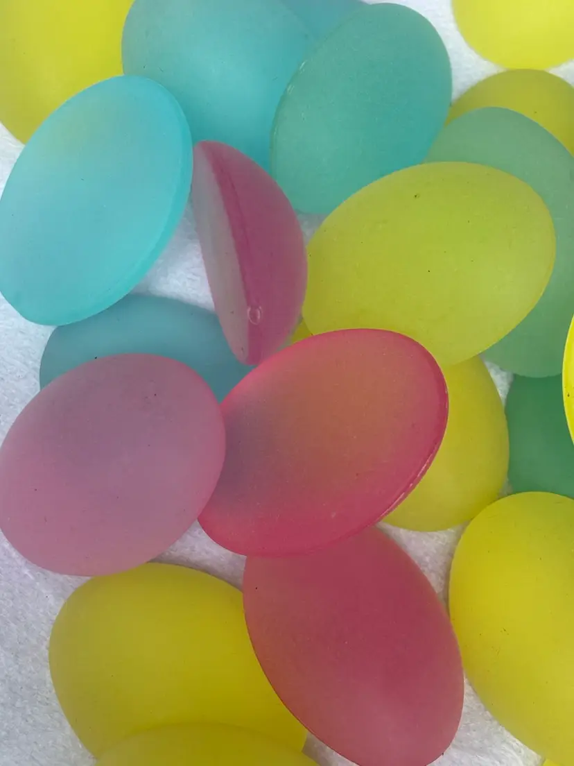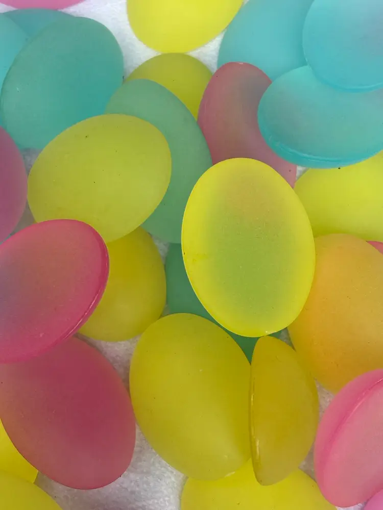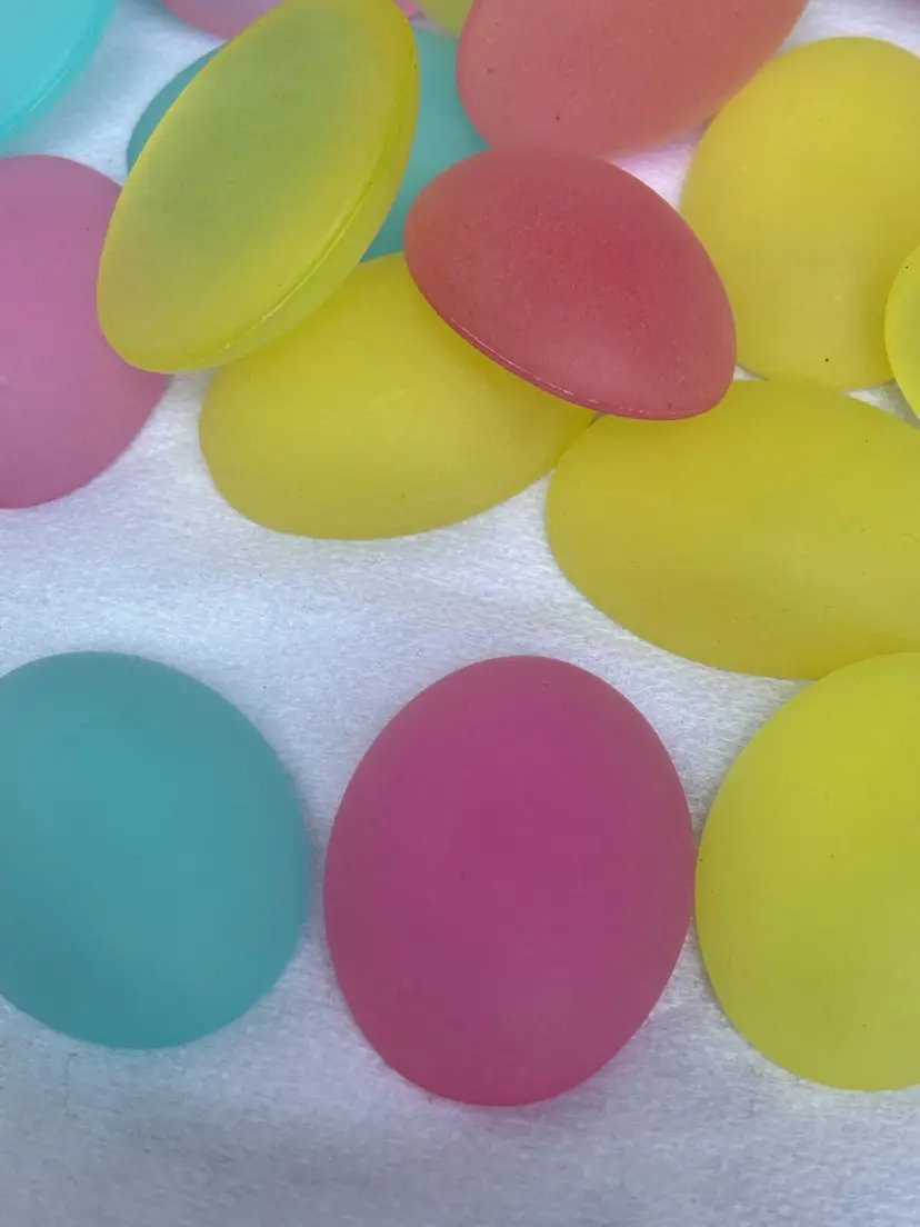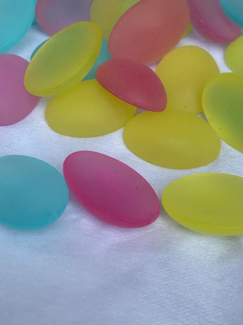 Oval Cabochons Lucite Frosted Domes. Flat back assorted pastel colors Baby Blue, Cotton Candy Pink, Pale Yellow 1.5. Bag of 10 pieces.