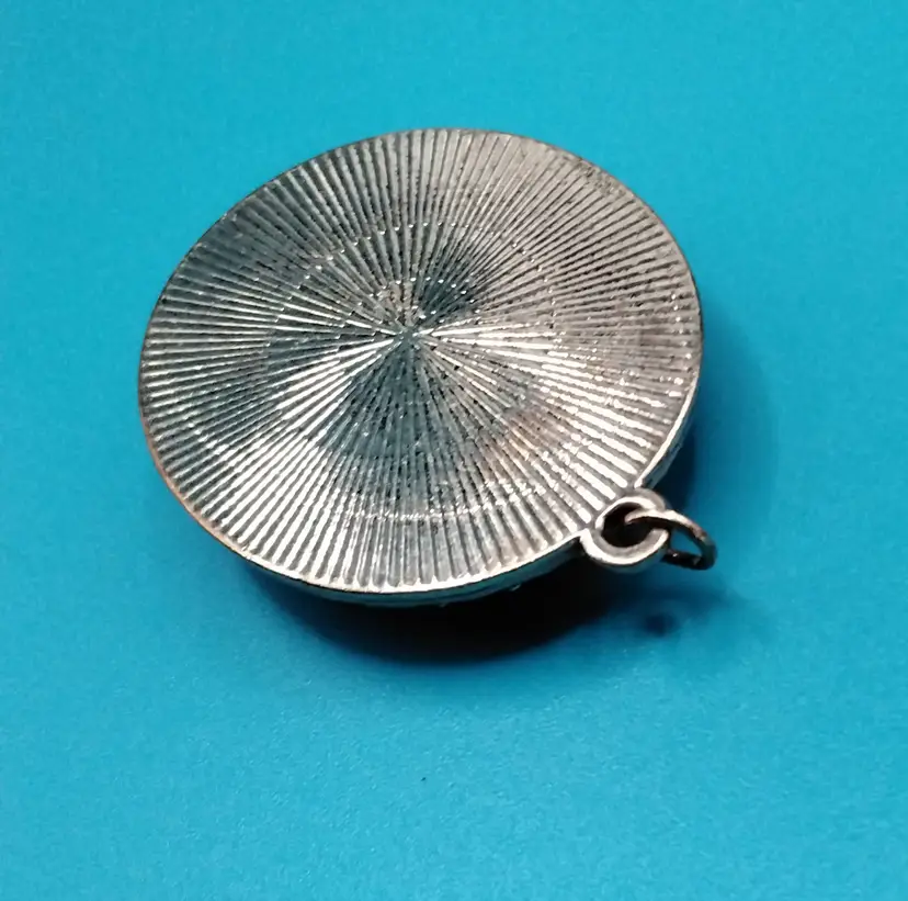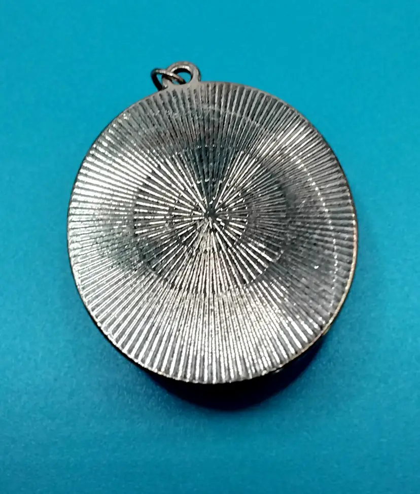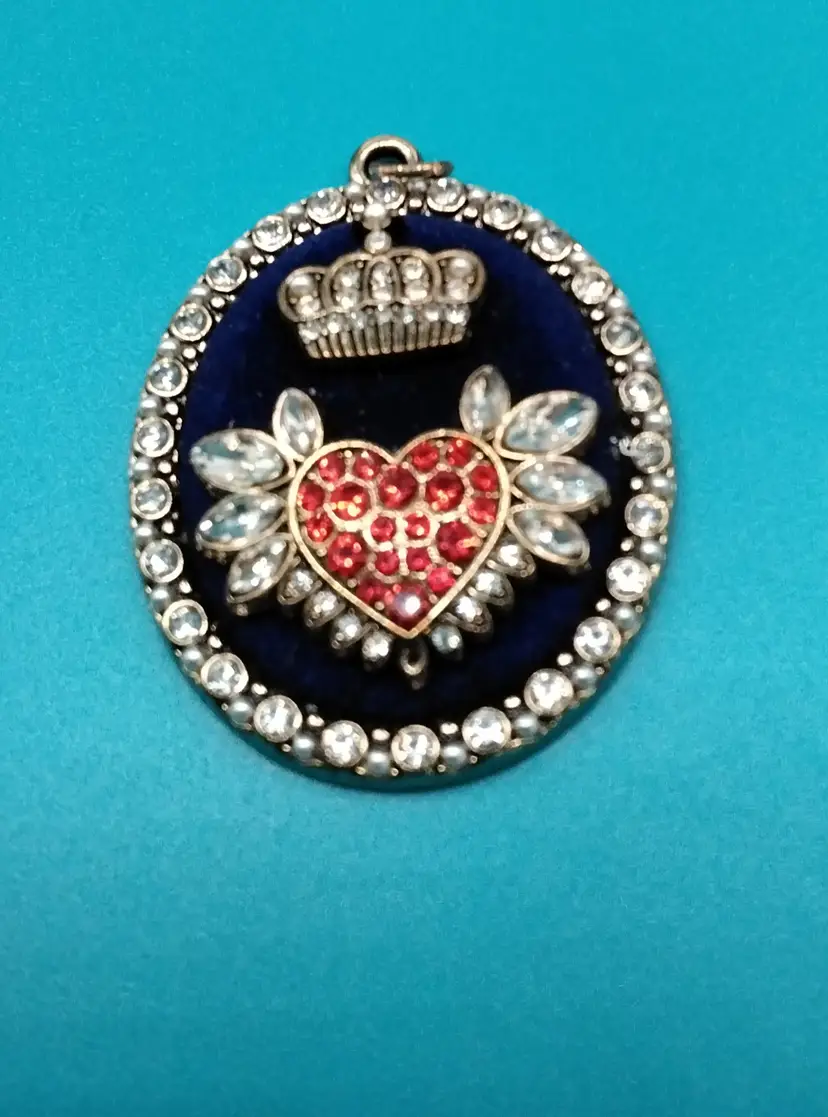 Oval Pendent w/Red Heart and Crown. No Chain included. It has red and clear Rhinestones and is gold toned on back. Sold by Metal Gallery. Has a ring on top for adding a chain. Pendent has a velvety blue back ground. It is 1.9 inches long and 1.4 inches wide. Pendent is in good condition. Photos are part of the description.