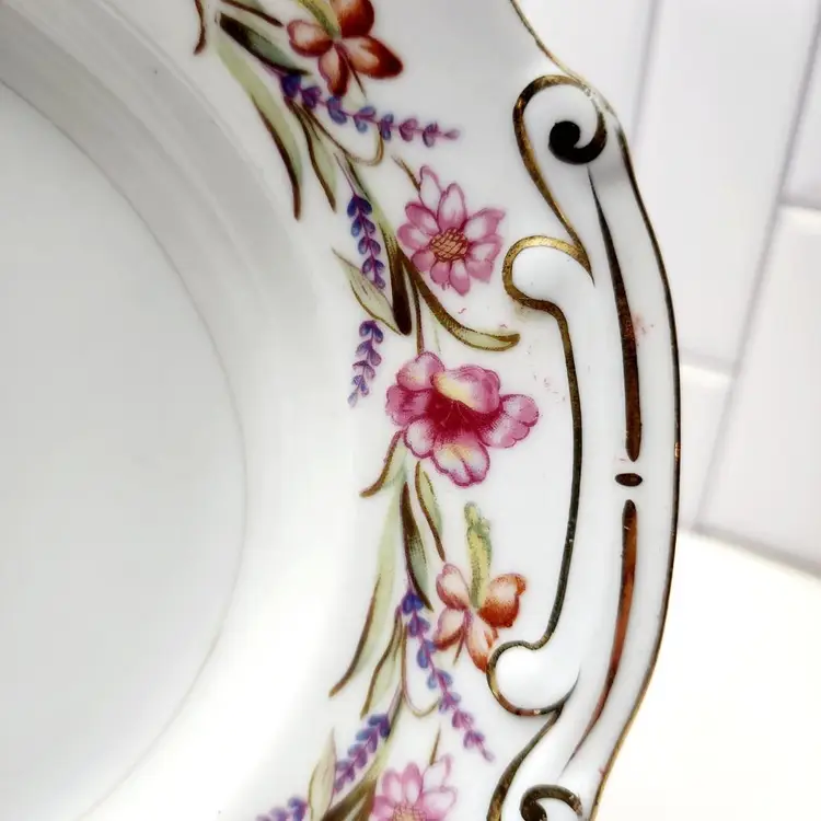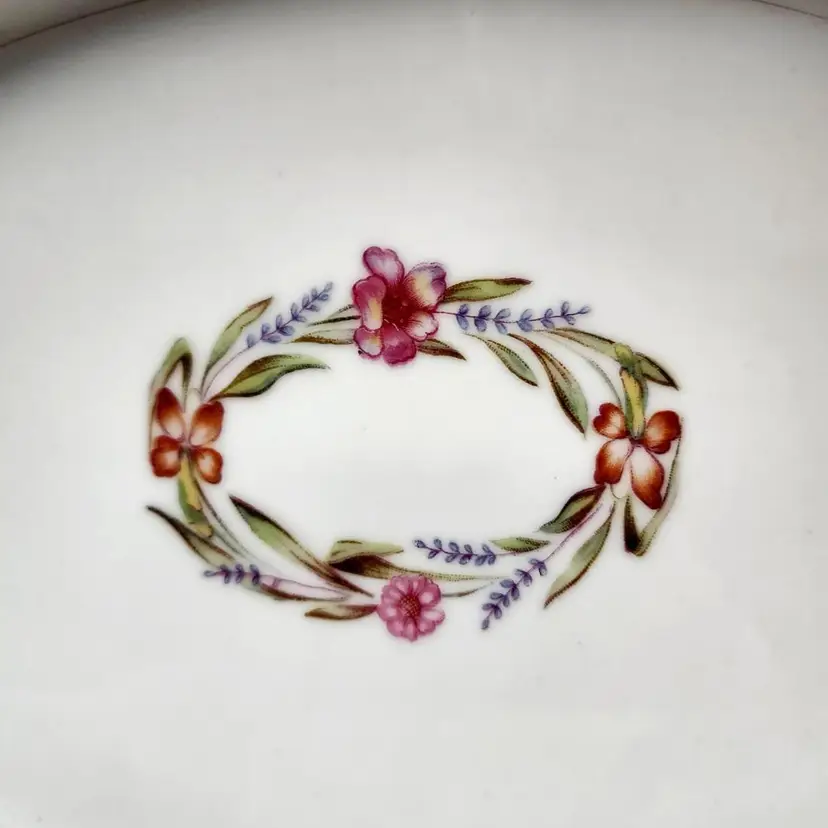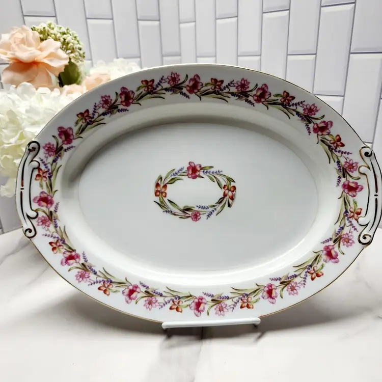 Vintage 12" Oval Serving Platter. Decorated with Ring Of Pink Flowers & Purple On Rim & Center. Gold Trim & Scroll work on "handles". The History! Made in Occuppied Japan!