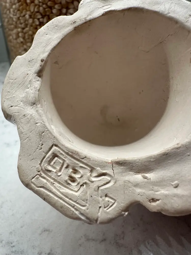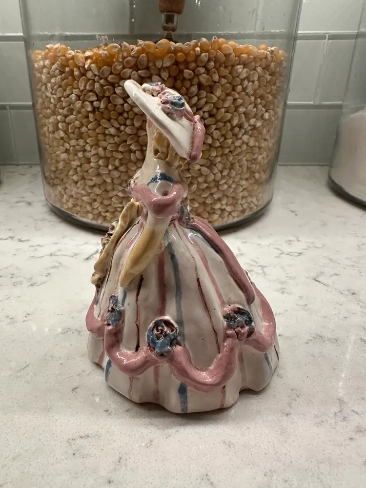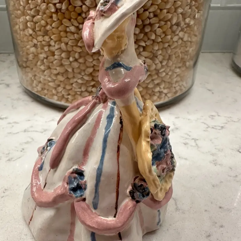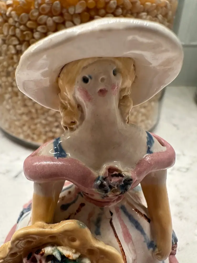 This 4.5” southern belle was handcrafted sometime between 1930 and 1955 by the Overbeck sisters from Cambridge City, Indiana. Signed with the OBK cypher on the bottom, probably by Mary Frances. No damage or repairs!