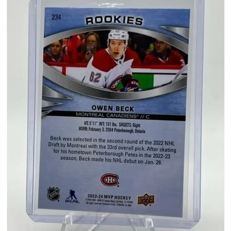 Owen Beck 2023-2024 Upper Deck MVP Hockey Rookie SP RC Montreal Canadiens. Shipping is $1 for the first card, +$0.50 for additional cards, and ships PWE within 1-2 days.