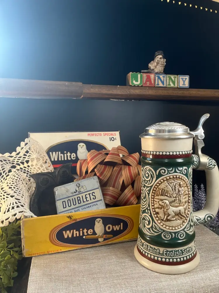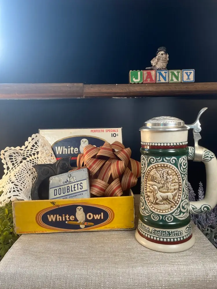 Includes Vintage cardboard White Owl cigar box w/ flip up lid, cast iron owl ashtray, cigarette tin, Avon Stein, large bow, & doily. Together pre shipping wt is approx 3 1/2 Lbs