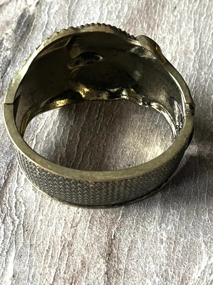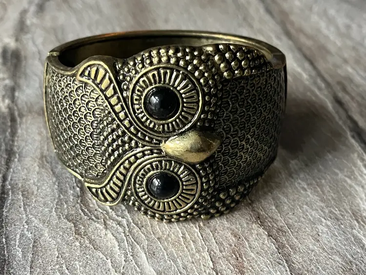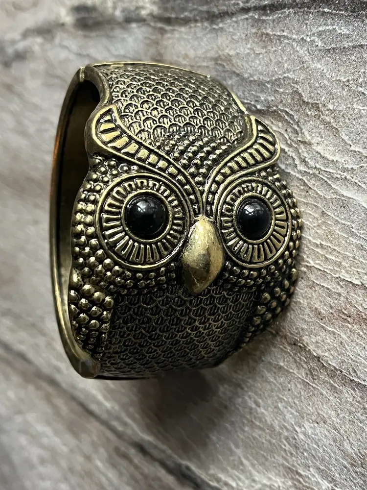 A vintage owl bracelet. It has a clamp cuff that will fit up to a 7 inch wrist. The width of the owl is 2 1/8 inches. Patina look with a light black wash over the gold. Vintage. Clamp is nice and tight.
