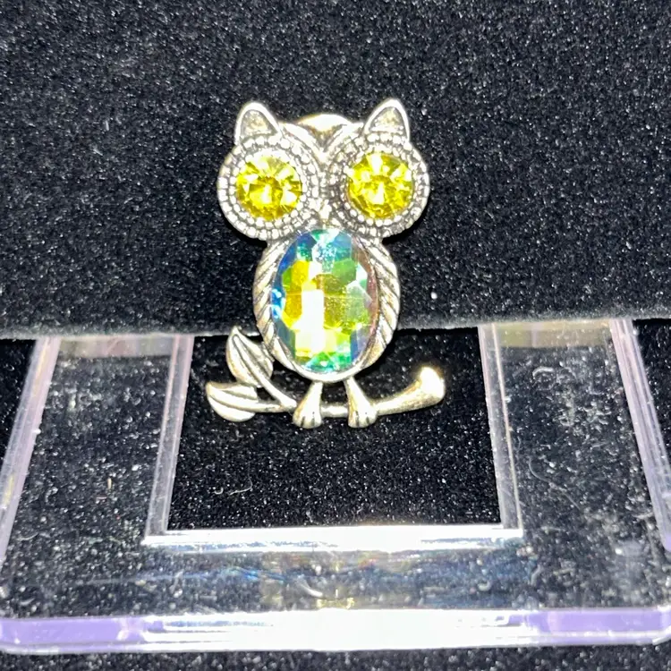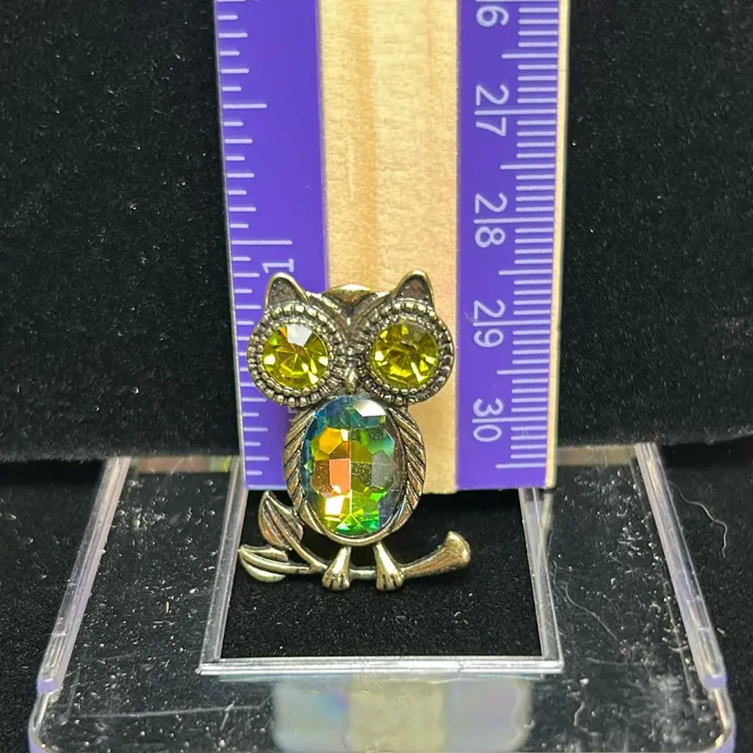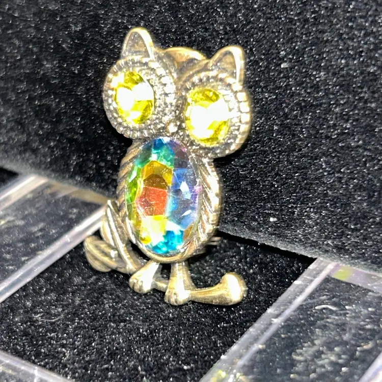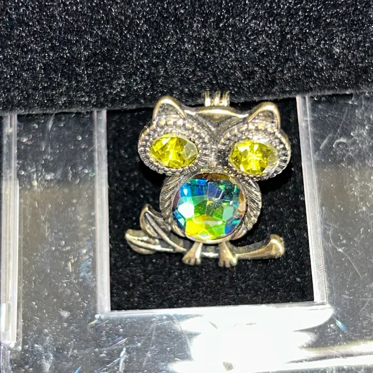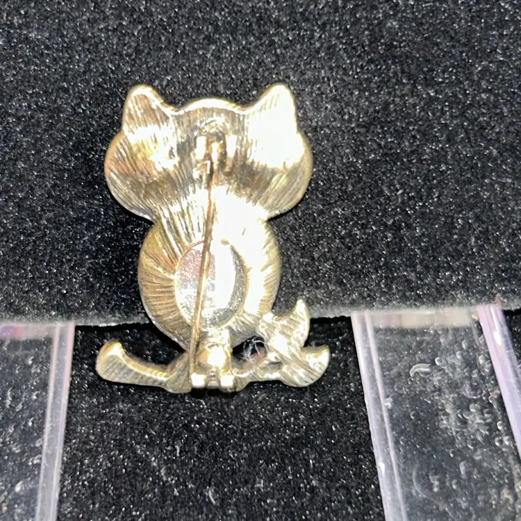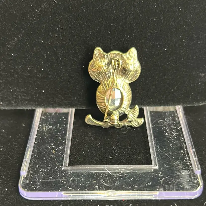 Excellent condition. Approximately 1” high, and 1” wide. No markings. Pin is straight and sharp. Rotating clasp. Gold tone with black accents for antique effect.