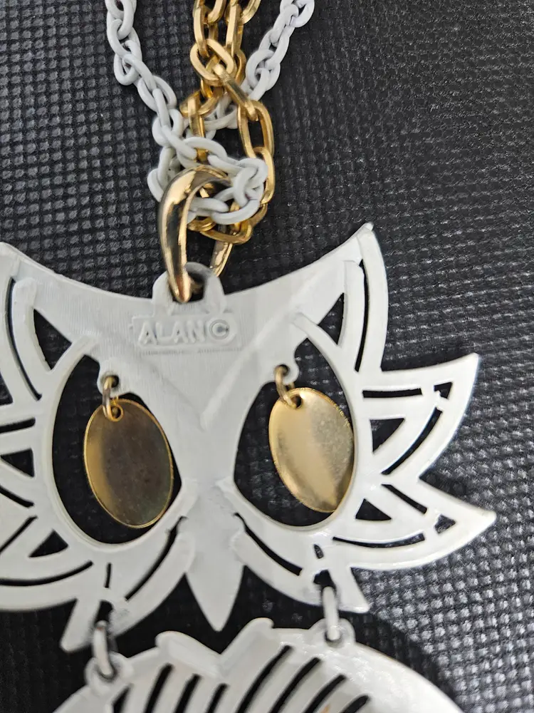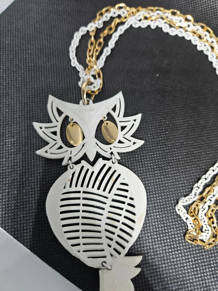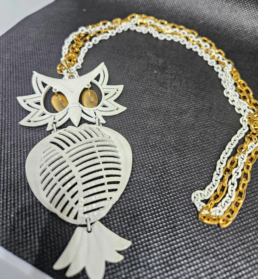 32 inch white and gold owl necklace made by ALAN. The necklace itself is 22 inches and the owl adds 10 inches making the total length 32 inches. The gold eyes shake with movement. Fun necklace!
