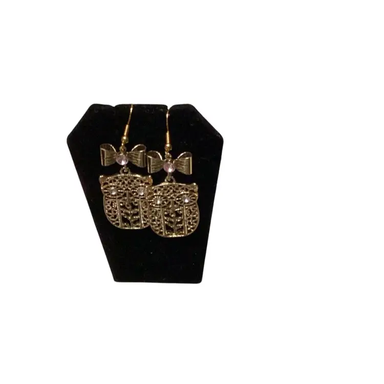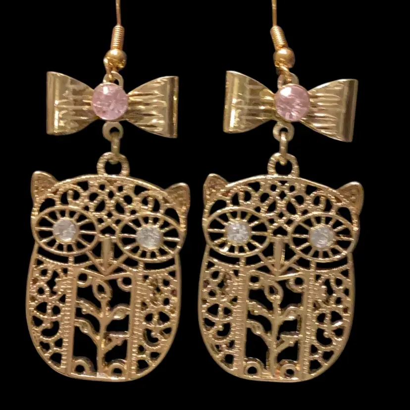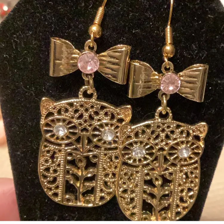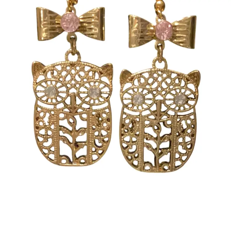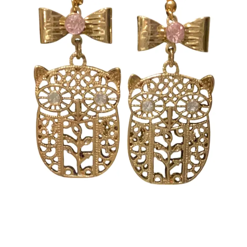 Adorable, gold toned pierced our earrings measuring approximately 2 inches long rhinestones in the eyes bows with pink rhinestones in the bows. These are most adorable little owl. If you’re a bird lover, you’re gonna love these earrings.