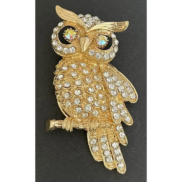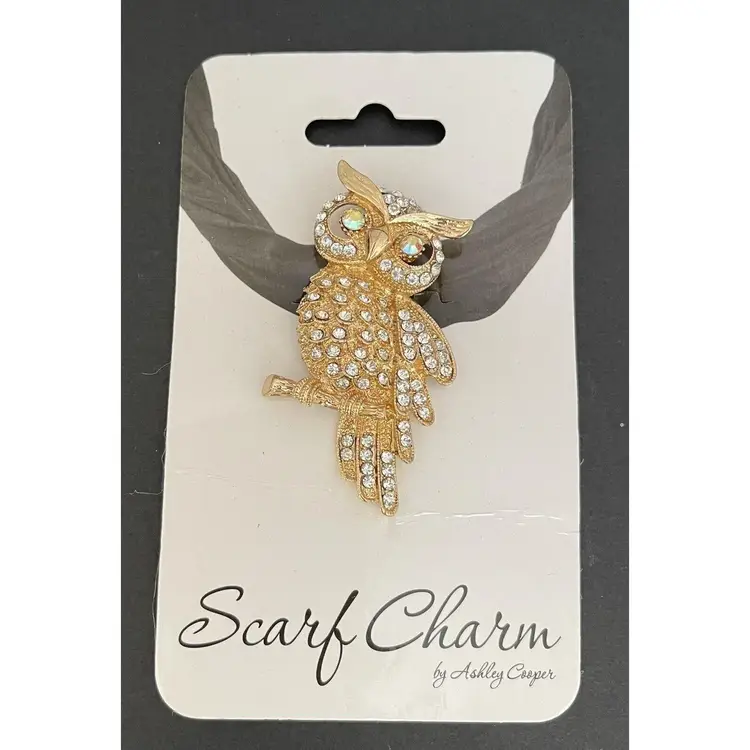 This is A RHINESTONE OWL SHAPED SCARF GOLD TONE CHARM/CLIP. NOS.