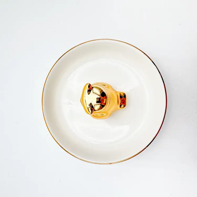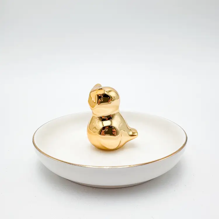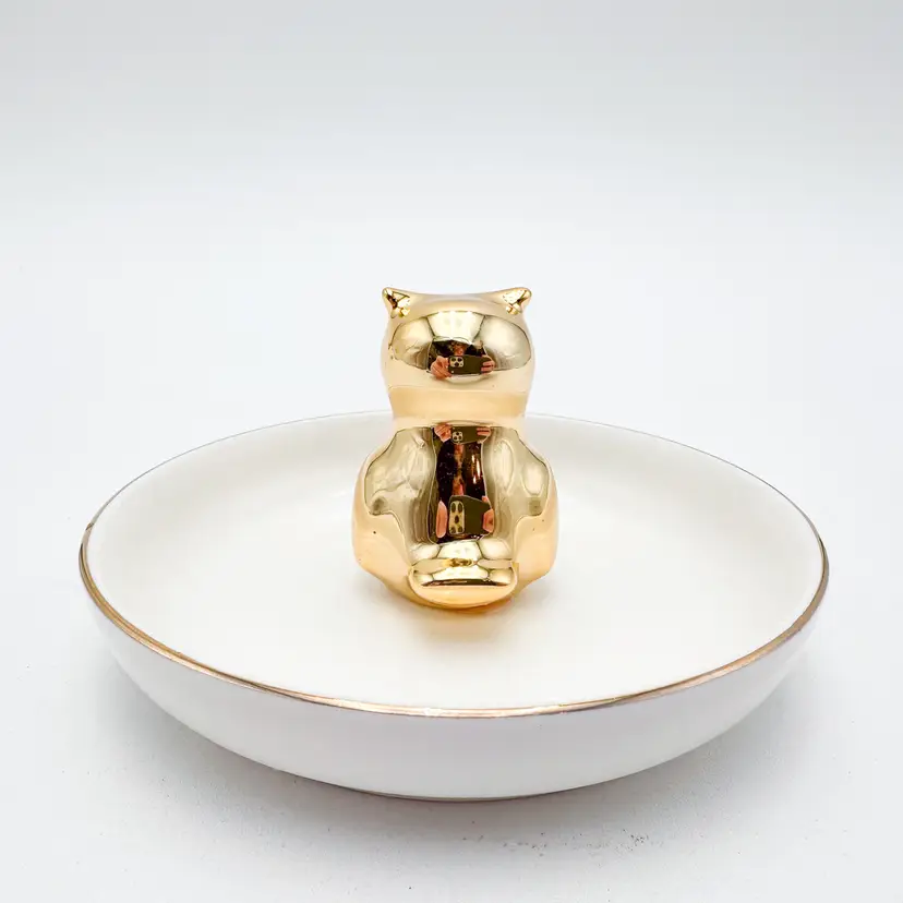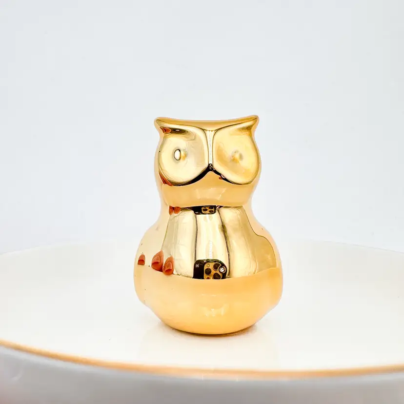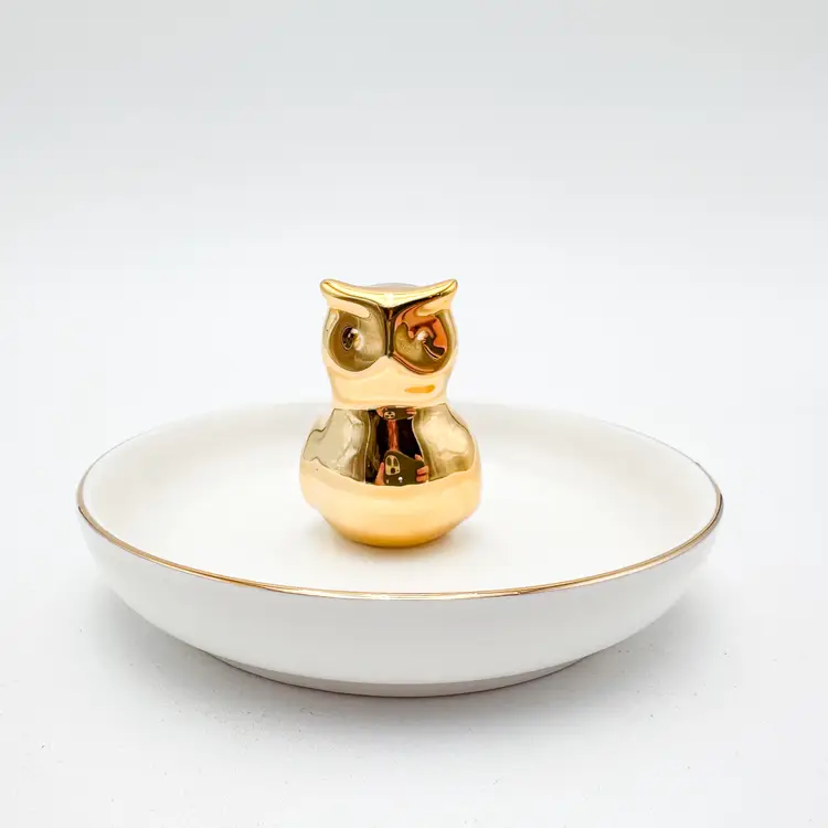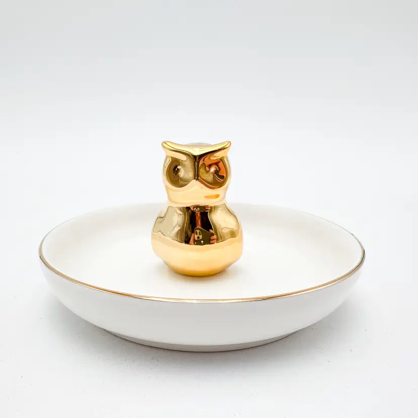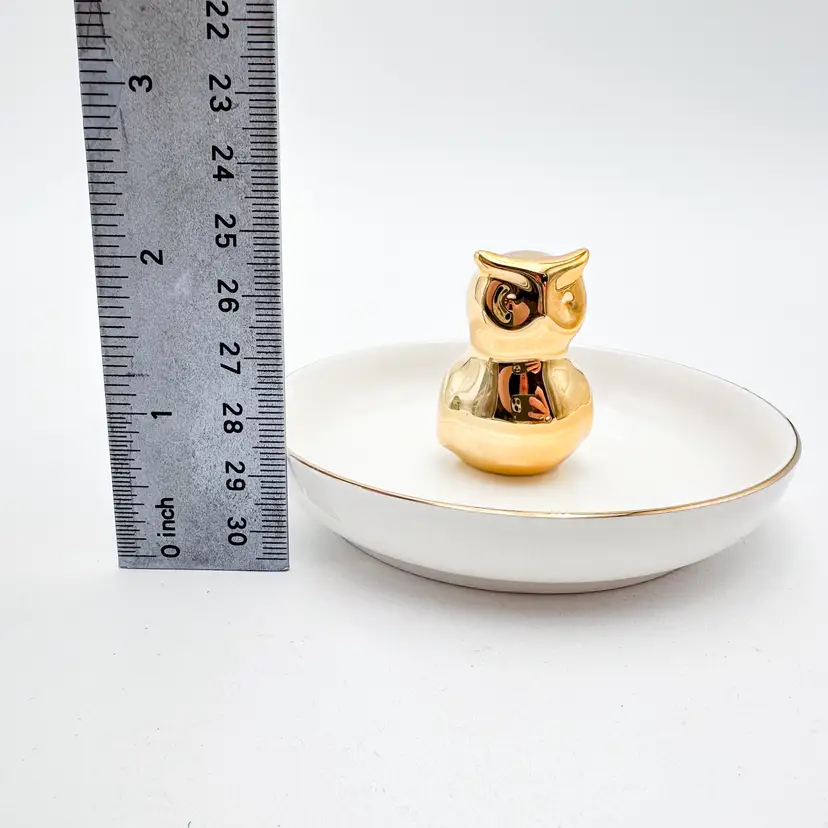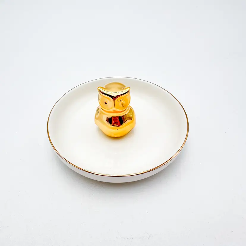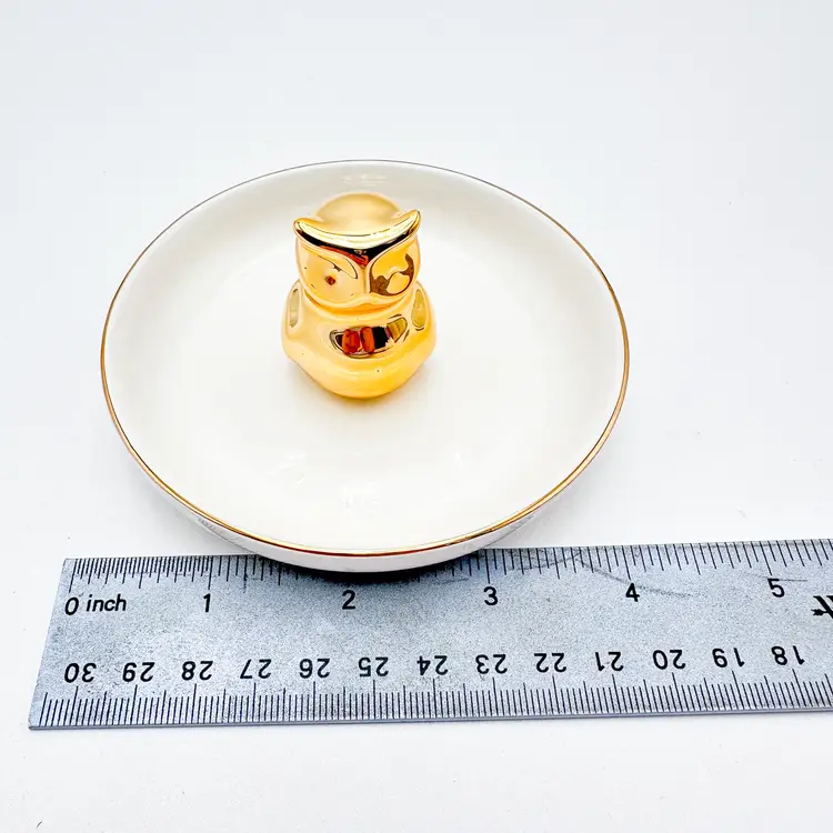 White plate with gold rim, gold owl in center for rings/jewelry Very good condition, minimal signs of wear, see all photos 4"D x 2.25" H