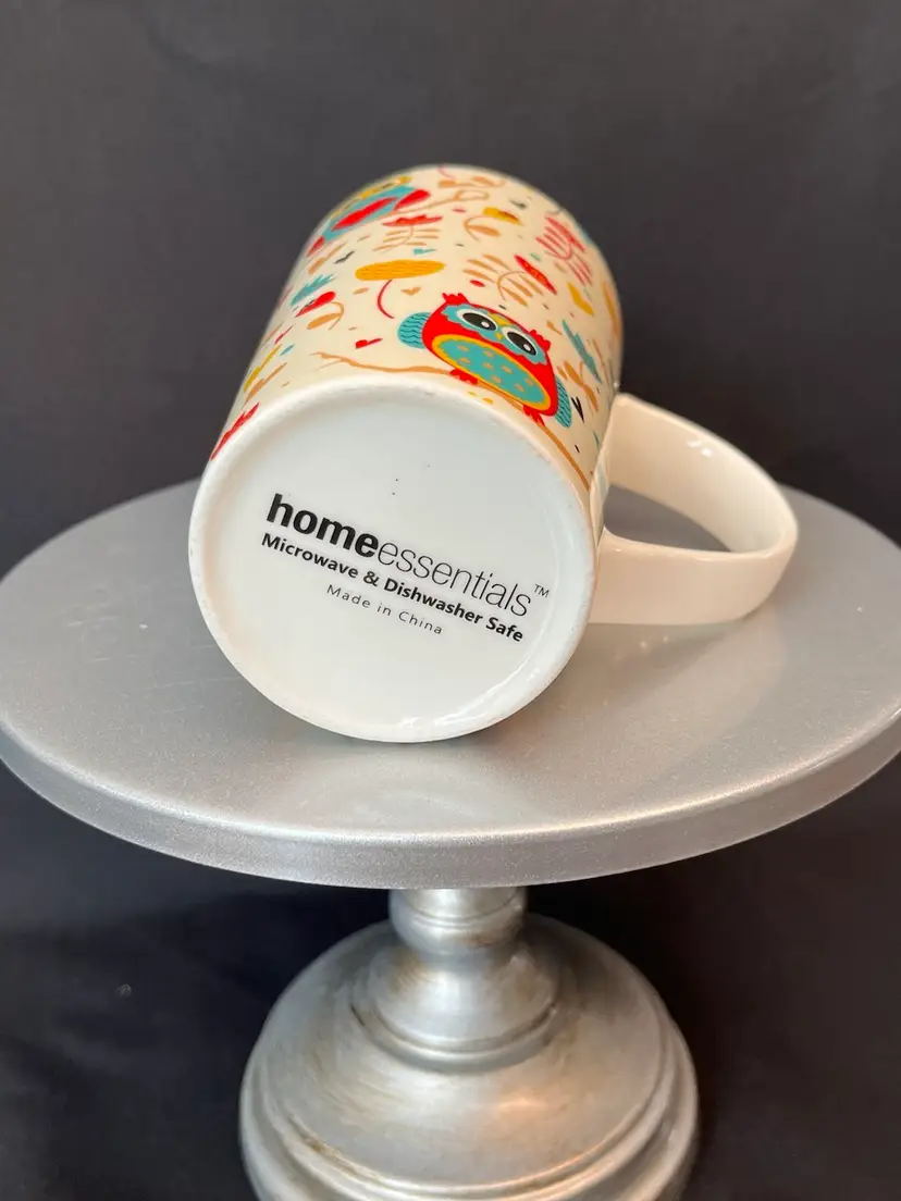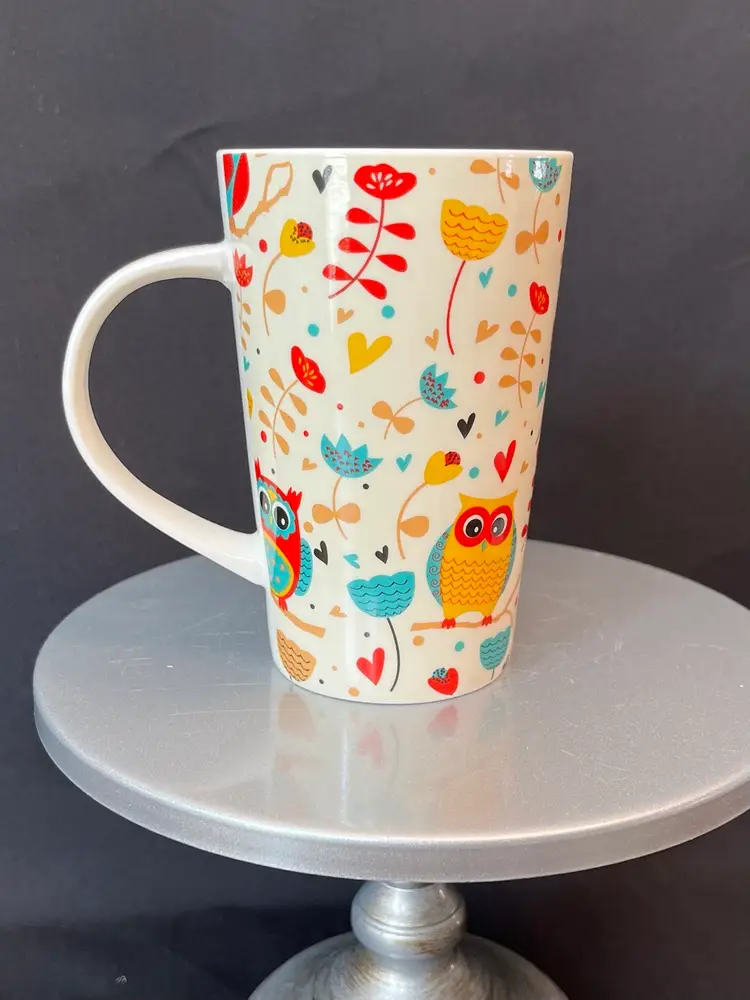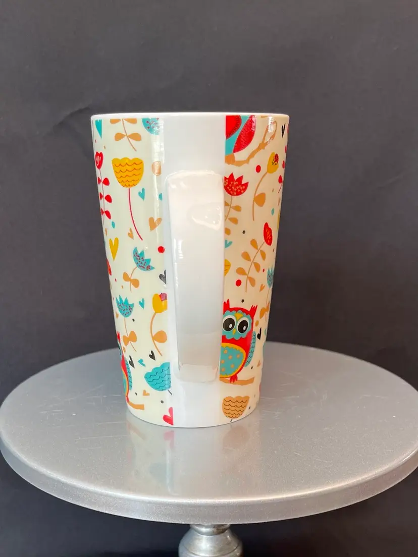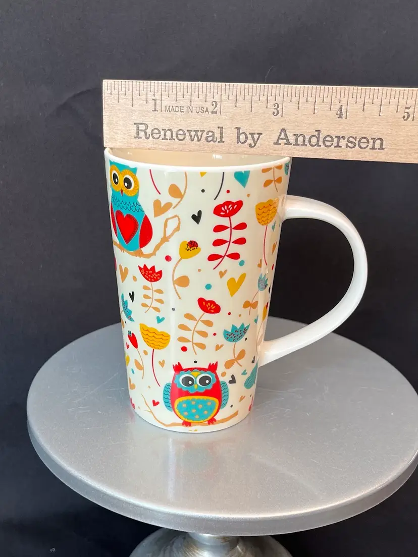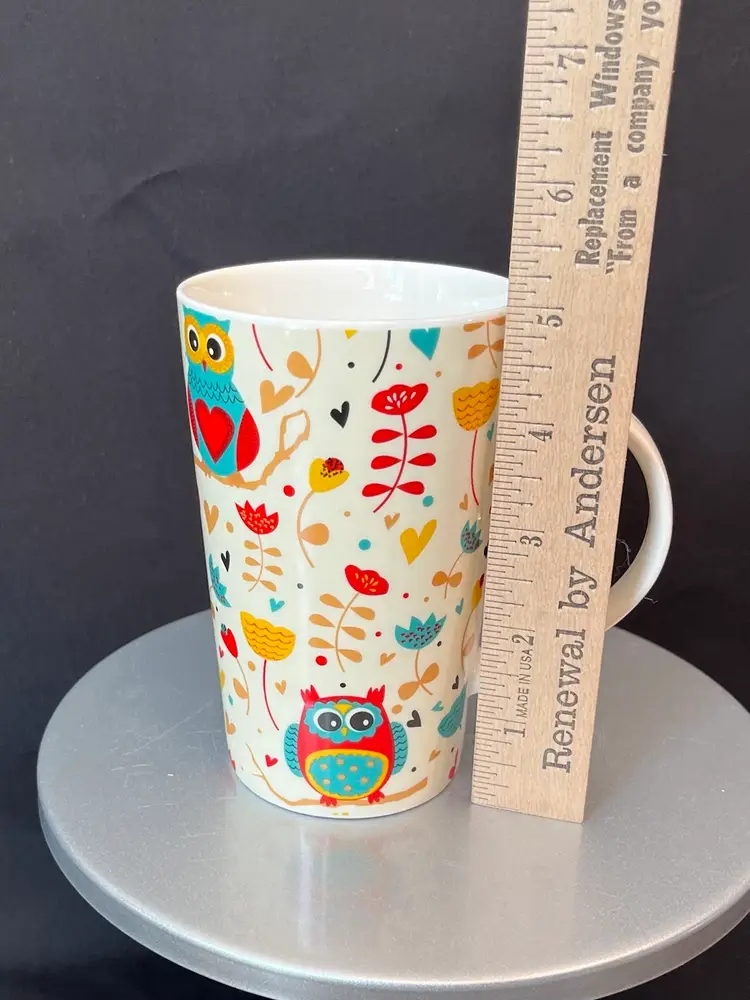 #70 New Owls/Flowers/Hearts Cafe latte Mug by Home Essentials. Measures 5” tall x 3.25” wide. In perfect condition.
