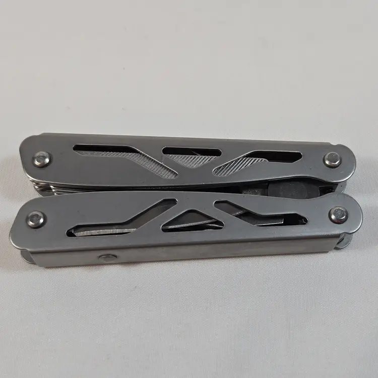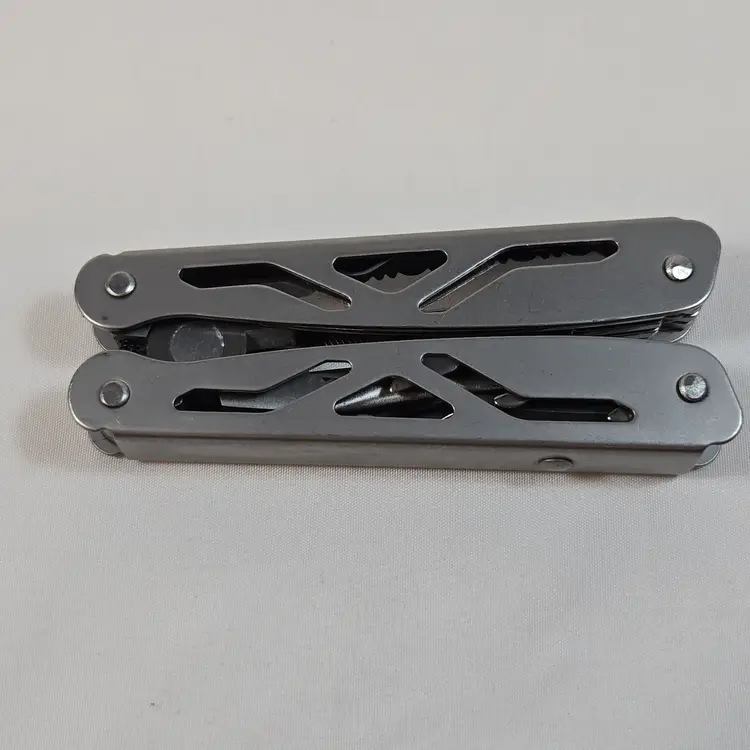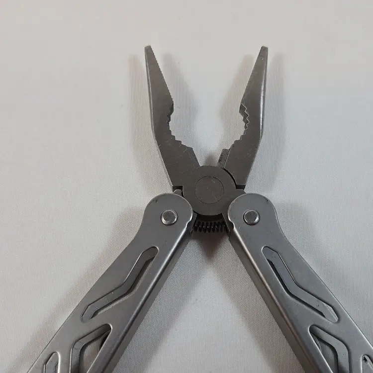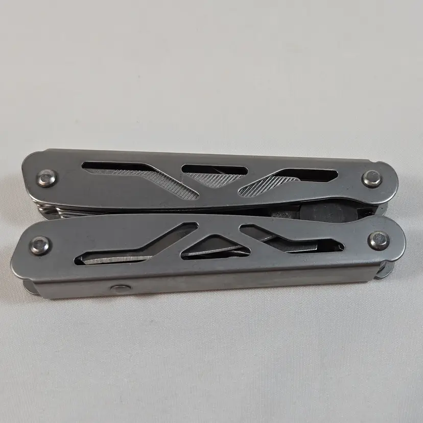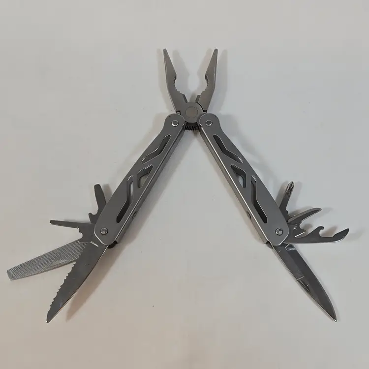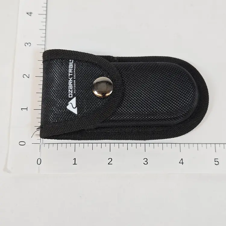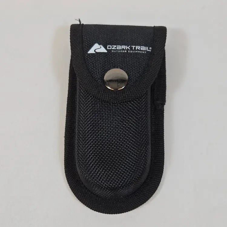 Ozark Trail multitool with folding pliers, knife blades, screwdrivers, file, and other functions. Comes with original nylon belt pouch. Tool shows light handling wear but is in good working condition. Handy for camping, hiking, or everyday use.