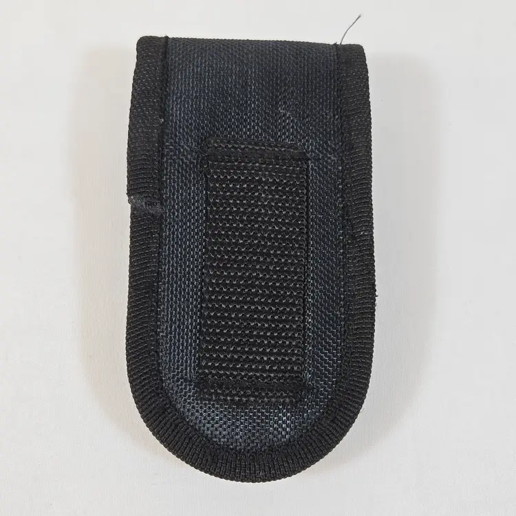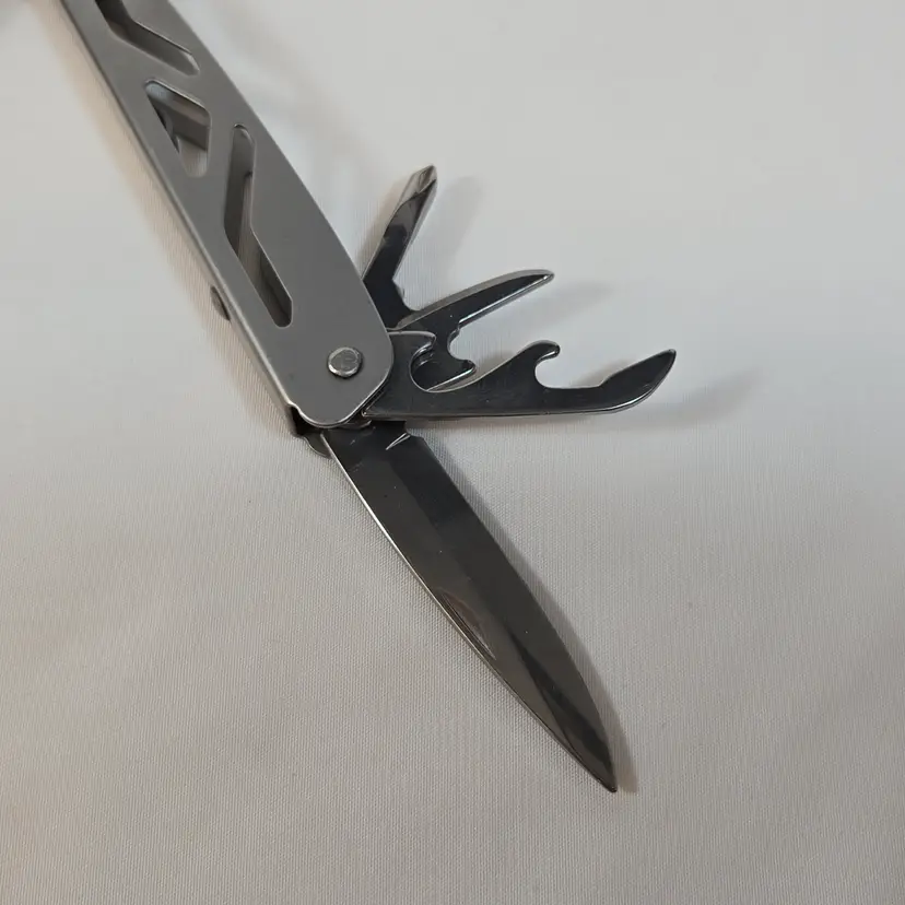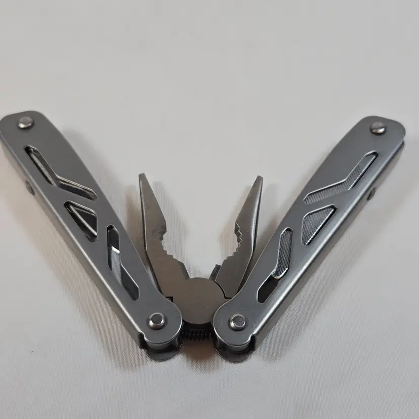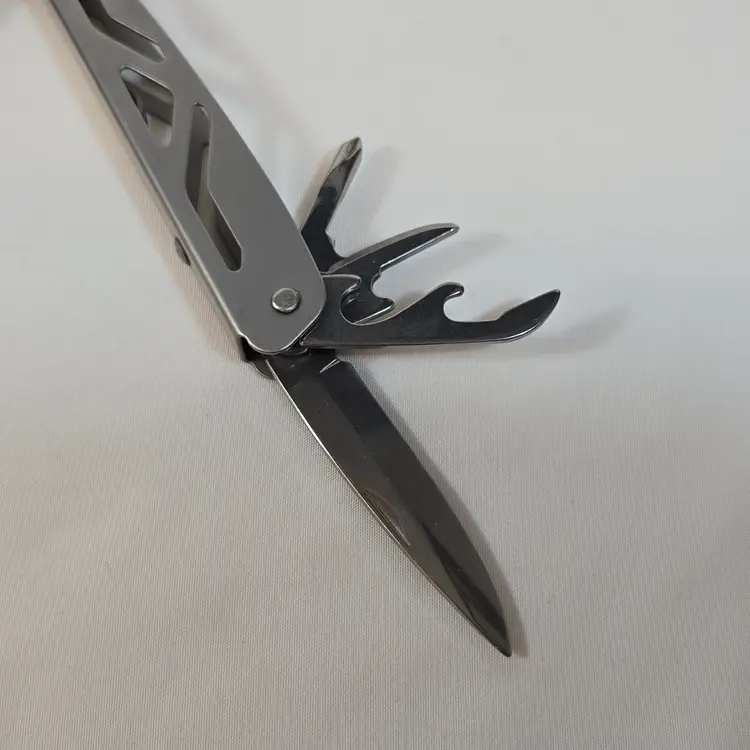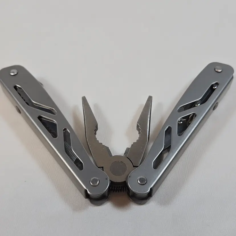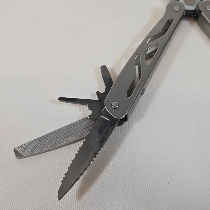 Ozark Trail multitool with folding pliers, knife blades, screwdrivers, file, and other functions. Comes with original nylon belt pouch. Tool shows light handling wear but is in good working condition. Handy for camping, hiking, or everyday use.