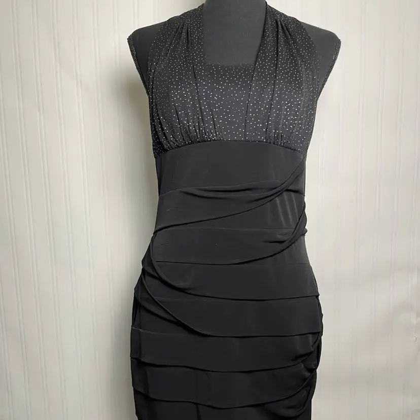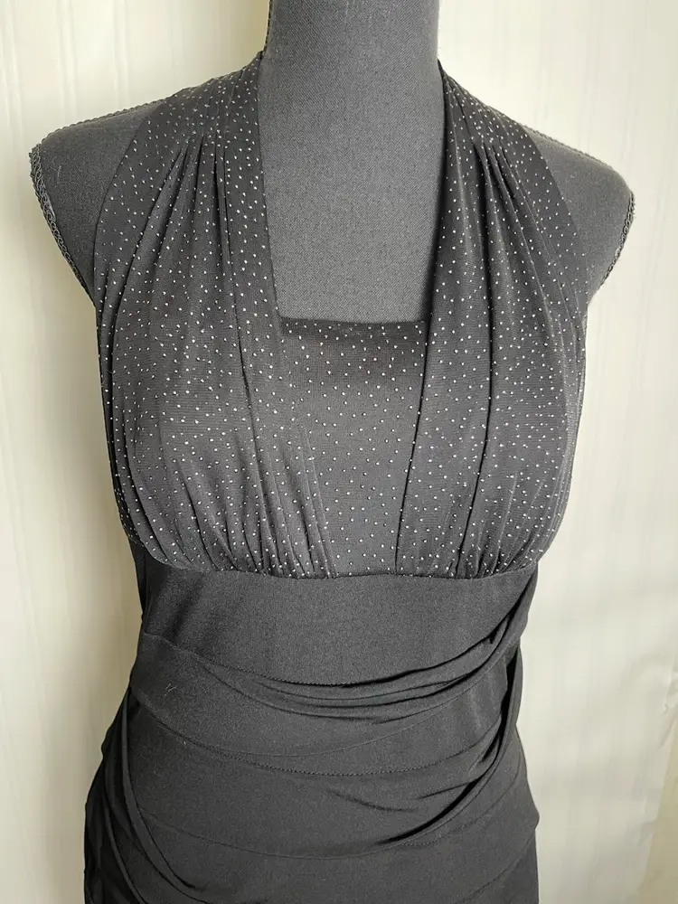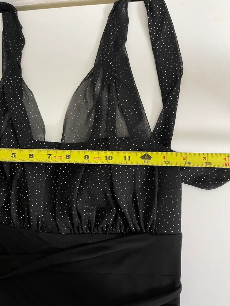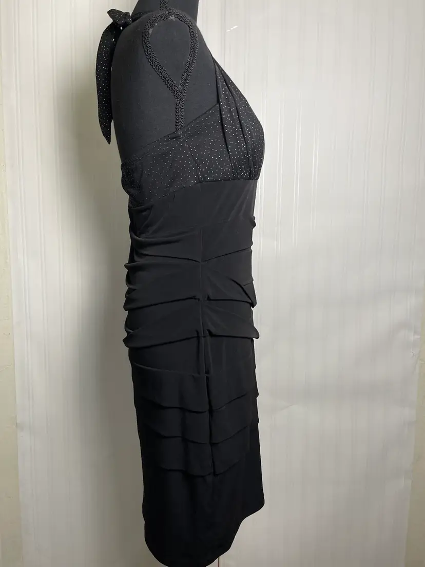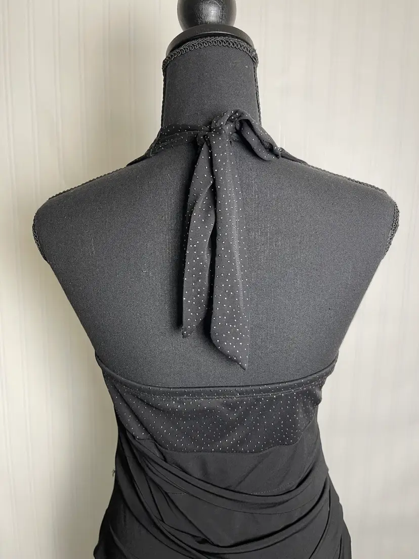 Valerie Bertinelli Womens 8 Halter Polka Dot Tiered Fit Black Dress Y2K Feminine Stretch Halter tie About knee length Tiered layer assent Silver polka dots on the chest area