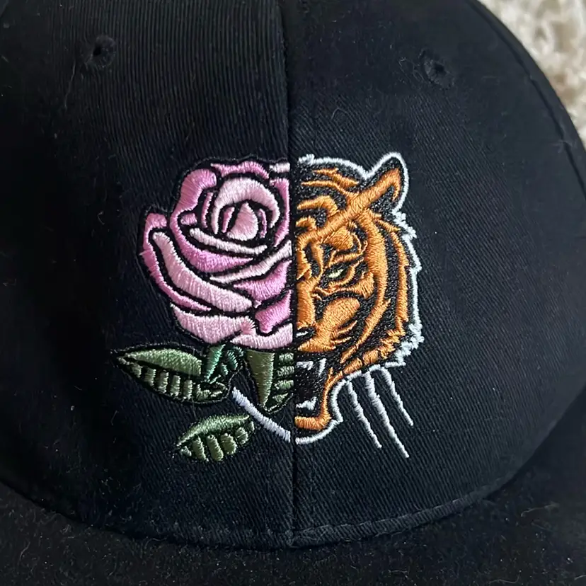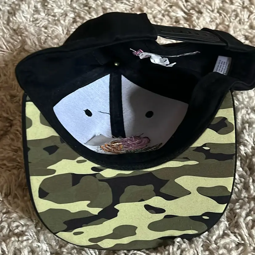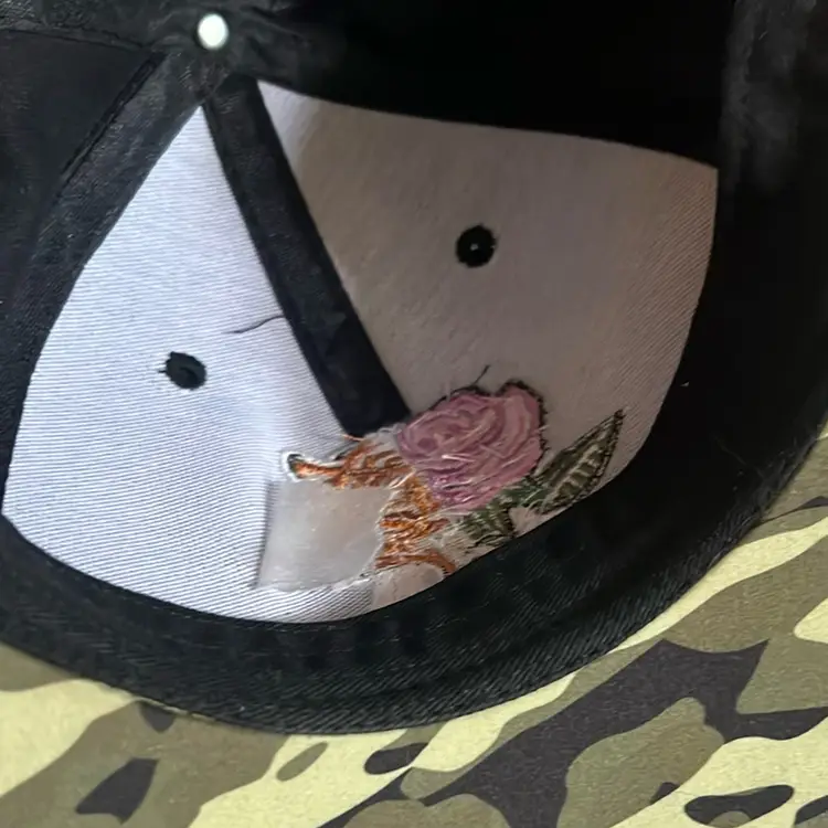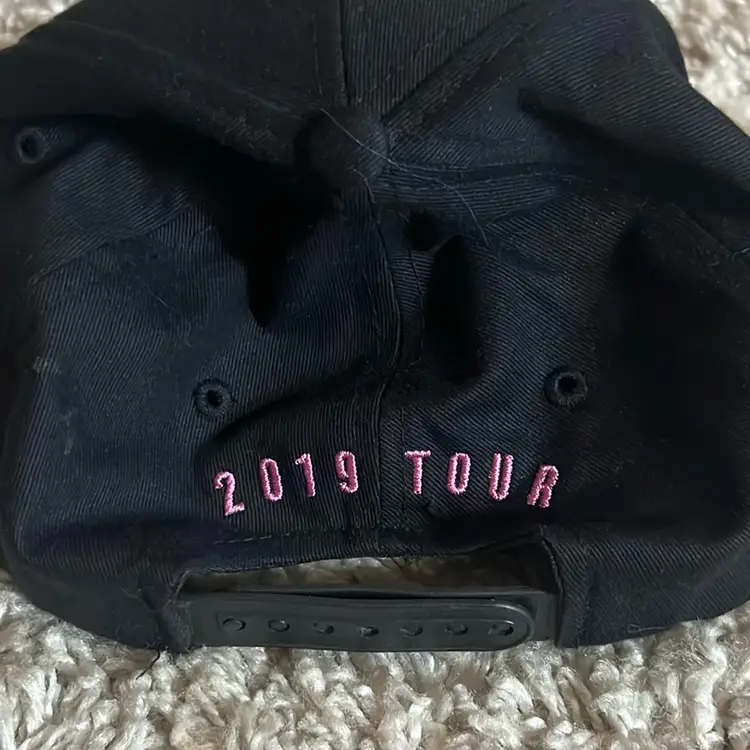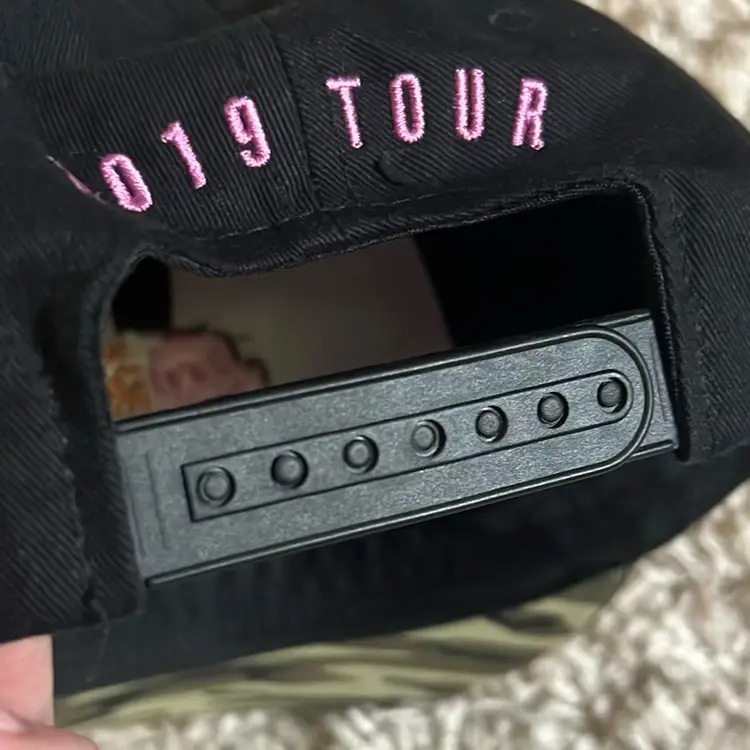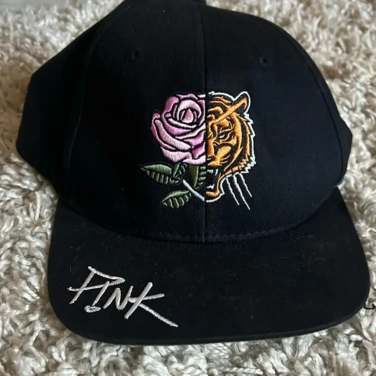 P!NK 2019 tour trucker ball cap in black with camo. Rose and tiger image on front and 2019 stitched on back.