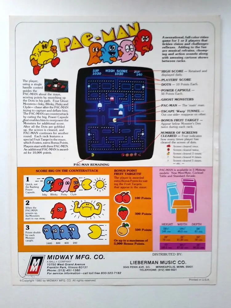 Brand: Midway Year: 1980 Game Title: Pac-Man Original/Reproduction: Original Theme: Retro Gaming Country/Region of Manufacture: United States Modified Item: No Arcade: Flyer Vintage: Paper Advertising