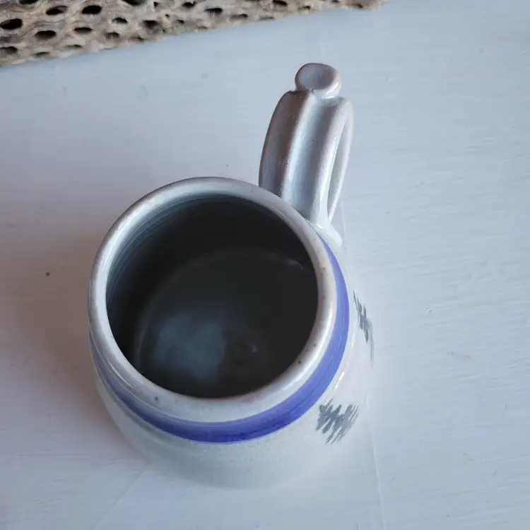 It is an excellent piece of Studio Pottery. I love its unique handle. Gorgeous outdoorsy style. Very artistic & lovely piece. It has a soft bottom that protects the surface it is sat on from heat & scratching.