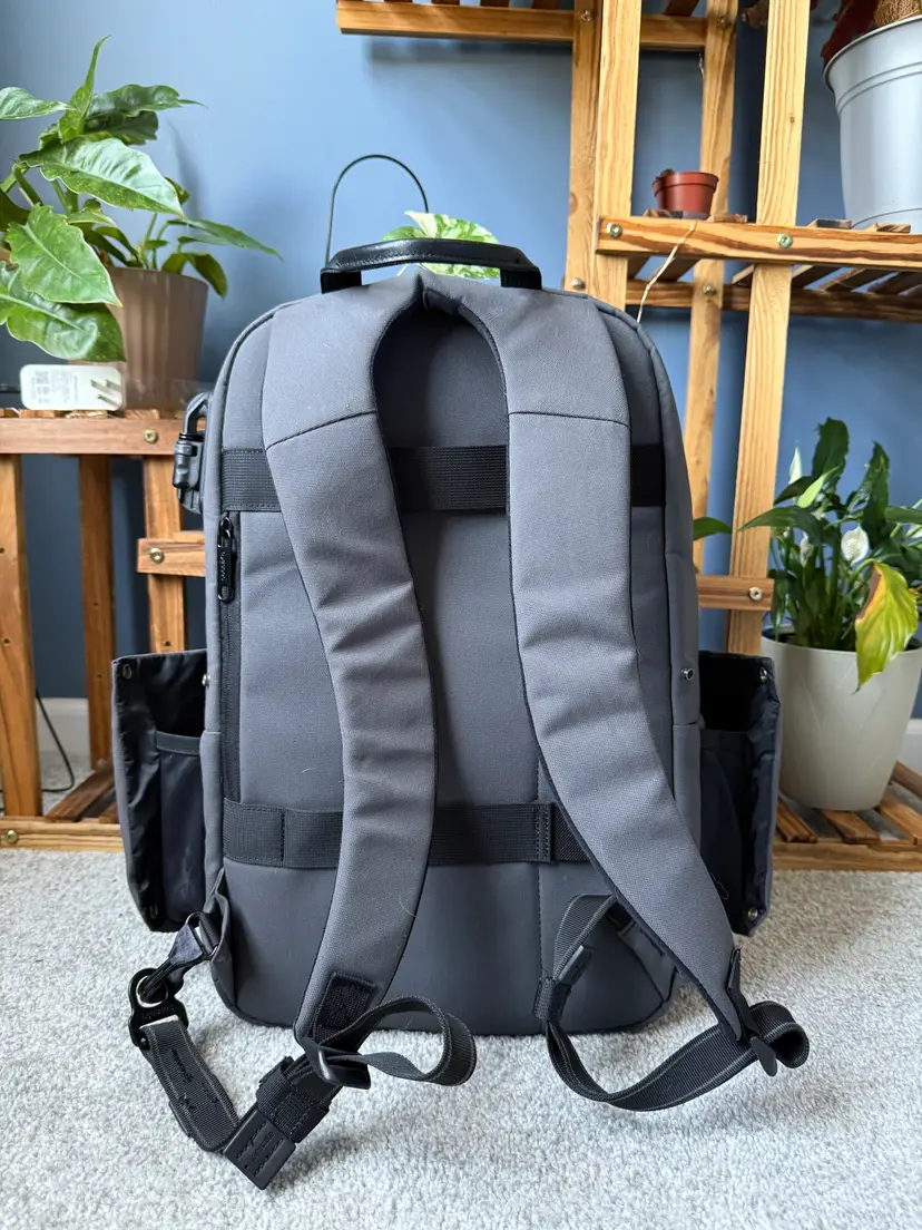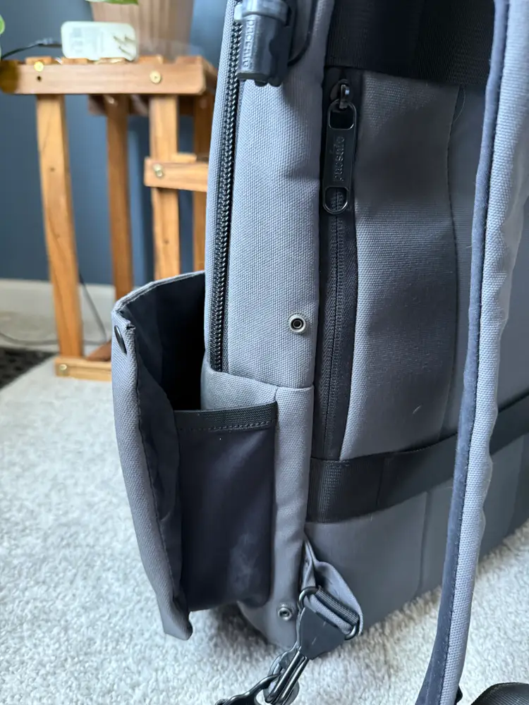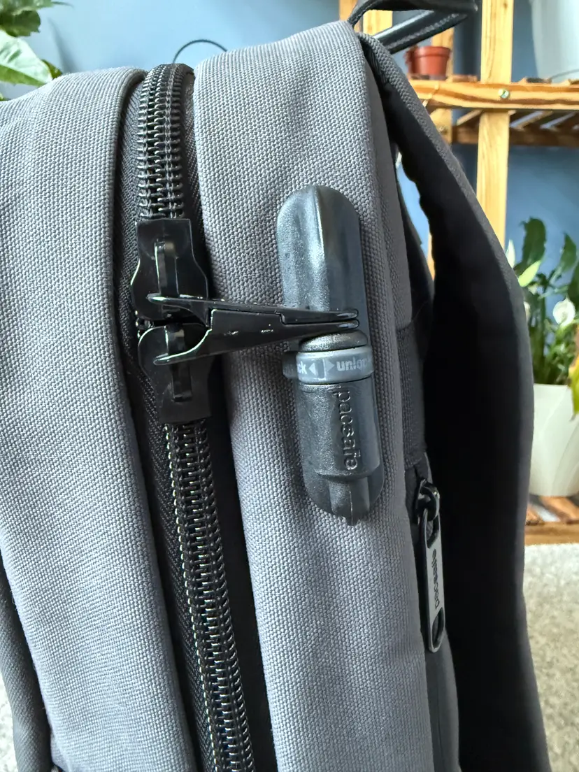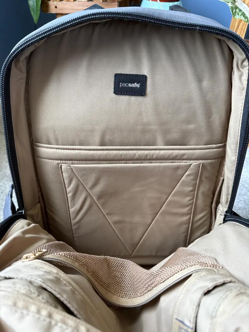 2019 colab with PacSafe and Unbox Therapy backpack 25L with 15" padded laptop and tablet sleeve Anti-theft quick access pocket Admin panel with RFID blocking pocket Hidden back panel pocket Snap buttons for waterbottle pockets Only minor wear and tear with one small stain on the bottom of the inside
