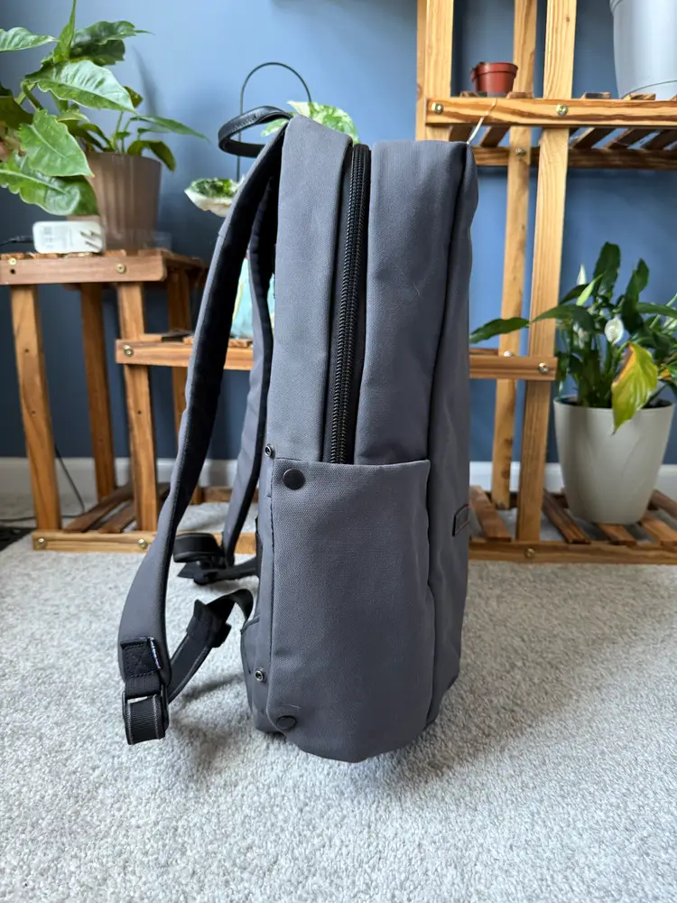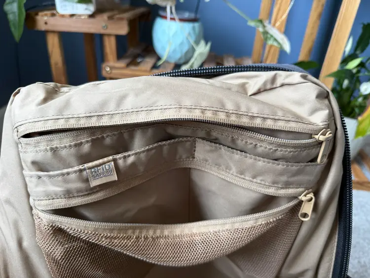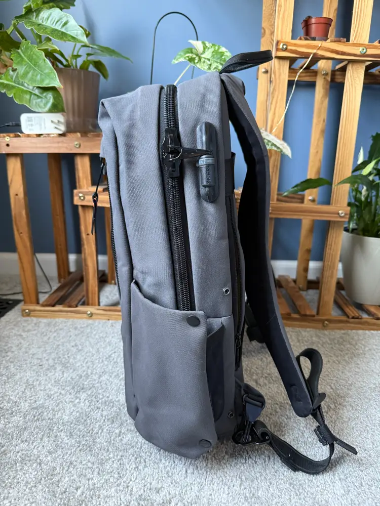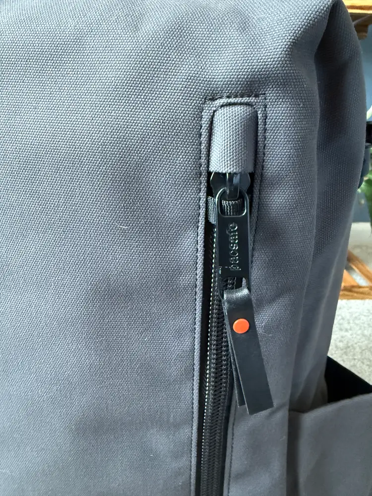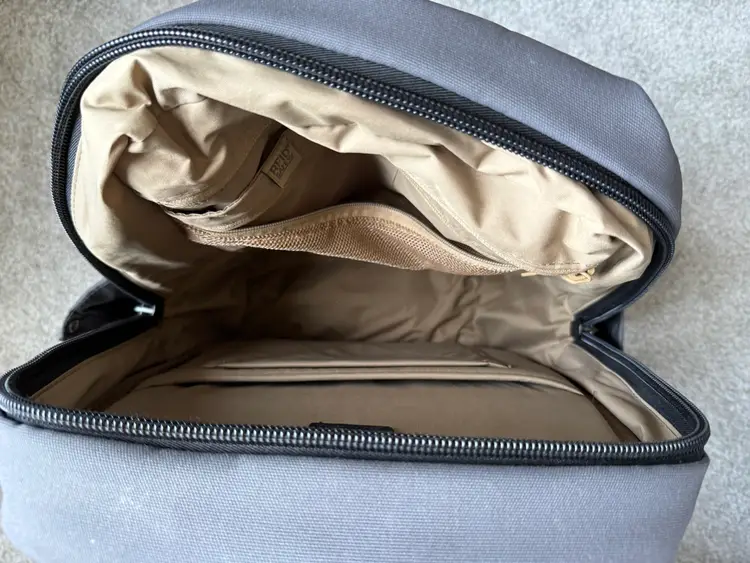2019 colab with PacSafe and Unbox Therapy backpack 25L with 15" padded laptop and tablet sleeve Anti-theft quick access pocket Admin panel with RFID blocking pocket Hidden back panel pocket Snap buttons for waterbottle pockets Only minor wear and tear with one small stain on the bottom of the inside