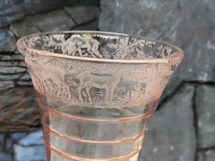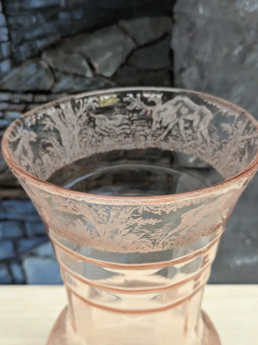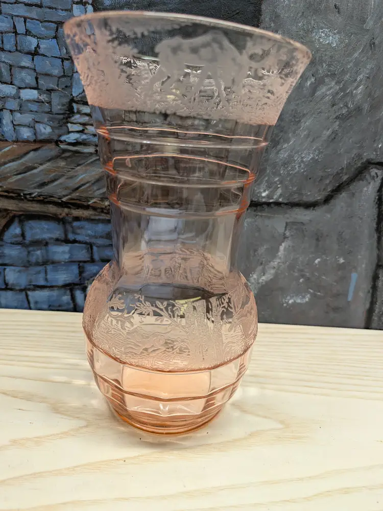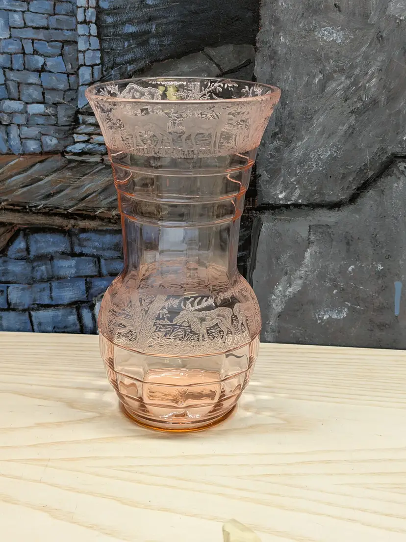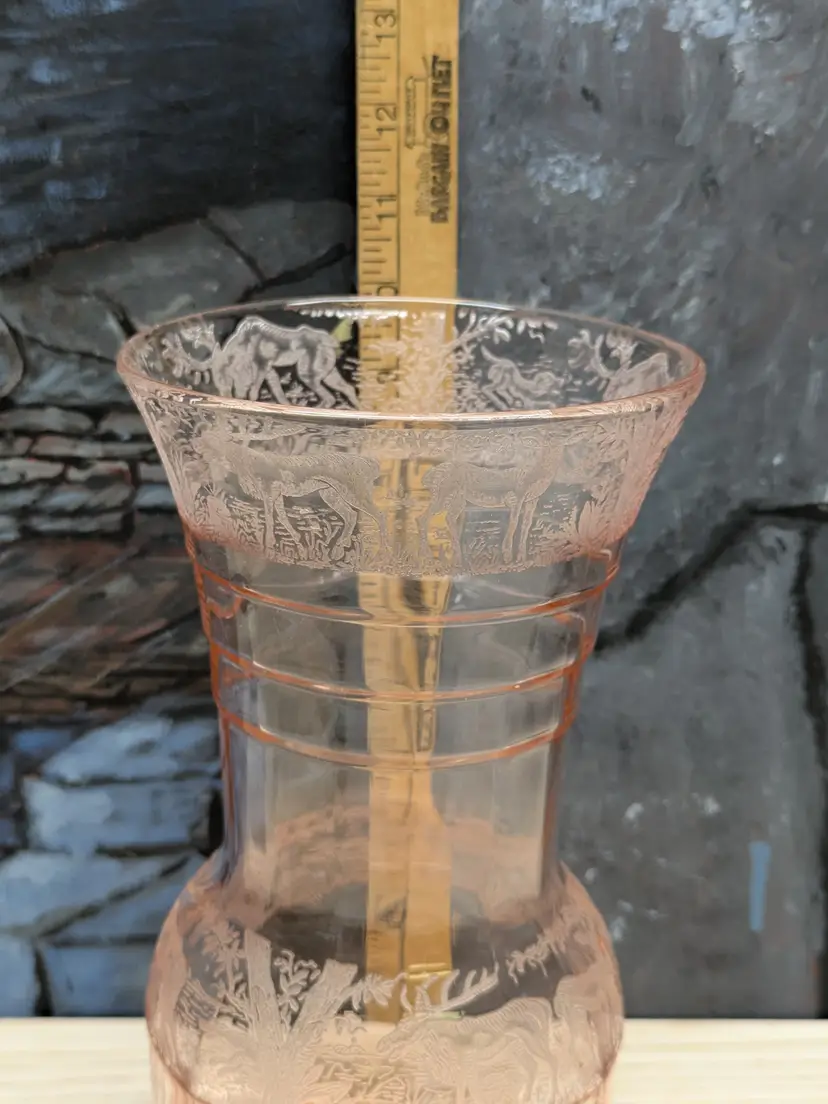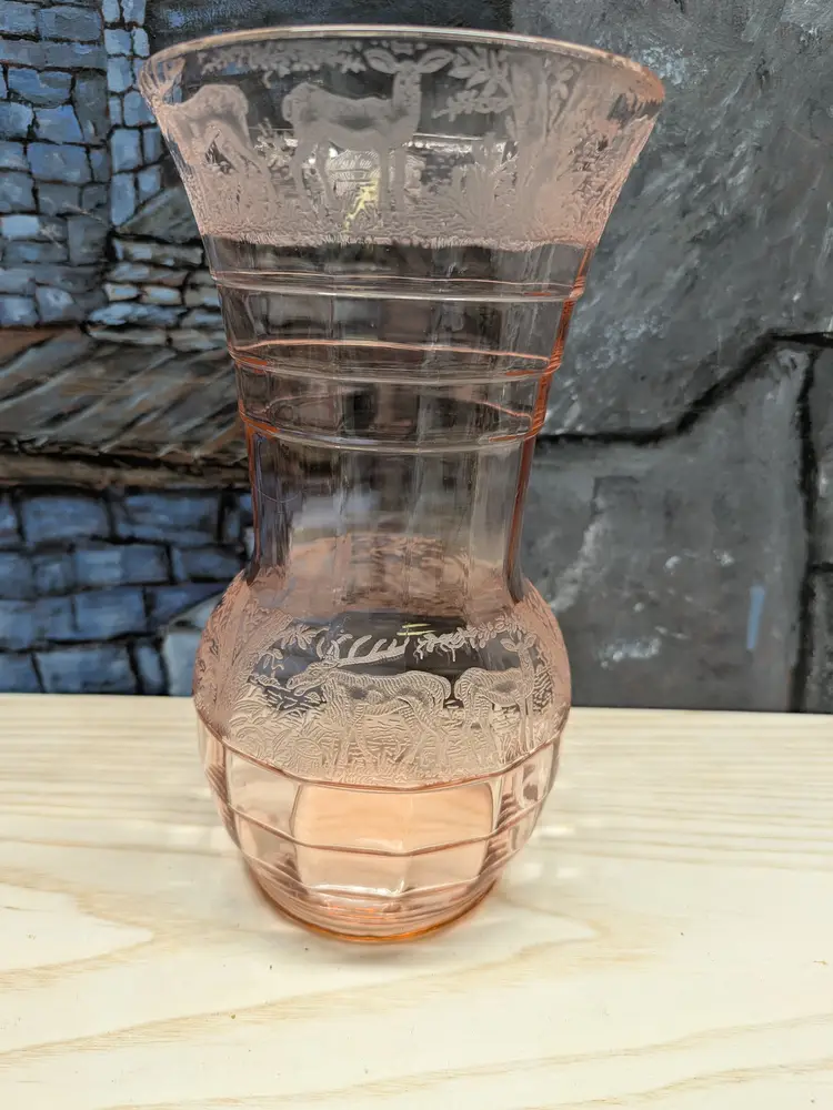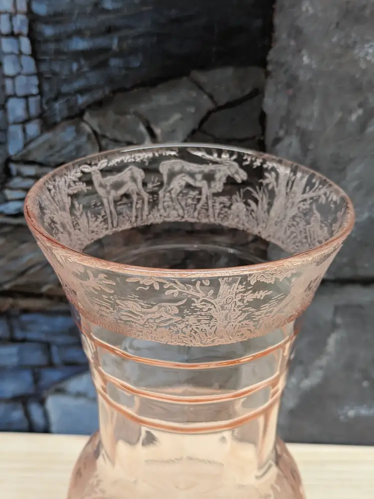 Paden City Glass 10" Vase Cheriglo Pink Black Forest Elegant Depression Glassware with etched Moose , Deer ,dog and trees. Regina #210 It has This is a beautiful piece. Perfect for the Easter spring decor. Sweet Mothers Day gift. It is 10" tall the mouth of the vase is 5 1/2in wide. This can fit into English cottage , cottagecoe , Fairycore, woodland ,Boho, 20s 30s decor, Great condition Clean with no damage.no chips or cracks no weird smells. Please check the photos for details. Comes from a smoke free home. We do have pets.