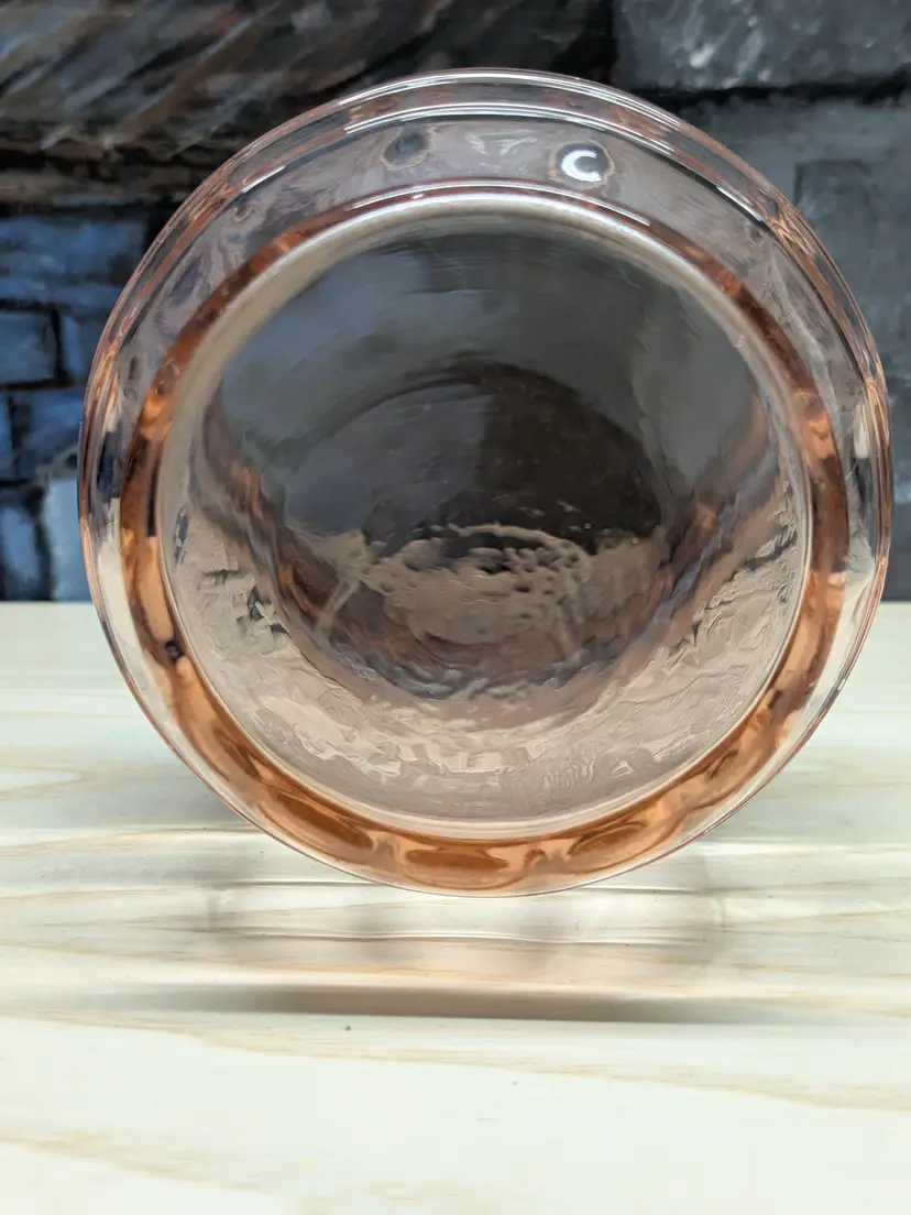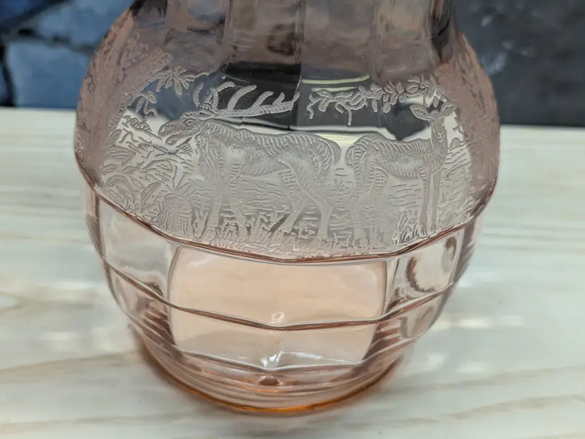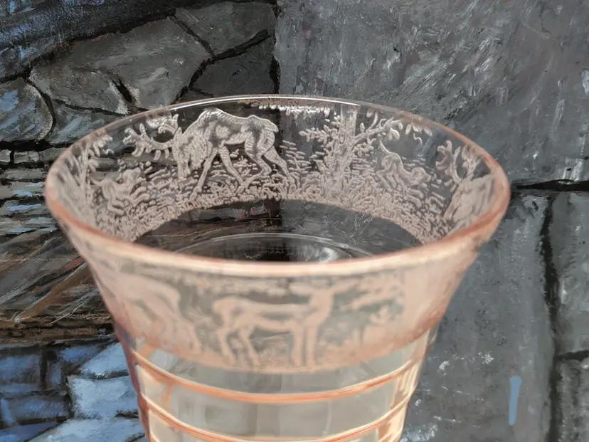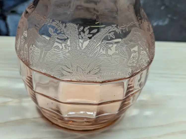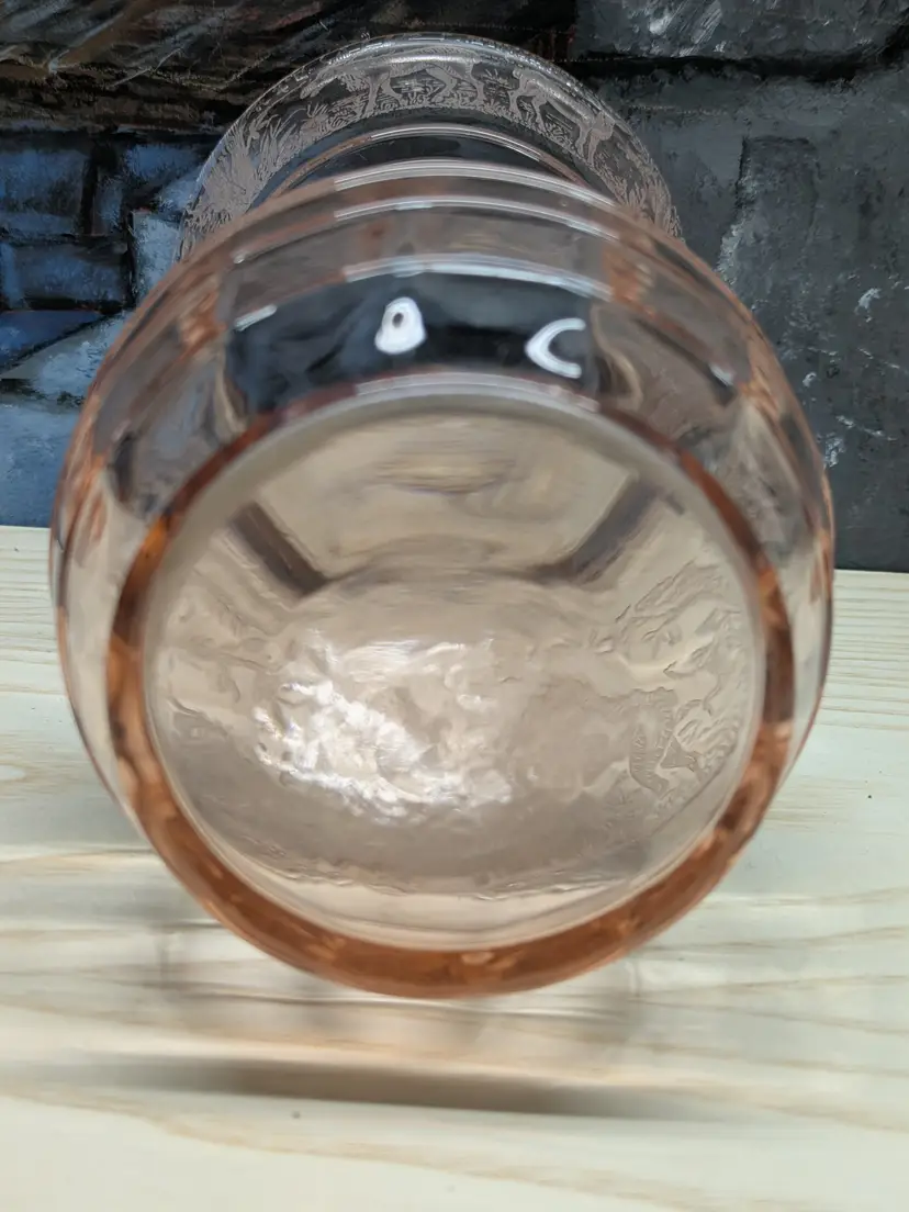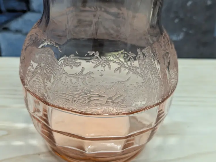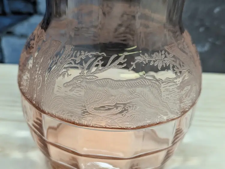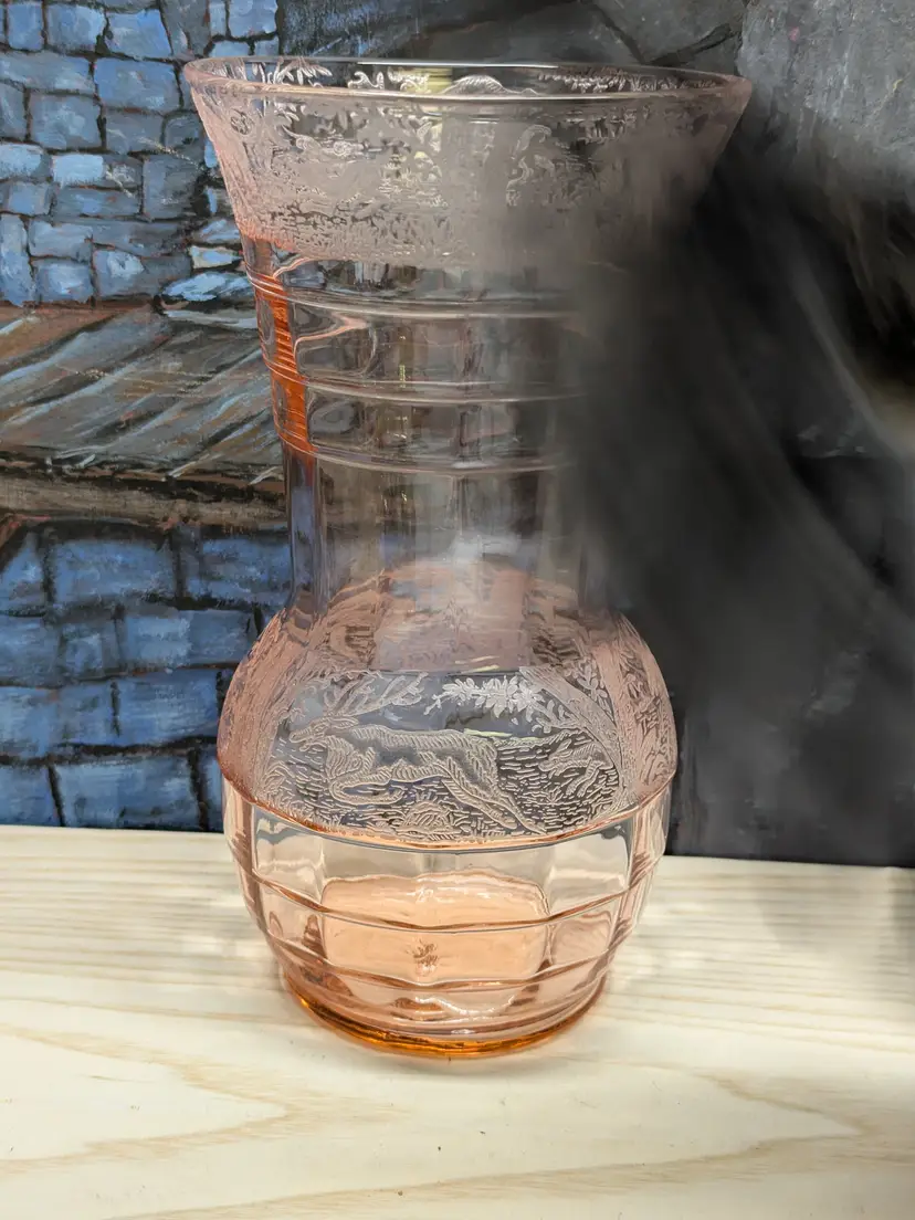 Paden City Glass 10" Vase Cheriglo Pink Black Forest Elegant Depression Glassware with etched Moose , Deer ,dog and trees. Regina #210 It has This is a beautiful piece. Perfect for the Easter spring decor. Sweet Mothers Day gift. It is 10" tall the mouth of the vase is 5 1/2in wide. This can fit into English cottage , cottagecoe , Fairycore, woodland ,Boho, 20s 30s decor, Great condition Clean with no damage.no chips or cracks no weird smells. Please check the photos for details. Comes from a smoke free home. We do have pets.