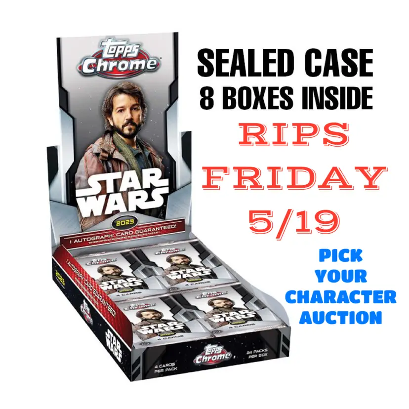 You are bidding on all the cards of the CHARACTER listed in the title in this Case (8 Boxes) of 2023 Star Wars Chrome trading cards. Case will be opened LIVE on Friday, 5/19/2023, at apx 11 PM Eastern / 8 PM Pacific. Opening will be viewable & simulcast on the Star Wars Marketplace on ISO as well as on Twitter and YouTube. Shipping: $4.50 for 1st spot won; only $.25 for any subsequent spots you win. Any spot won where no cards of the character are found in the box will receive a Topps Star Wars card from my personal collection. Any dual or multi-character autographs in the case will be assigned by draw between the spots who are the subjects on the card; in the event any Sketch Card or other card in the case does not apply to a character on the checklist, that card will also be assigned by draw between all participants.