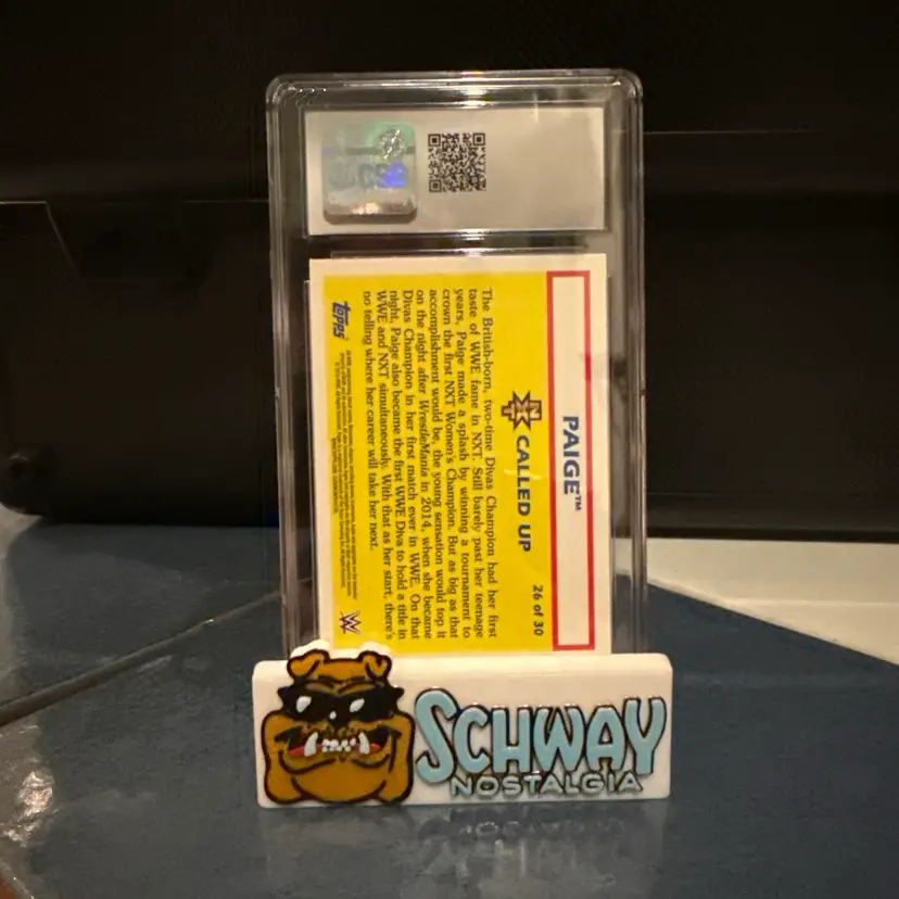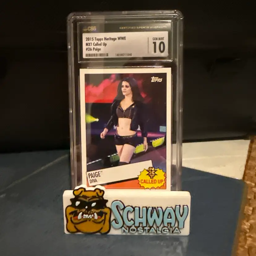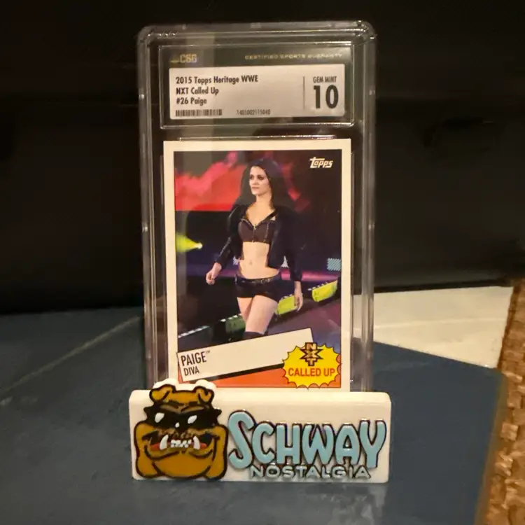 The product is a 2015 Topps Heritage WWE trading card featuring Paige, also known as Saraya. This rookie card is part of the WWE NXT called up set and has been authenticated by CSG/CGC with a 10 grade. As a vintage original card, it holds value for collectors and fans of wrestling memorabilia. The card showcases Paige's early career in WWE, making it a sought-after piece for fans of the sport.