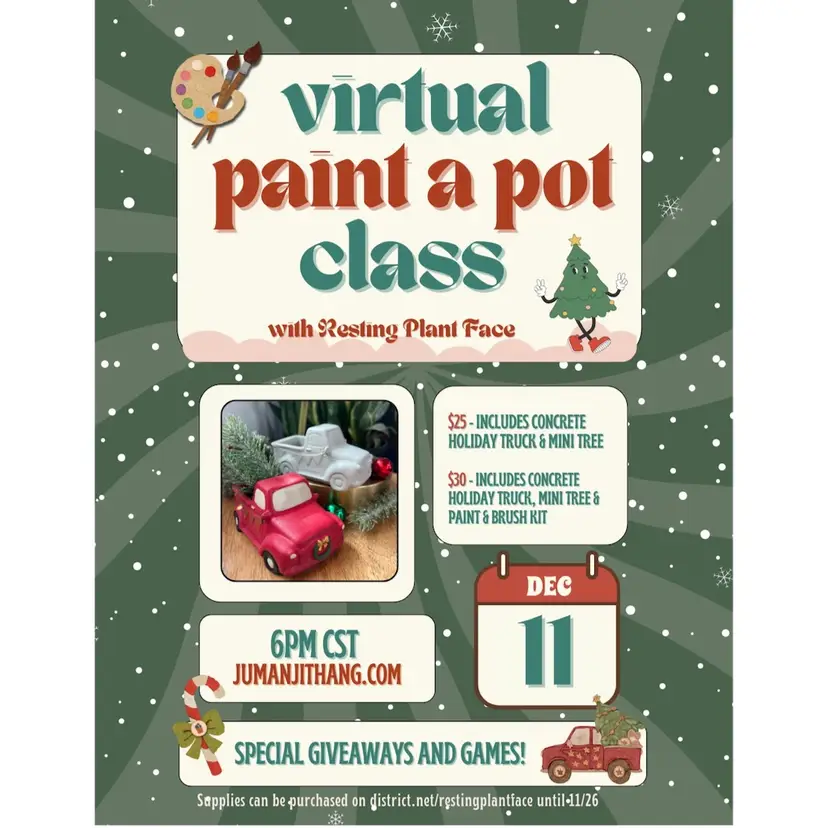 Join me for a night of holiday shenanigans while we paint a cute holiday truck. This listing includes a ready to paint concrete truck and a faux mini tree for the trunk. This will be a private live filled with special giveaway and holiday games! Listing must be purchased no later than 11/26 to ensure on time delivery.