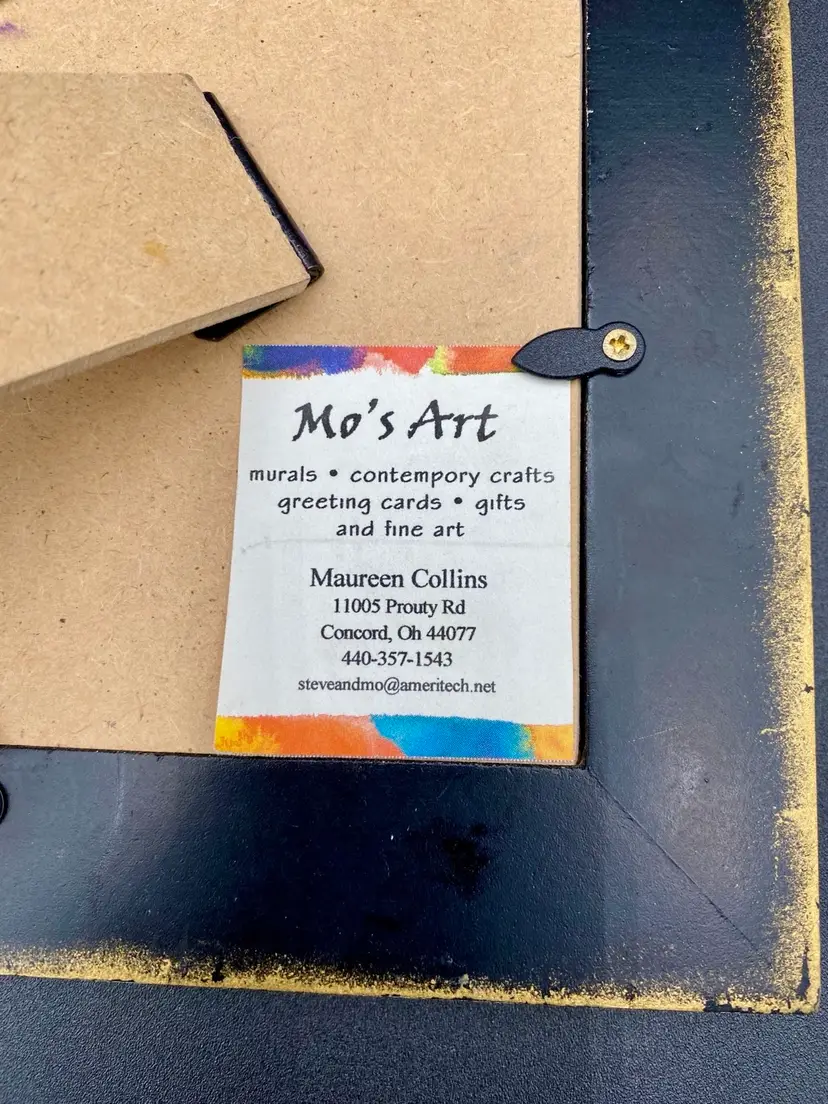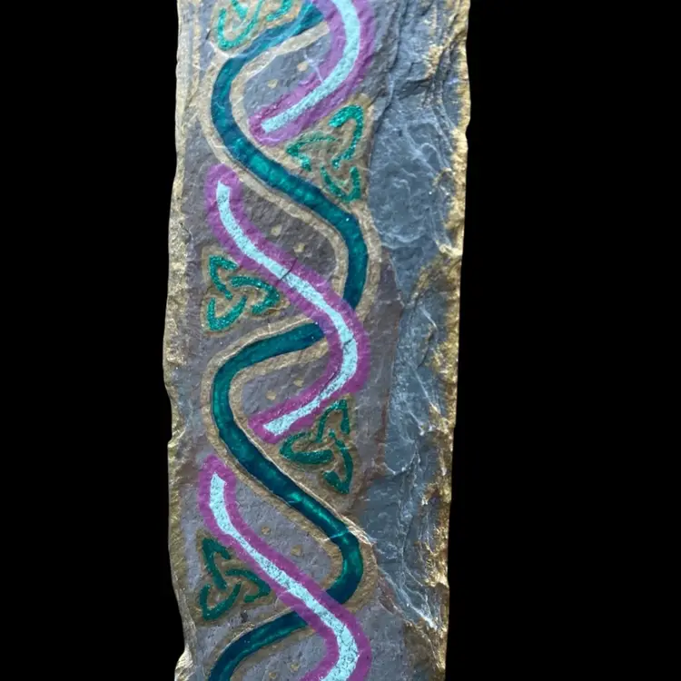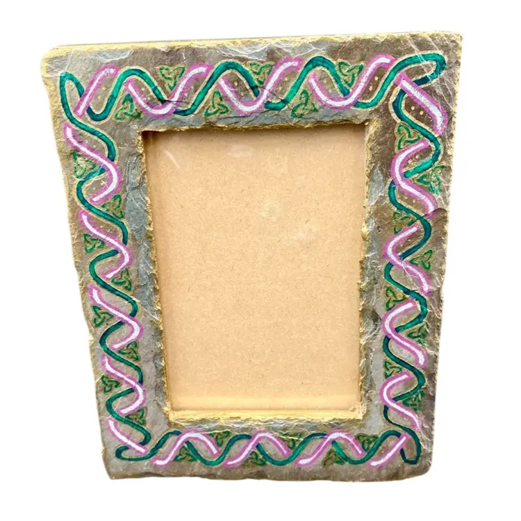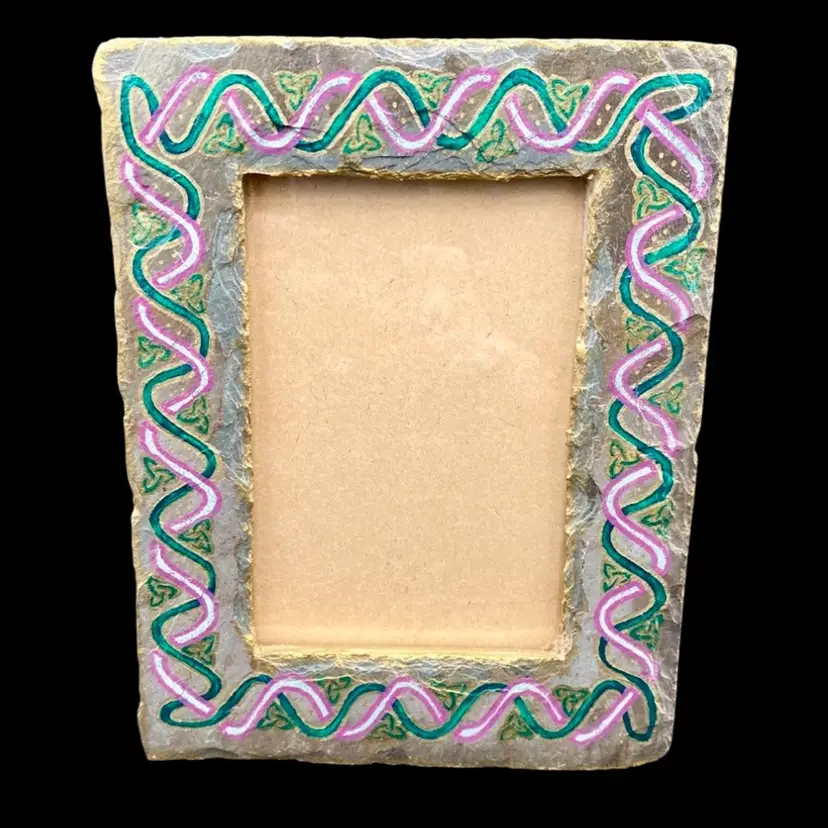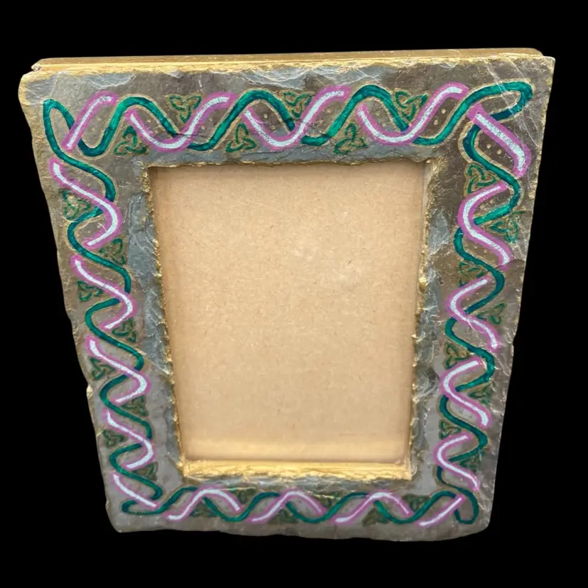 This exquisite painted slate picture frame is eye-catching. The artist, Maureen Collins of 'Mo's Art' in Ohio, has adhered a sculpted piece of slate to a traditional picture frame, decorating it with a gold paint base, then adding green and gold Celtic triquetras set among an intertwining green & gold and pink & light gray weave.