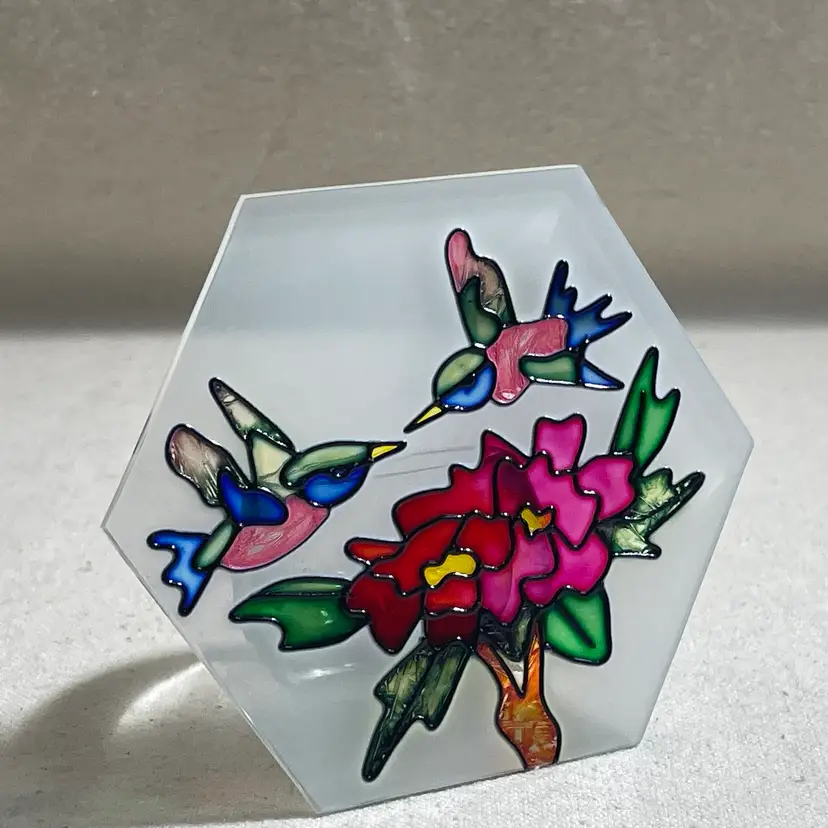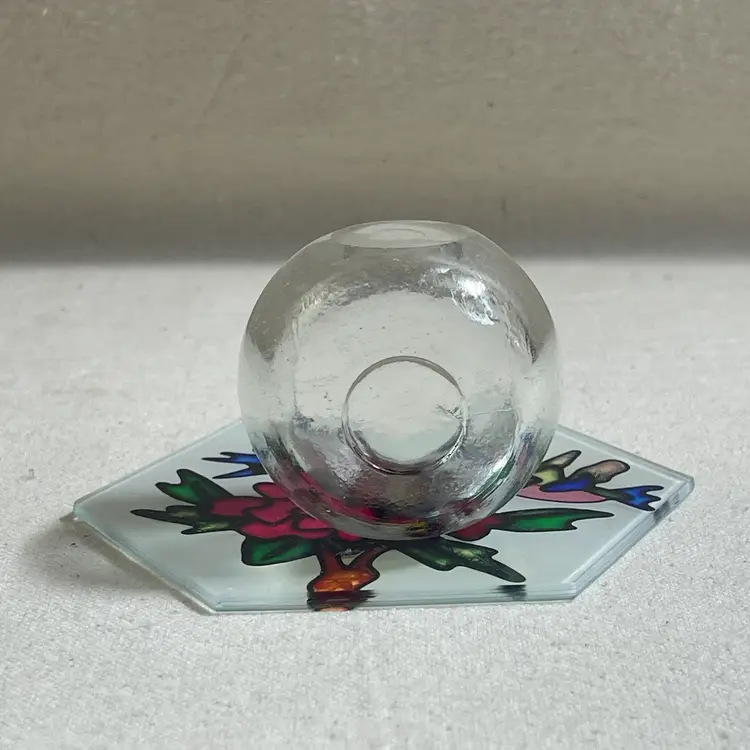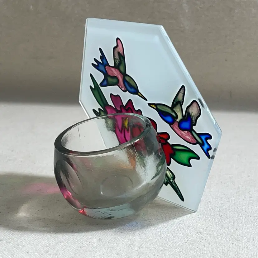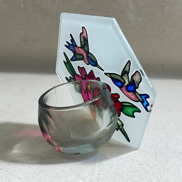 Add a touch of elegance to your home decor with this beautiful painted glass votive candle holder featuring a stunning hummingbird design. Crafted in China, this holder is perfect for votive candles and will create a warm and inviting ambiance in any room. The stained glass look adds a unique touch to your decor