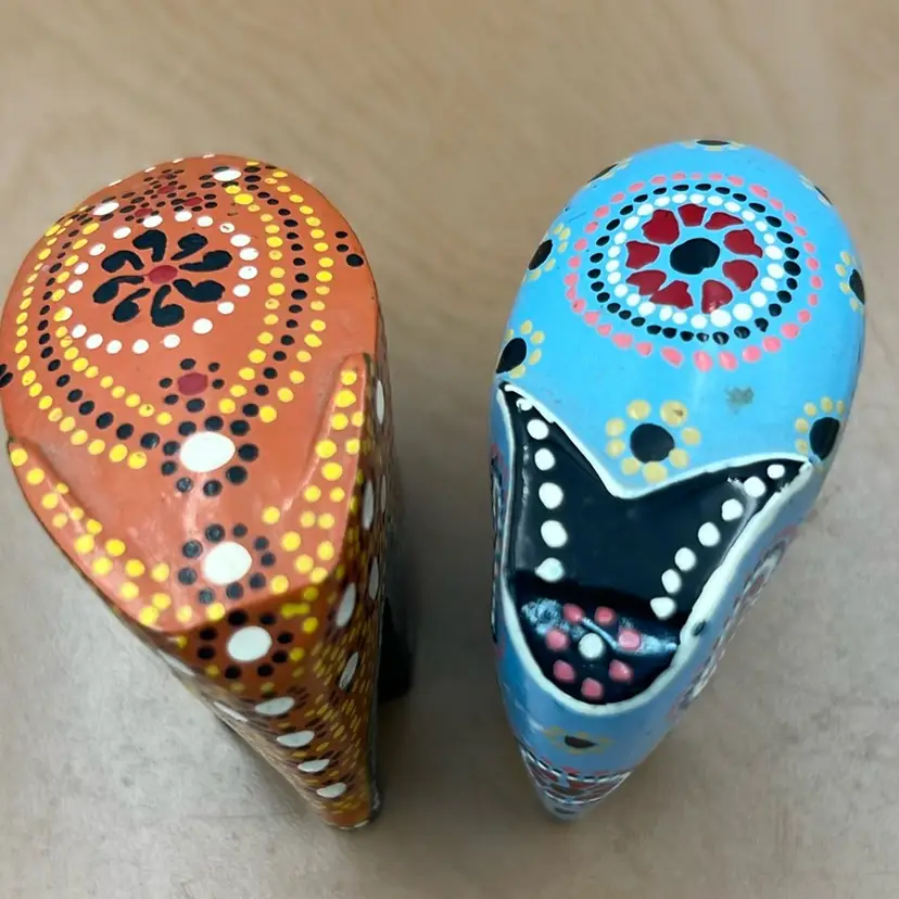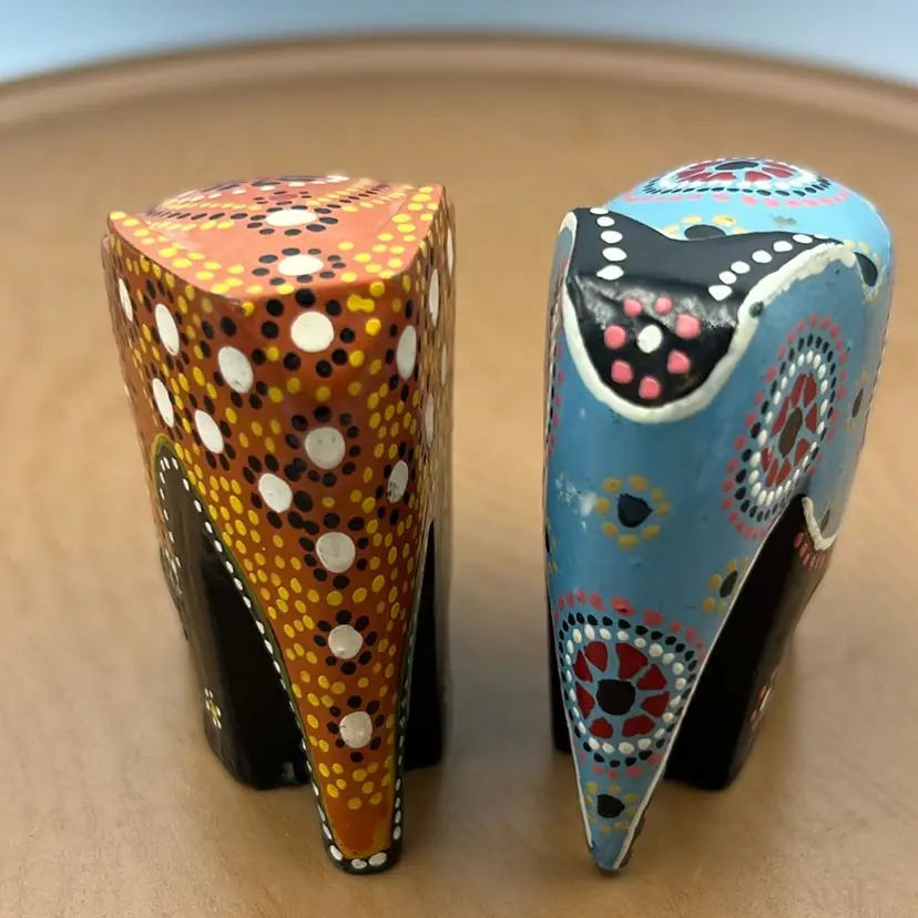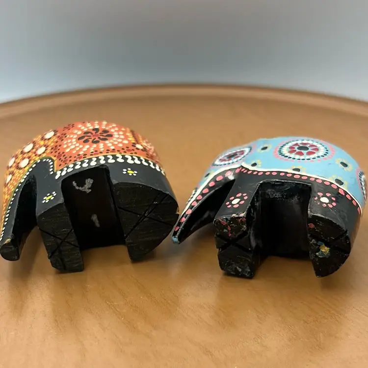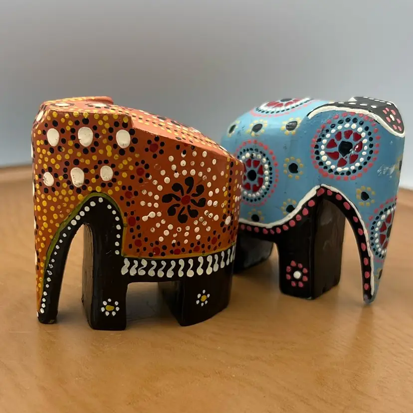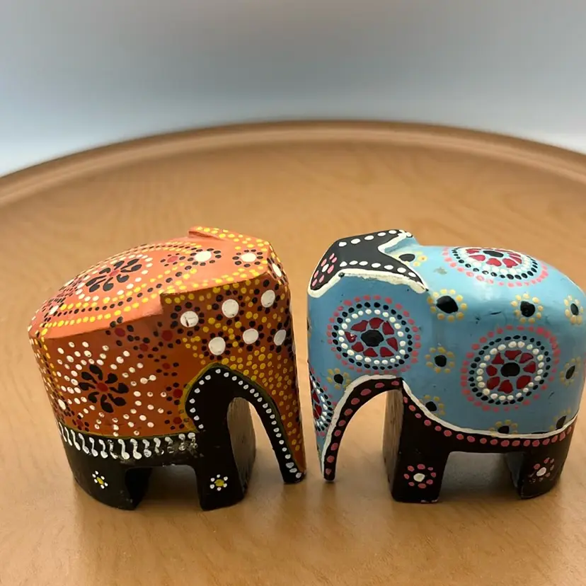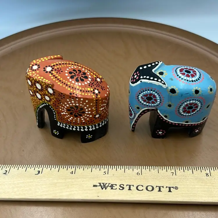 Folk Art Painted blue and orange with colorful design. A happy, fun pair of elephant figurines!