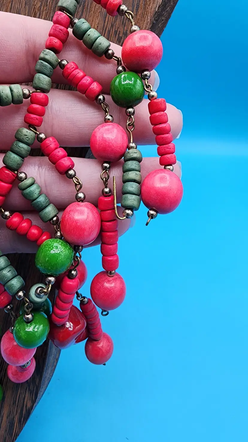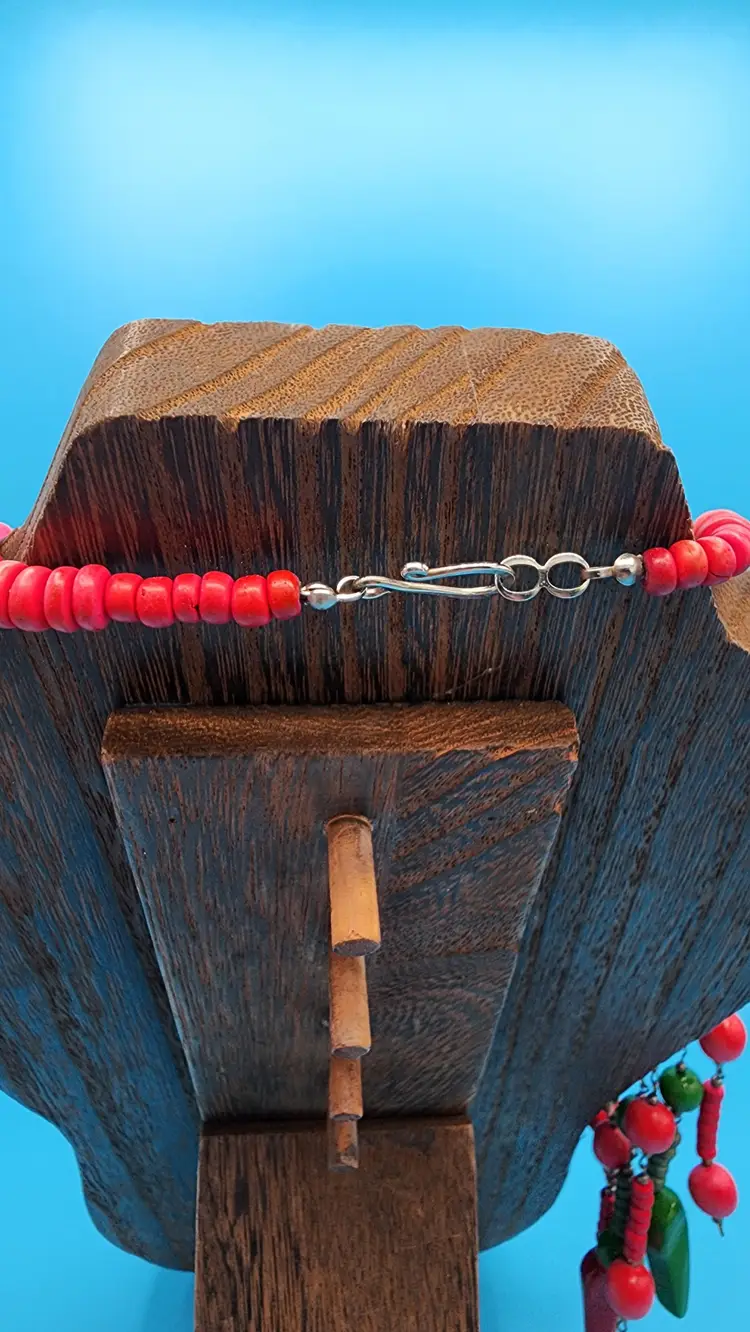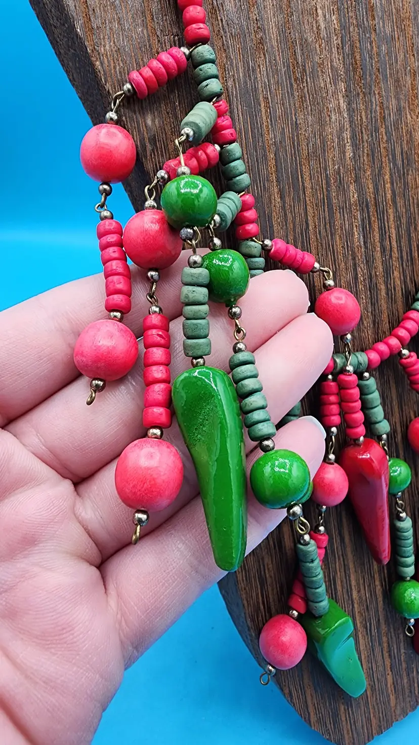 This necklace kind of reminds me of peppers. It's in good condition other than on one side there is one green pepper missing. Please see photos. Barely noticeable when worn.