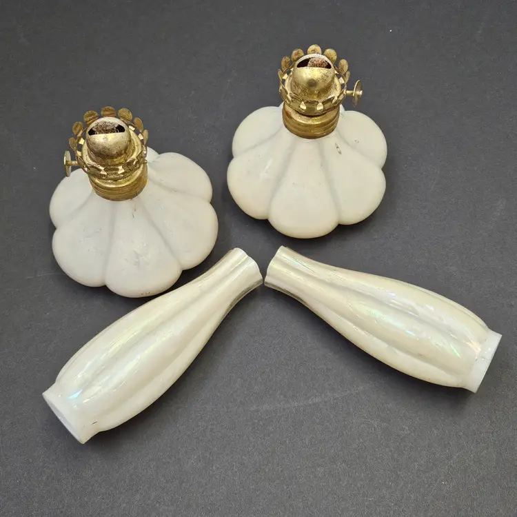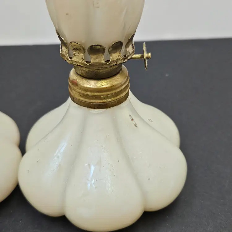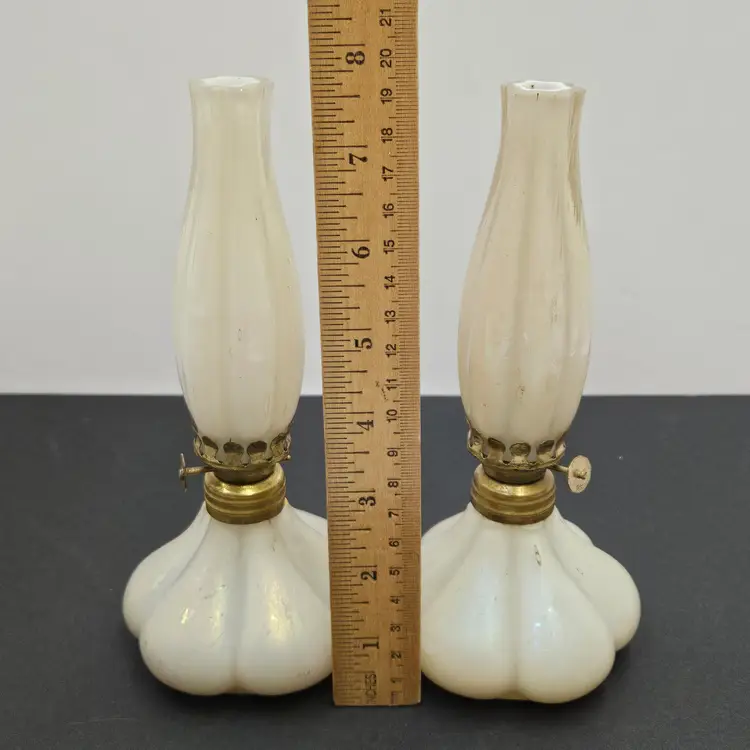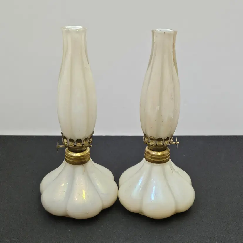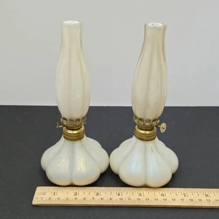 Pair miniature oil lamps, each are 7.5"x3.5", no chips or cracks, old glass.