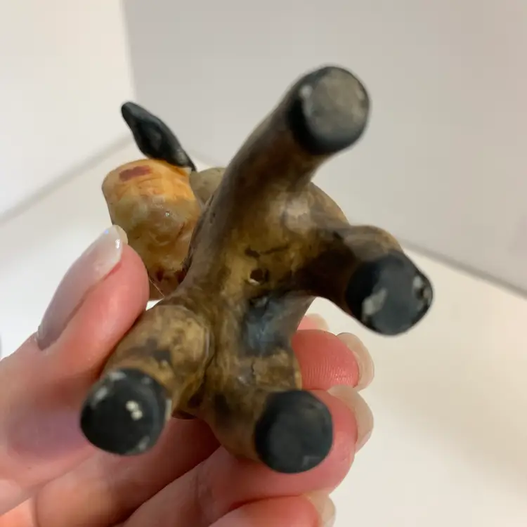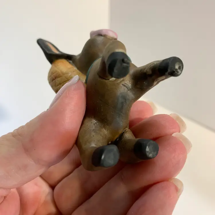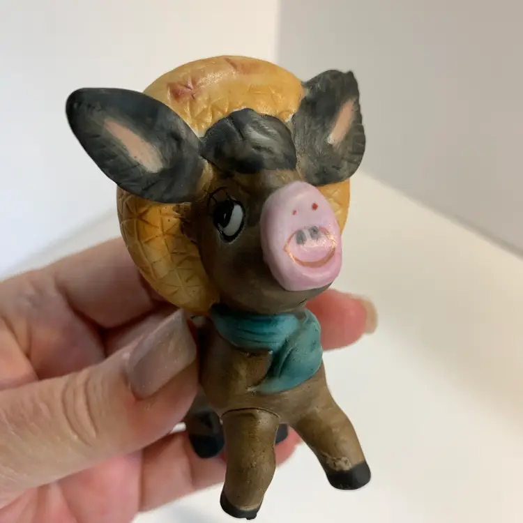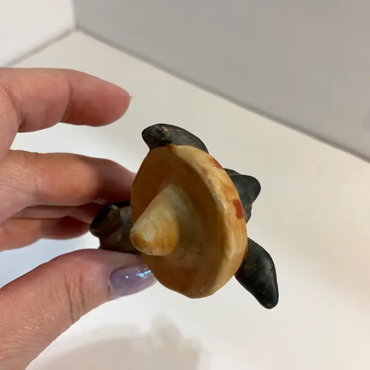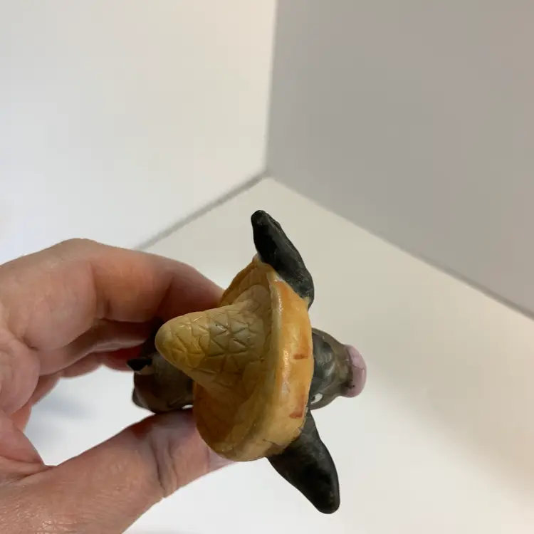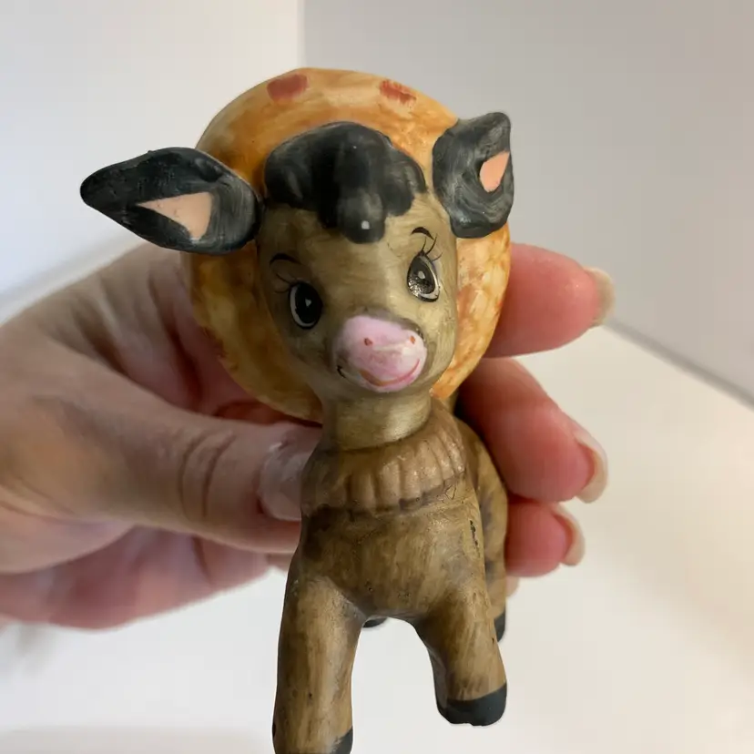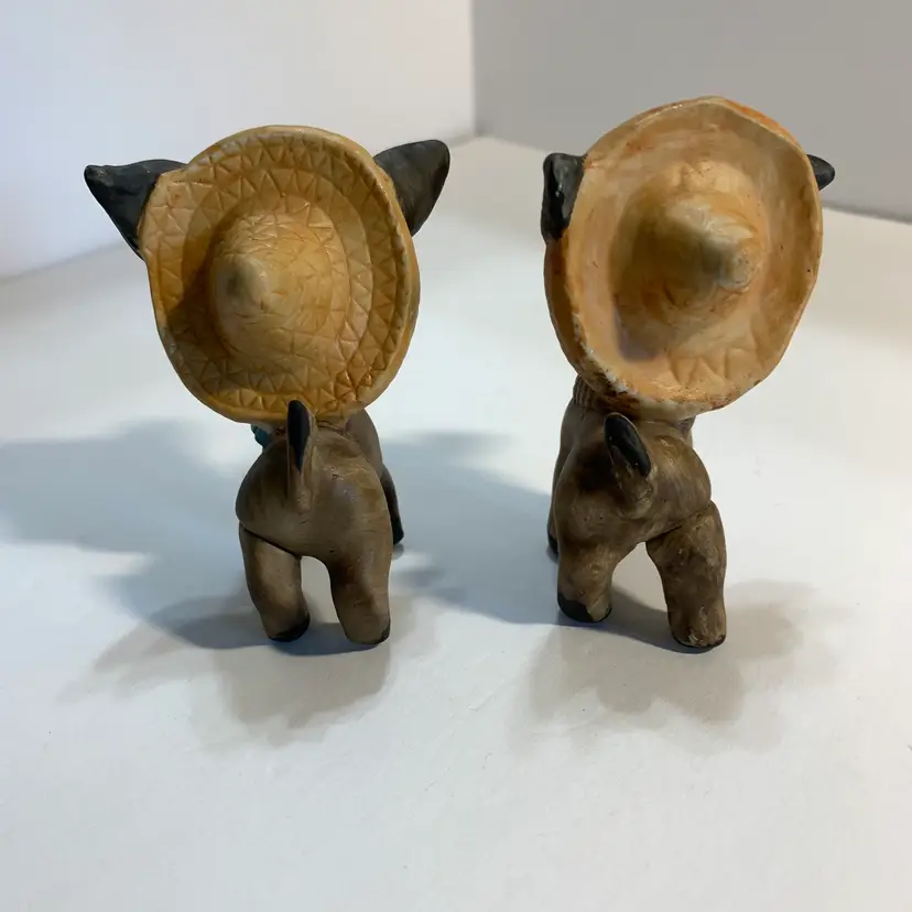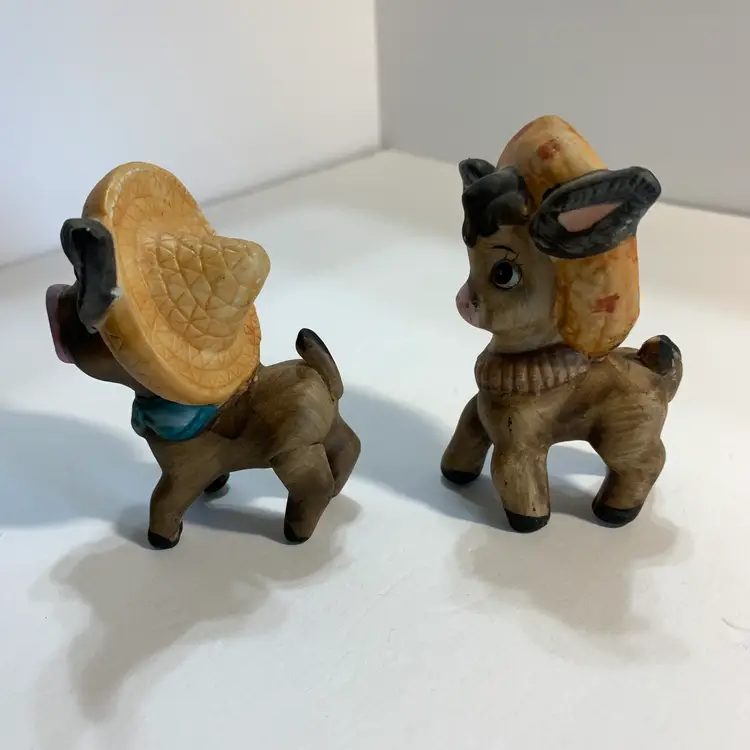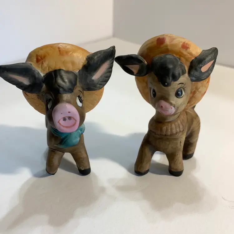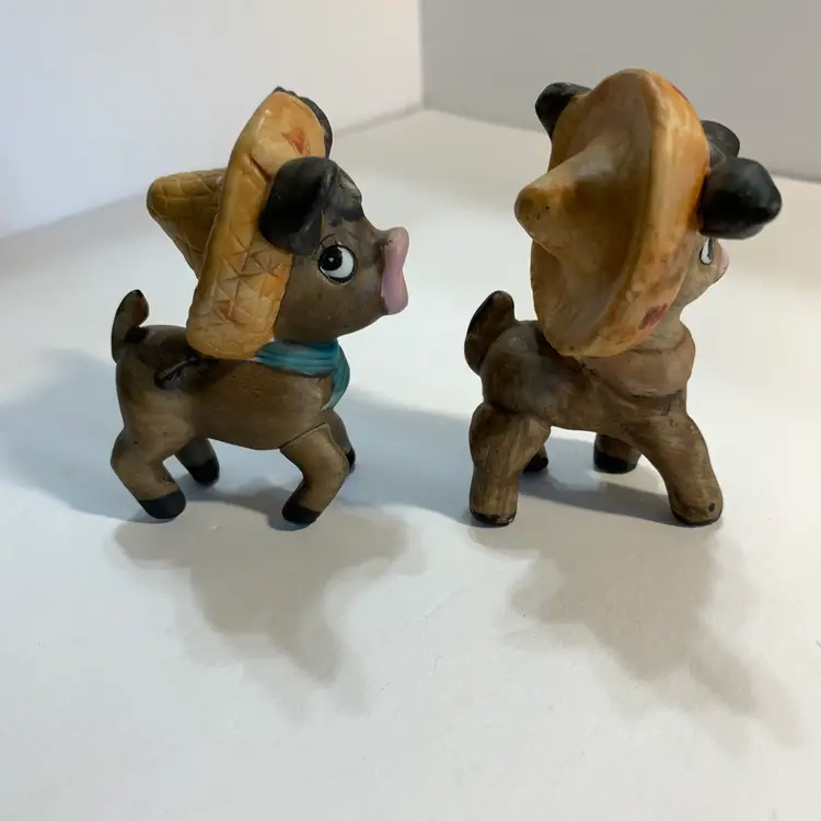 Super duper cute!! No chips or cracks. The one on the left measures 2 1/4 inches across, 2 1/4 inches wide and 3 inches tall. The one on the right measures 1 3/4 inches across, 2 1/8 inches wide and 3 1/4 inches tall. Weighs 4 ounces.