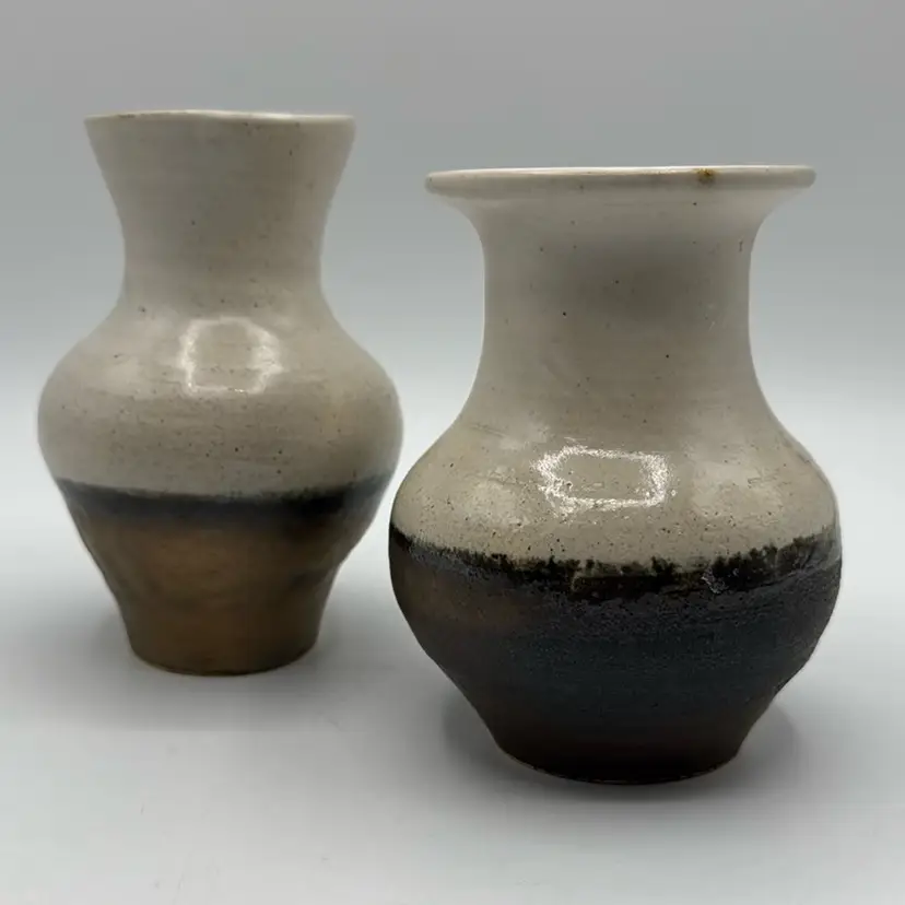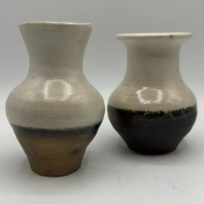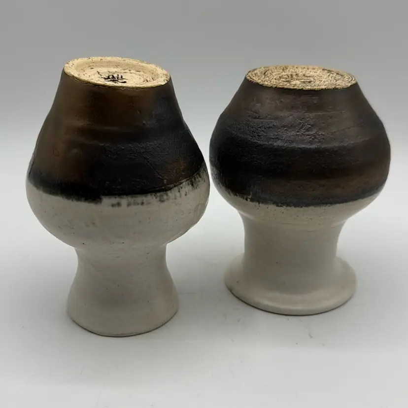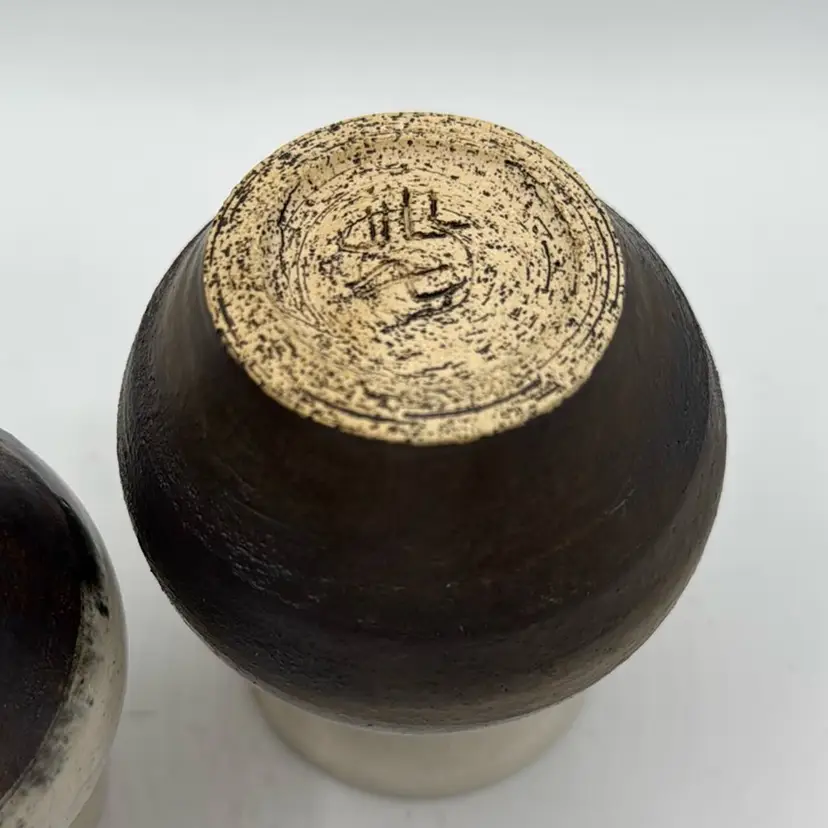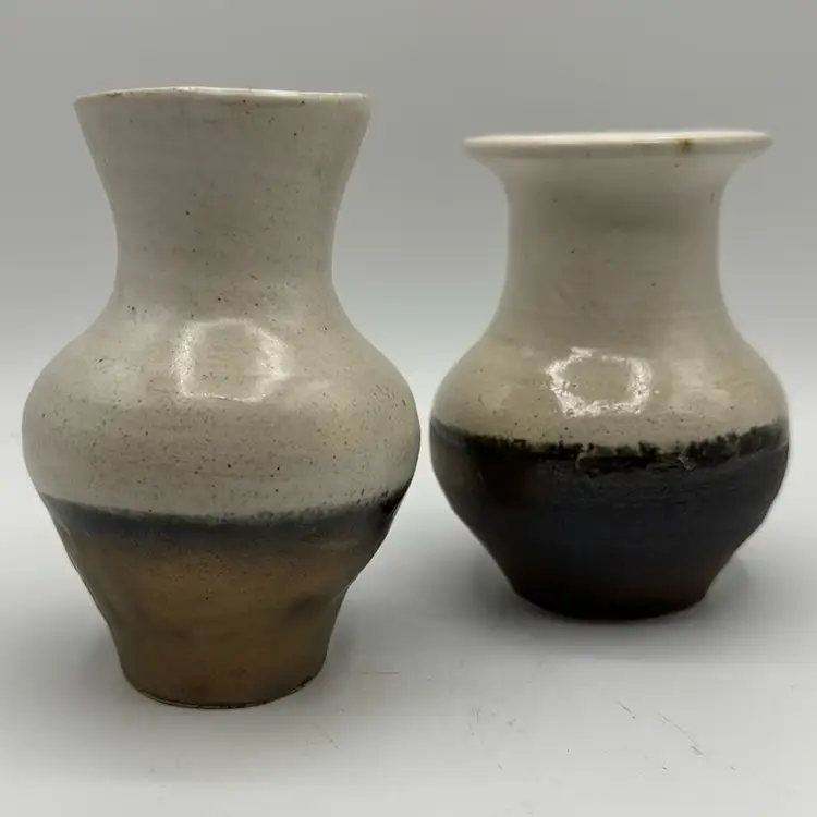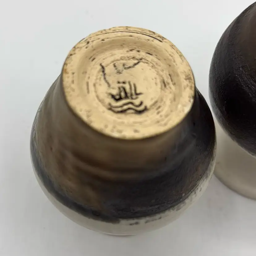 Taller 5” and shorter is 4 1/2” excellent condition. Glaze is rough and color is extraordinary!!