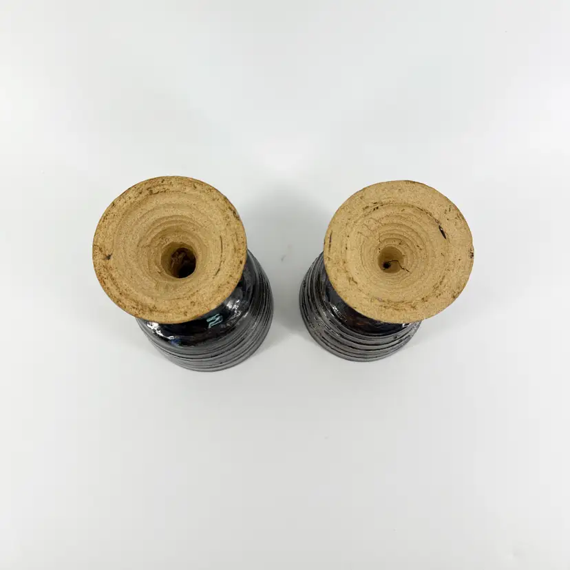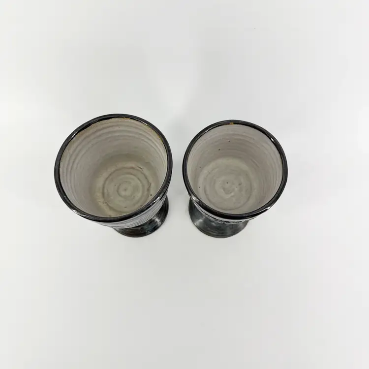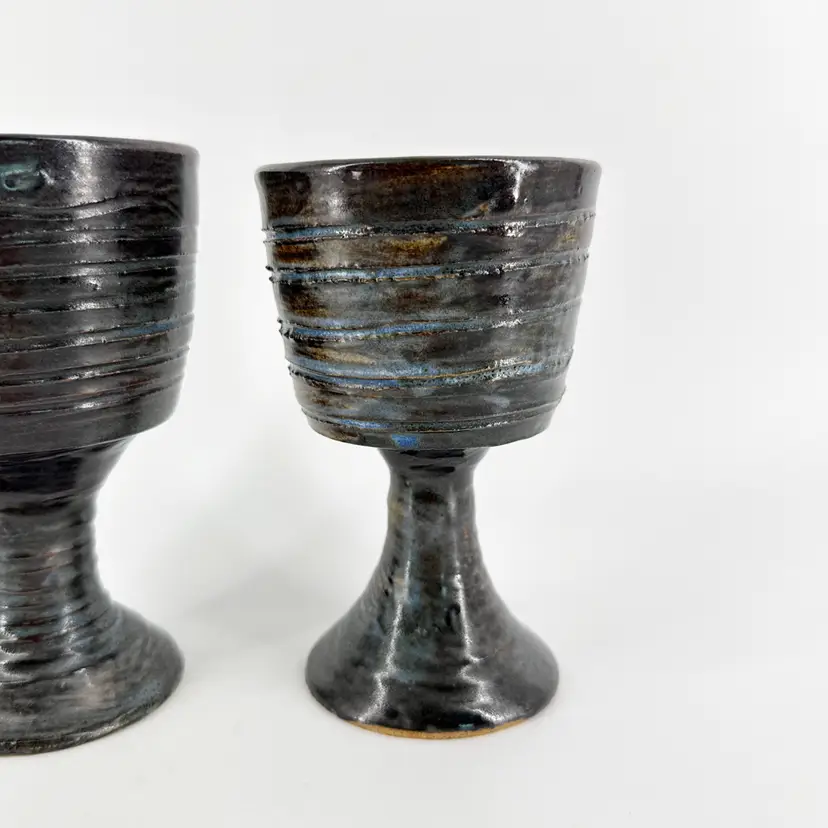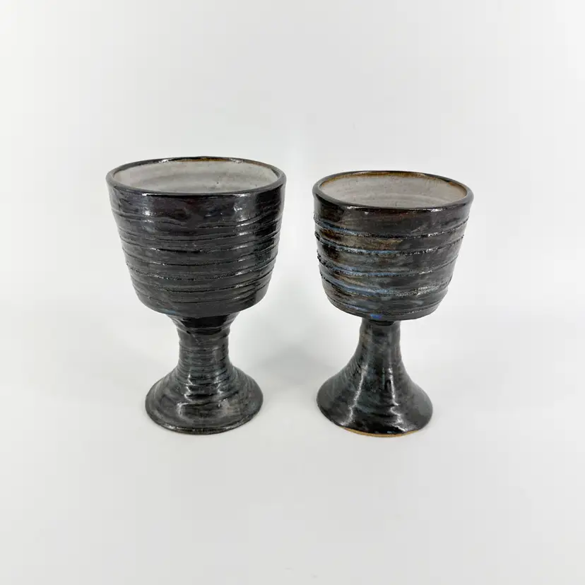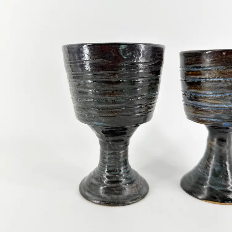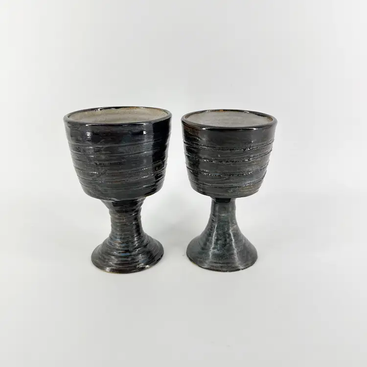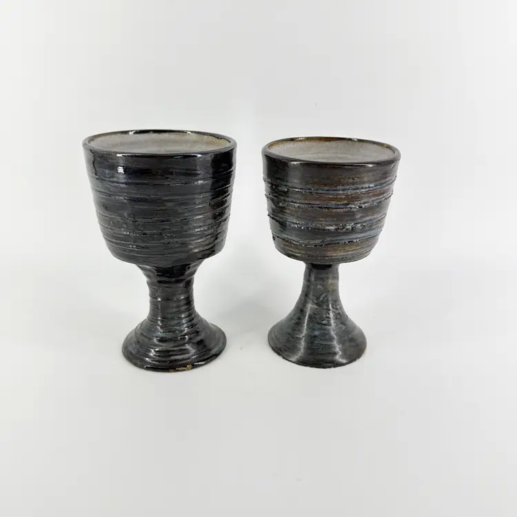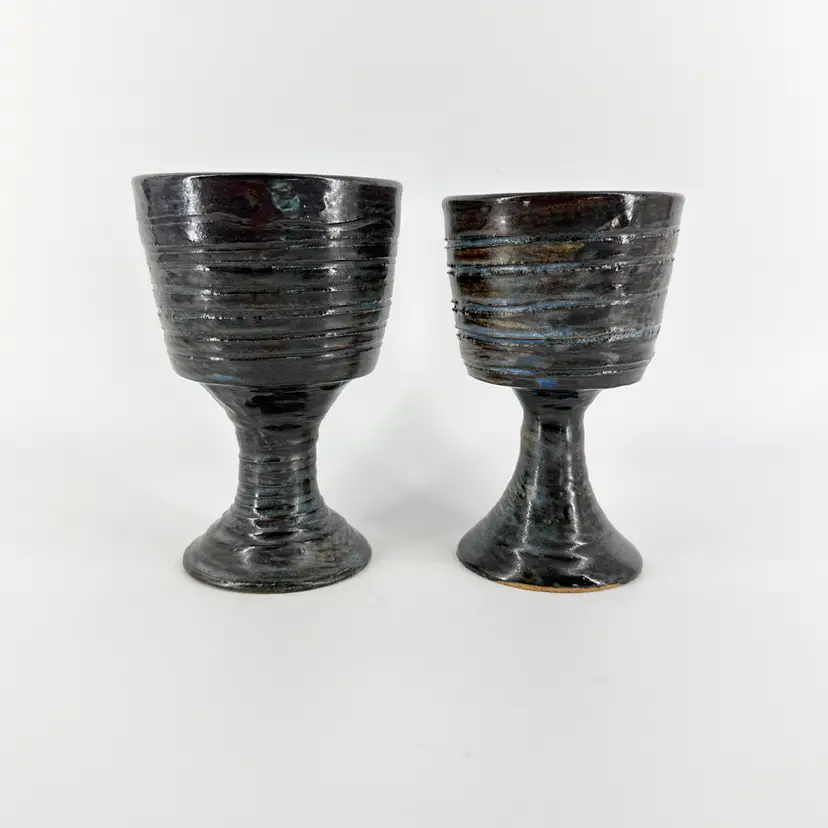 They are 5.5" and 5.25" tall, measure 3.5" in diameter and have an 8.5oz capacity. They are in excellent condition., There are no breaks, chips or repairs. The bottom of one goblet has a manufacturing defect but it does not affect the integrity of the goblet. (See photos).
