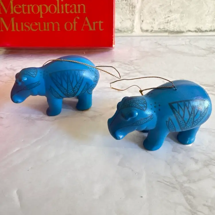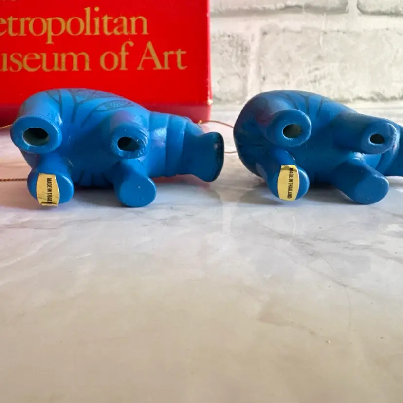 This adorable pair of Metropolitan Museum of Art blue “William the Hippo” ornaments faithfully recreates the iconic ancient Egyptian faience hippo mascot, with beautiful etched lotus and marsh motifs on vibrant turquoise bodies. Complete with gold hanging cords and the original red gift box with gold Met logo and black velvet insert. In excellent condition—no chips, cracks, or wear. Perfect for collectors, Egyptology fans, or whimsical holiday decor! From a smoke-free home.
