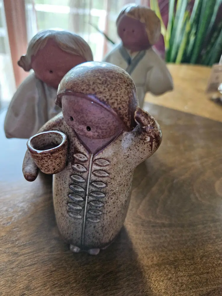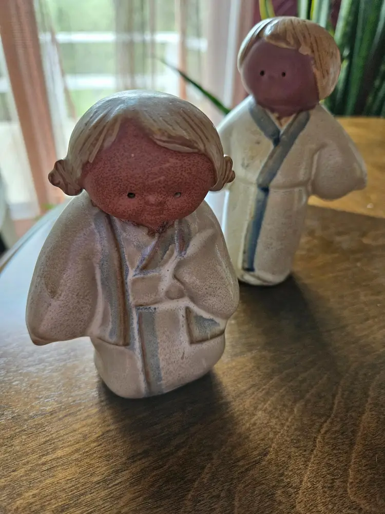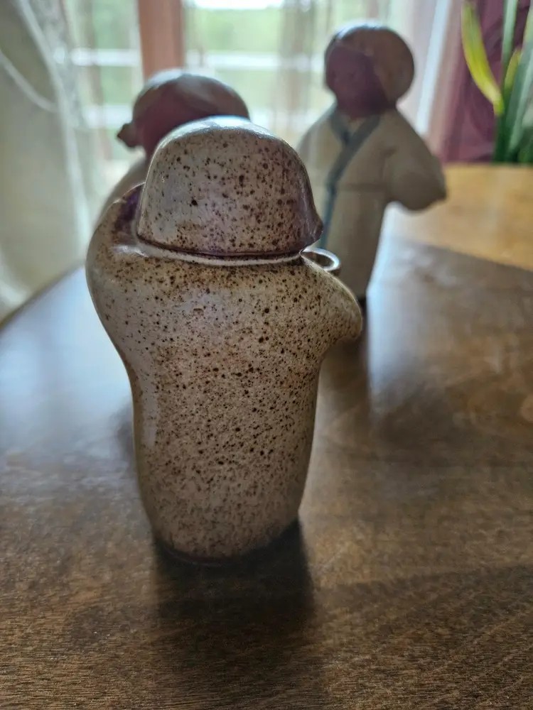 Dressed in traditional KIMONOS. Made of matte red clay bodies with speckled white and brown glazed. I will be adding a friend as seen in pictures. Their in excellent vintage condition. Measure 5.5" and 4.5" tall and 3 " wide. Questions please ask. Thank you.
